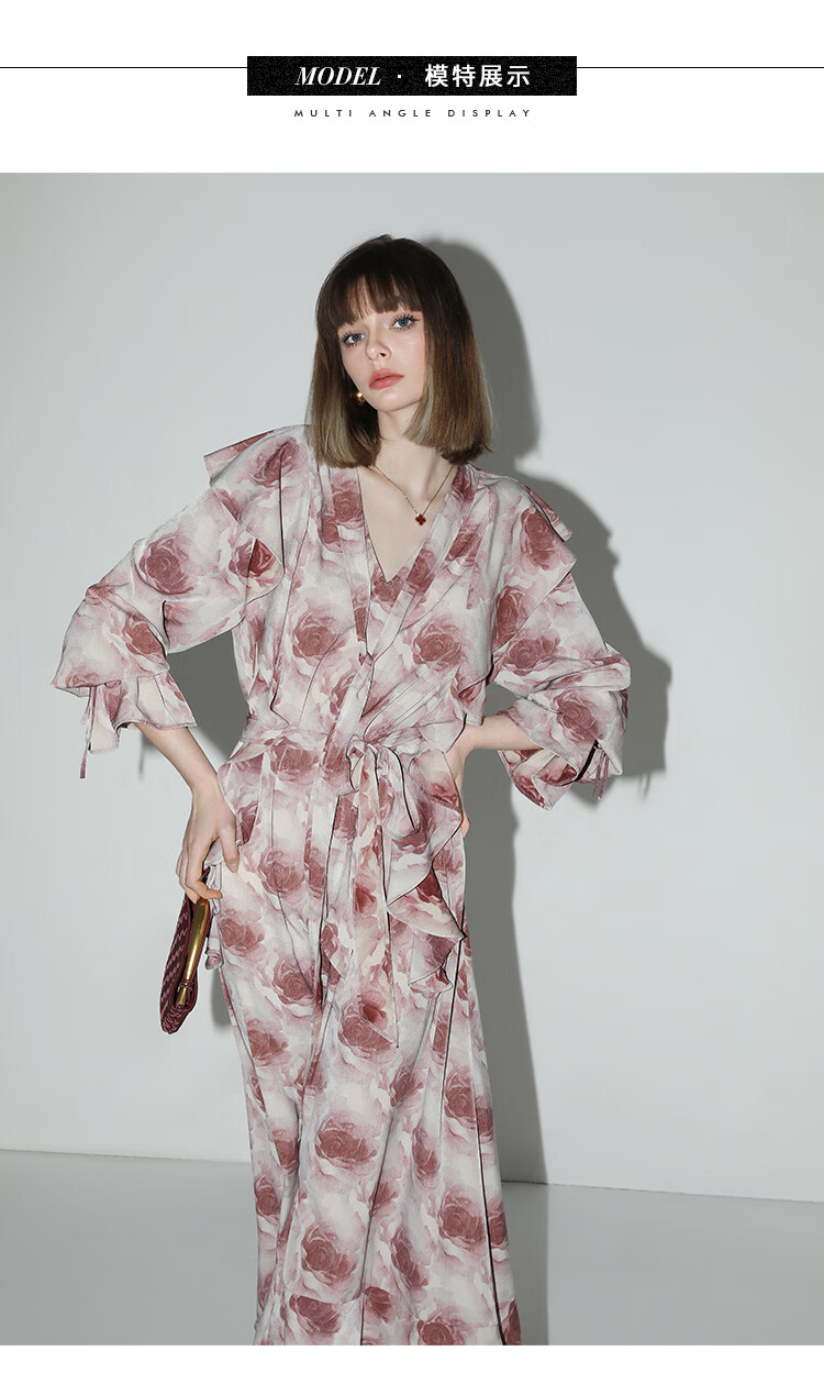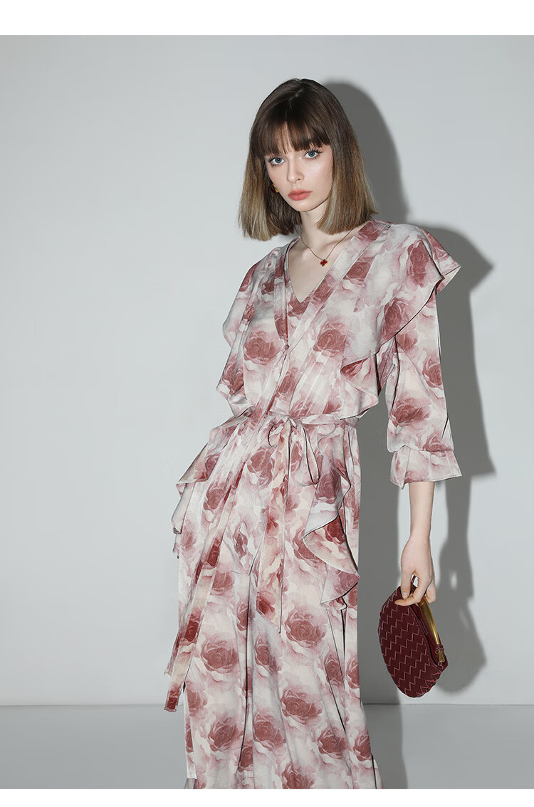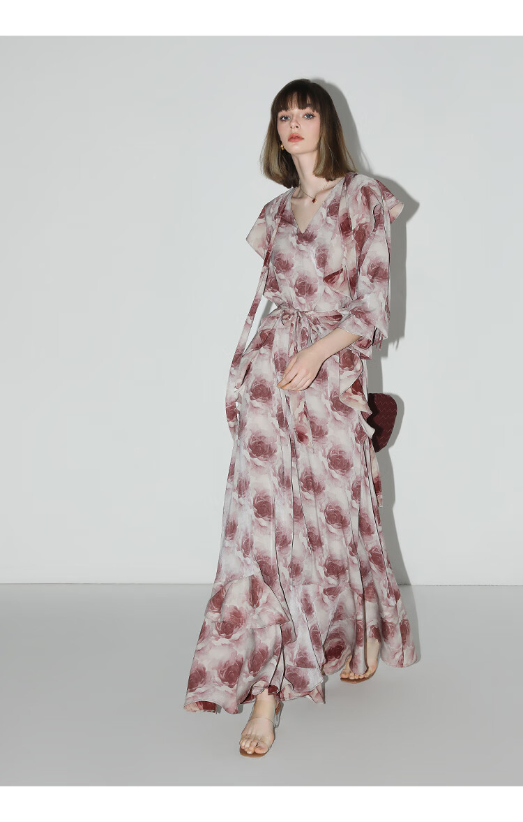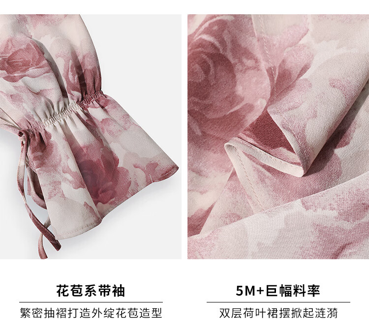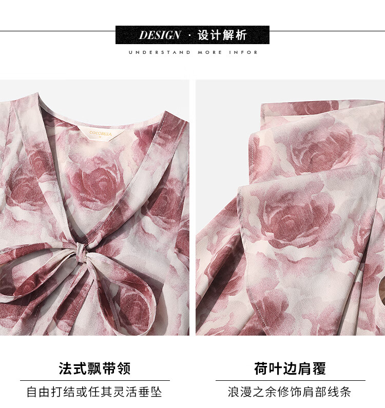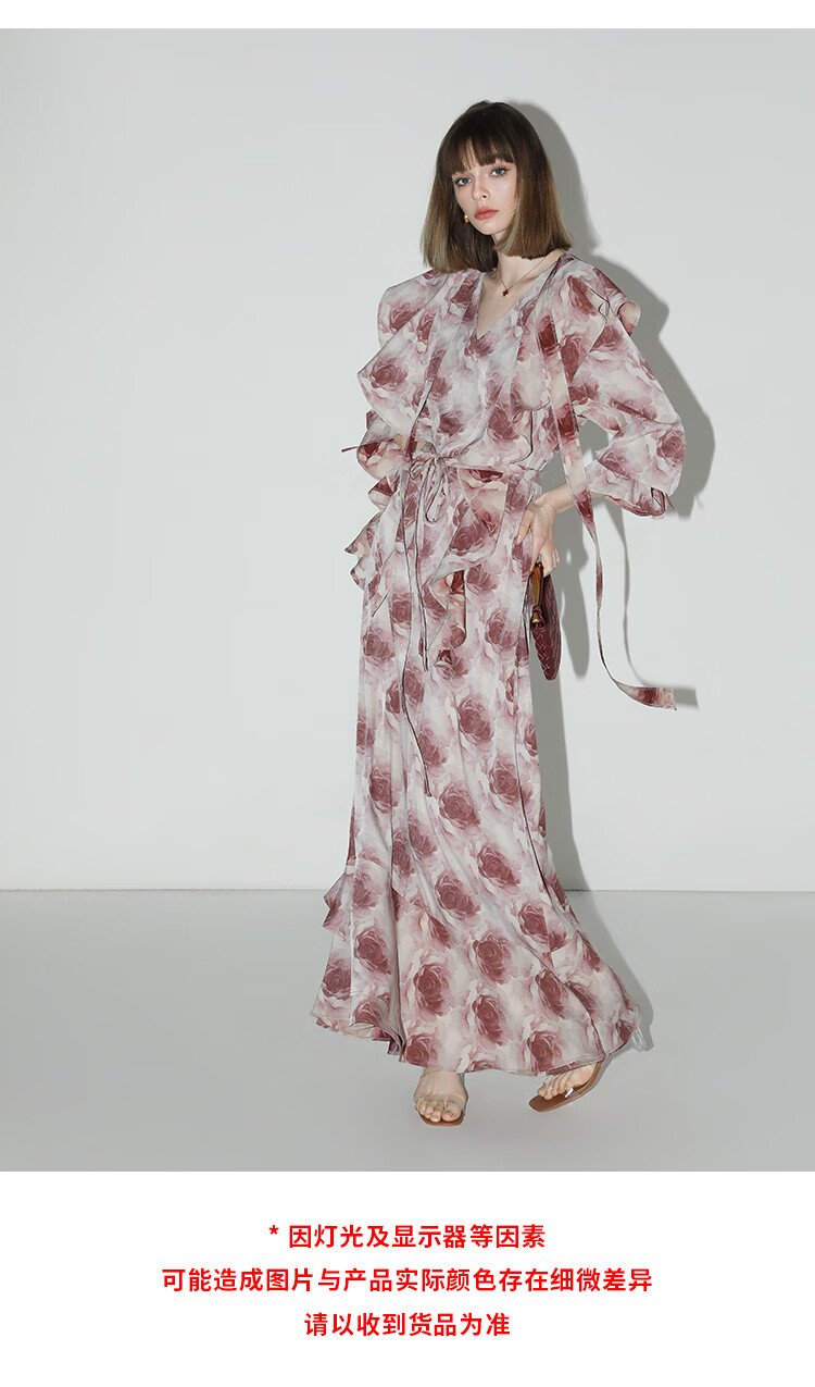 【限时秒杀】COCOBELLA[4米+用料]晕染玫瑰荷叶边大摆OL飘带连衣裙FR3037
