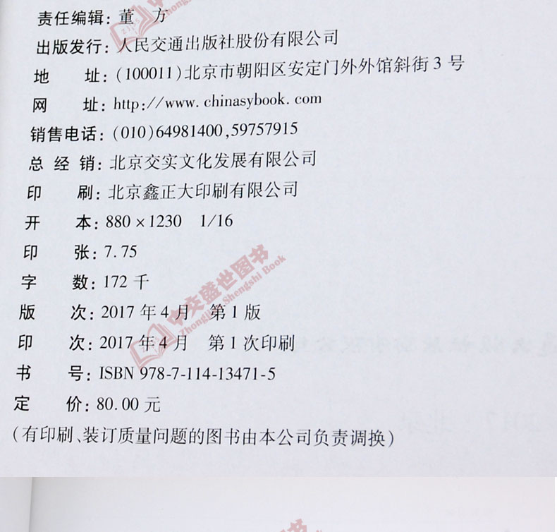 - 北京中交盛世图书专营店是人民交通出版社股份有限公司下属自营店铺,具备图书批发零售综合资质,主要经营本版及外版道路工程、桥梁隧道、铁道工程、水利电力、航运海事类专业图书及相关技术规范,竭诚为广大读者提供一站式图书采购服务。