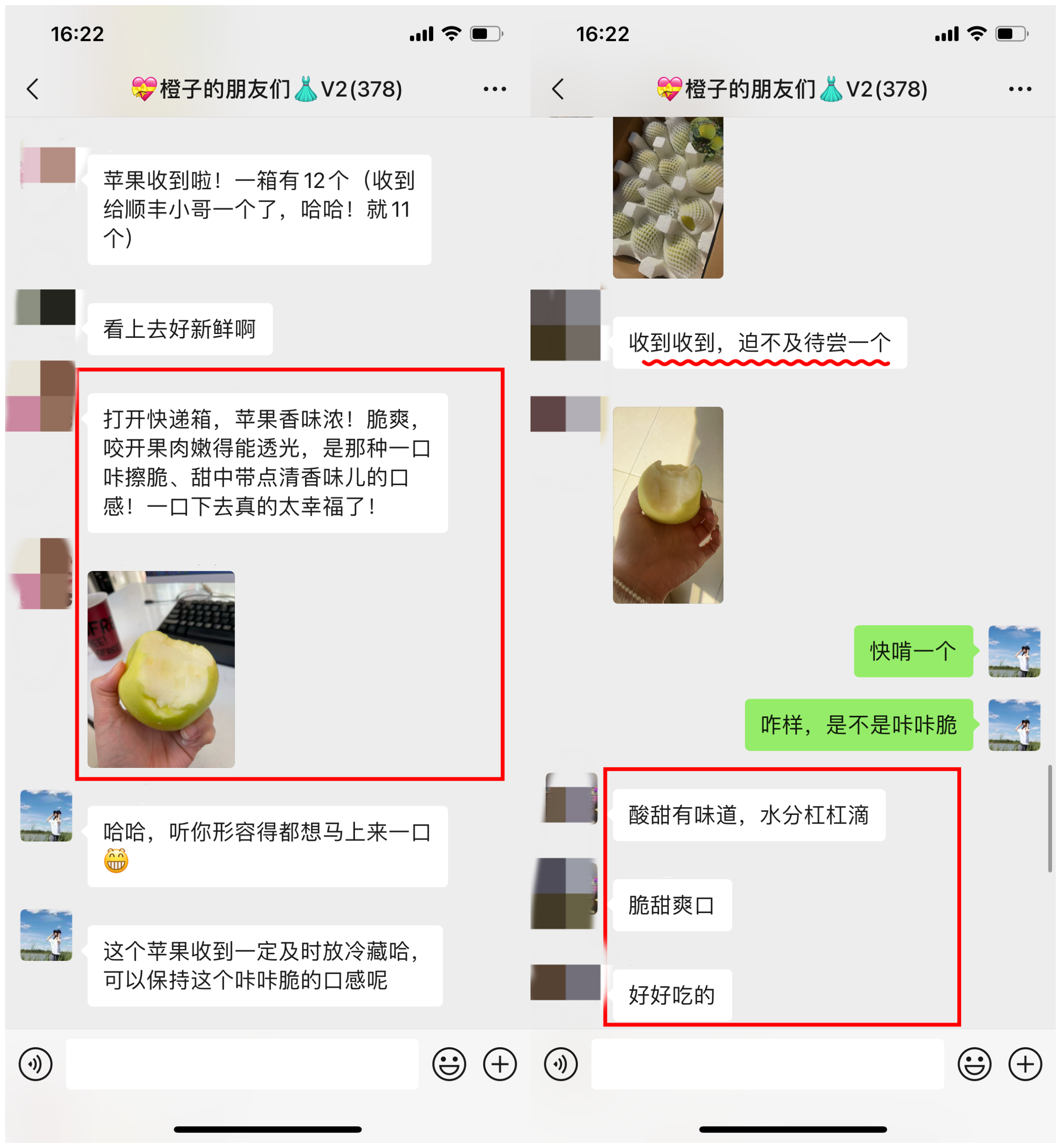 朋友给我推荐的这个苹果真不赖,一口下去,脆甜脆甜的,还能吃到花香味。就抓紧给朋友群内的朋友安排了品鉴
