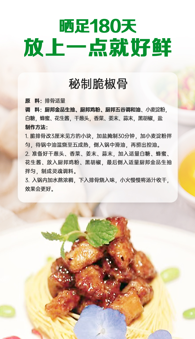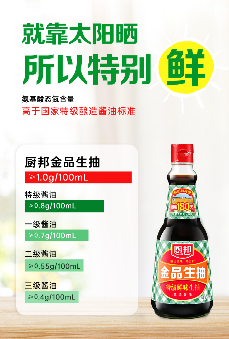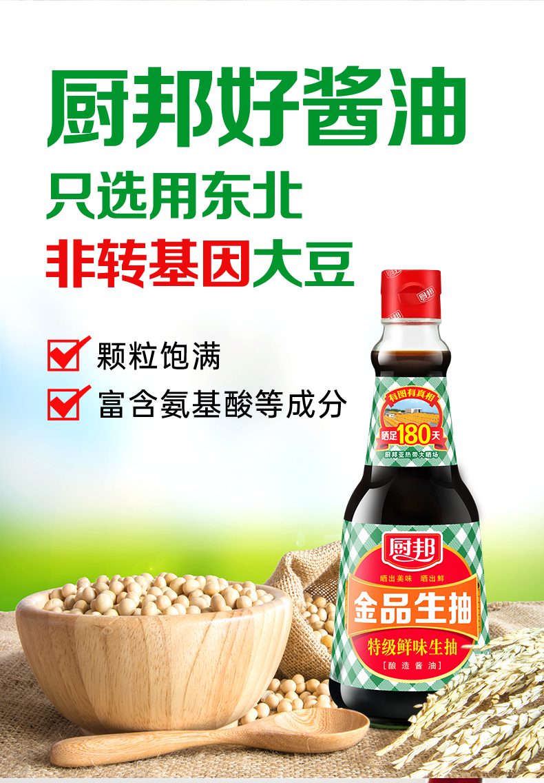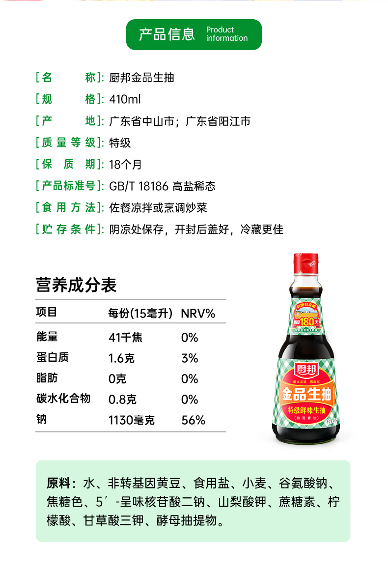 厨邦金品生抽410ml 特级酿造酱油烹调炒菜蒸鱼调味品凉拌调料家用LY