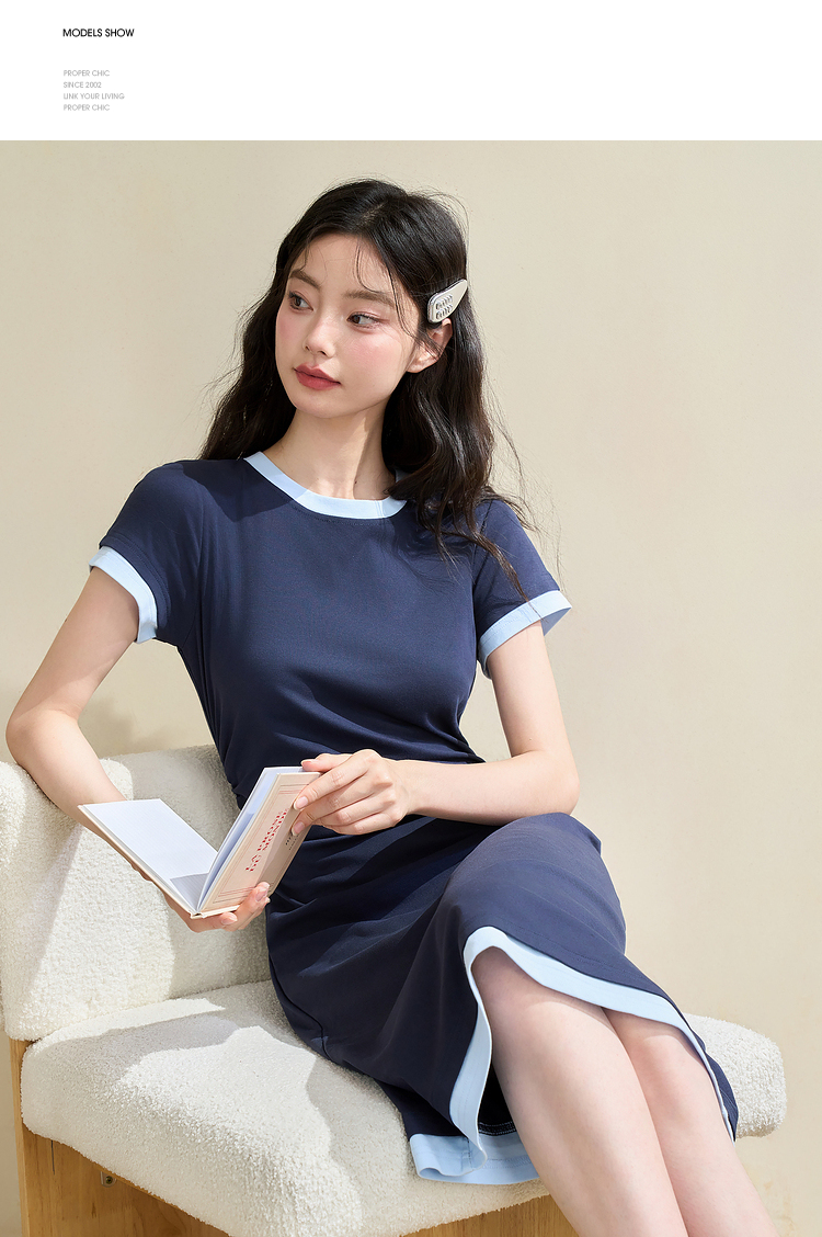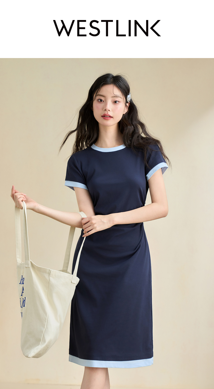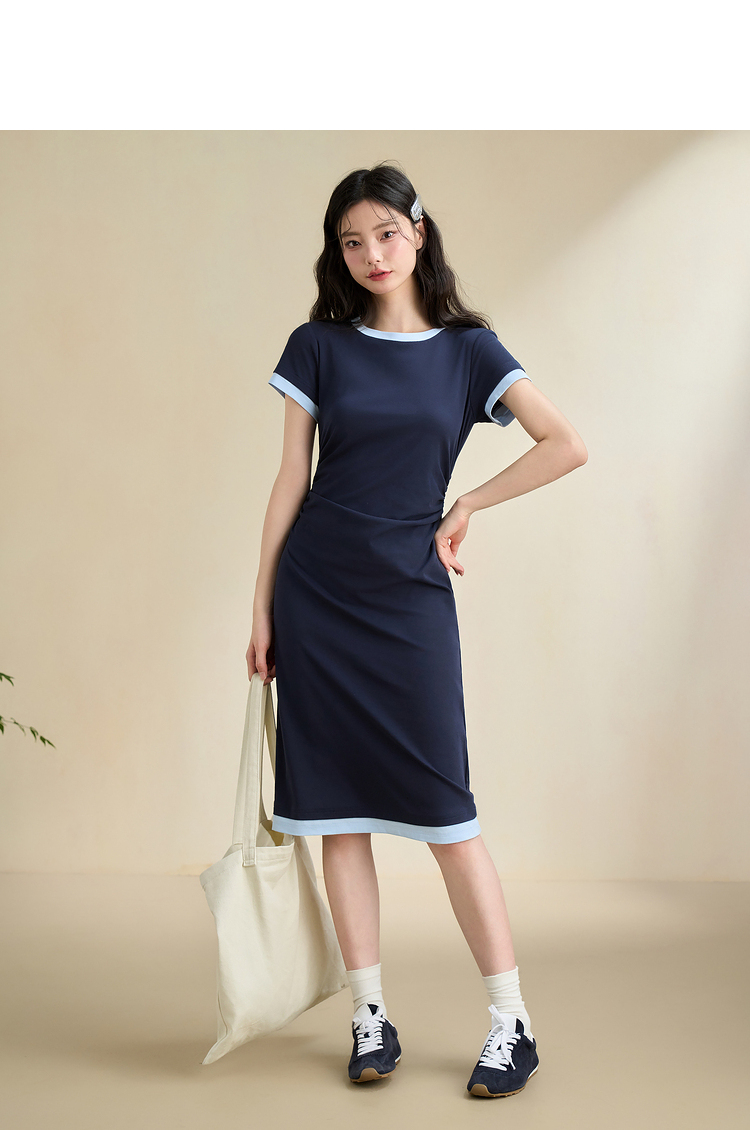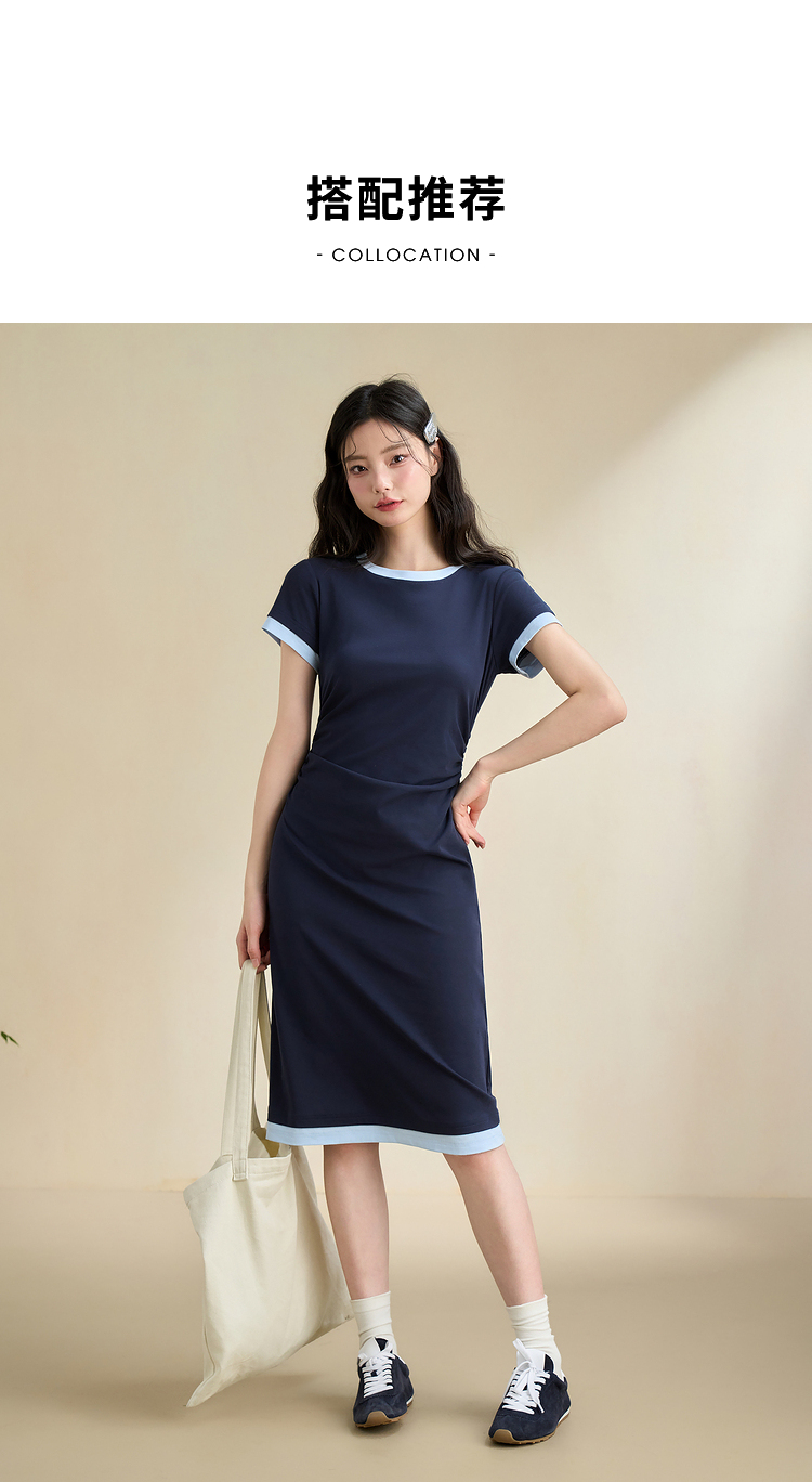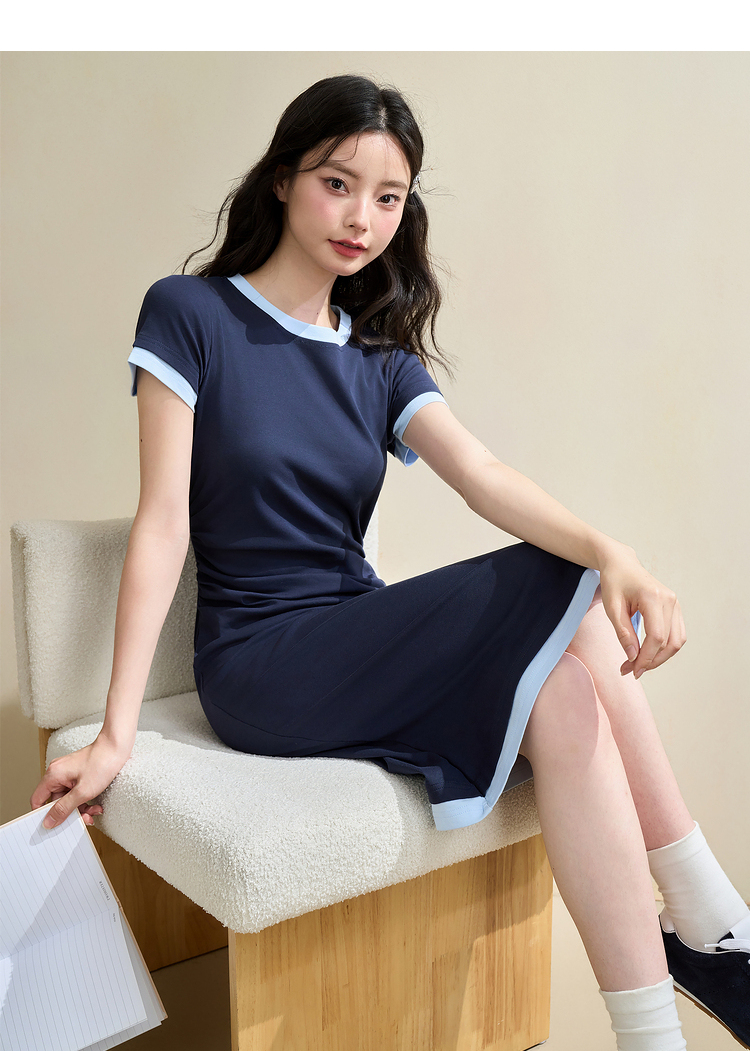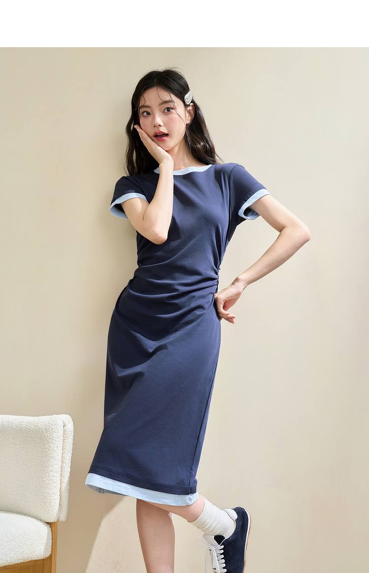 甜美休闲拼接撞色假两件连衣裙女缩褶收腰连衣裙V2742124