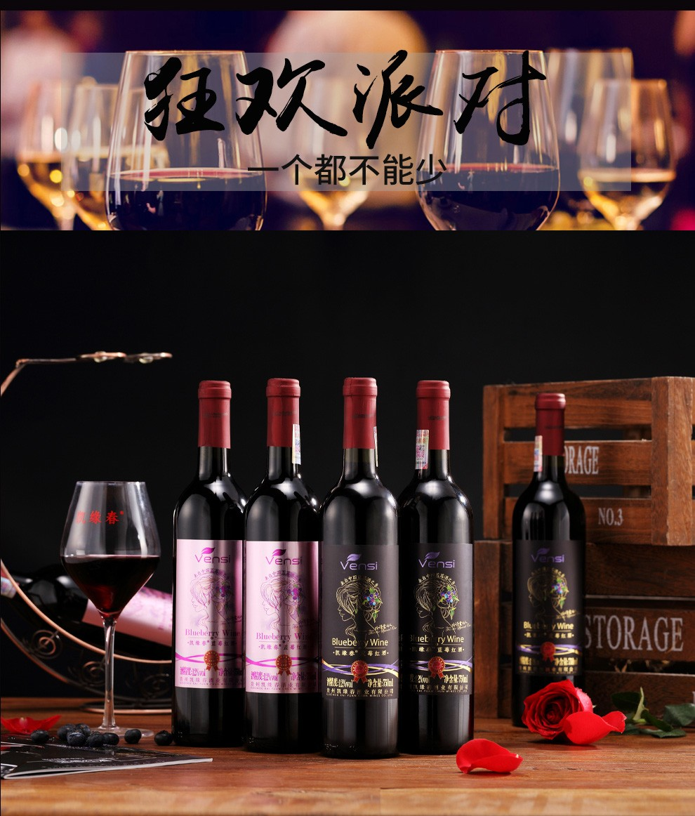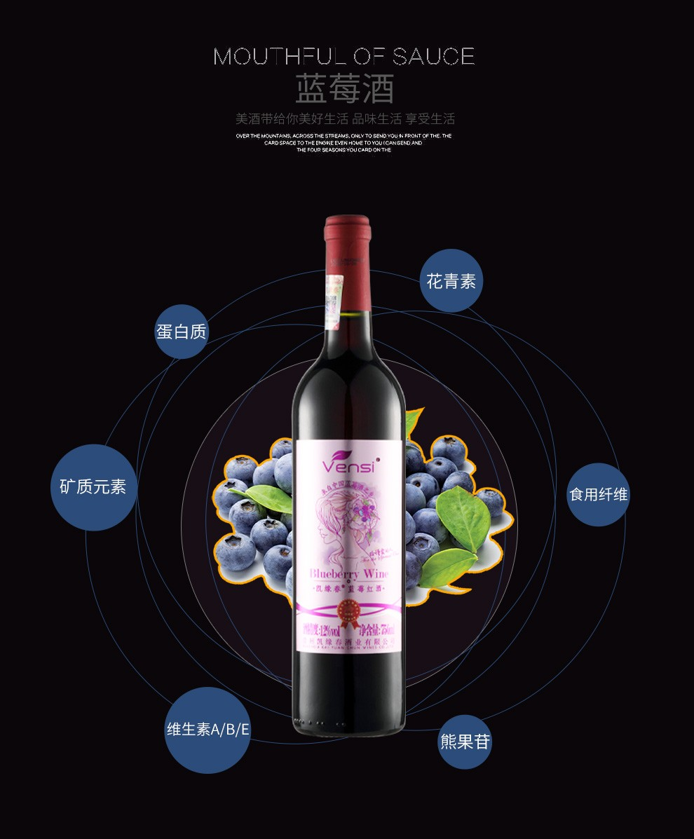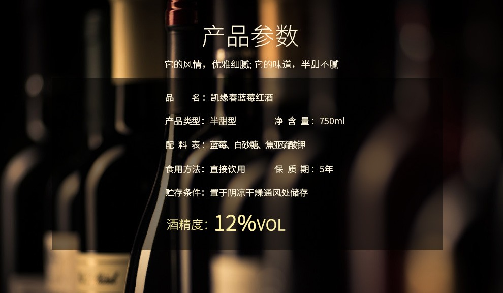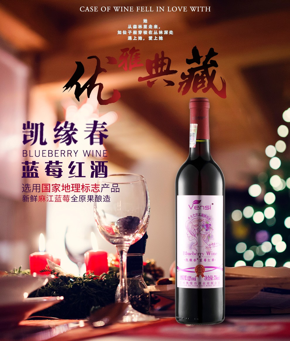 【直发】凯缘春蓝莓红酒粉标恒低温蓝莓原果发酵12度半甜型果酒750ml/瓶(带木箱礼盒)