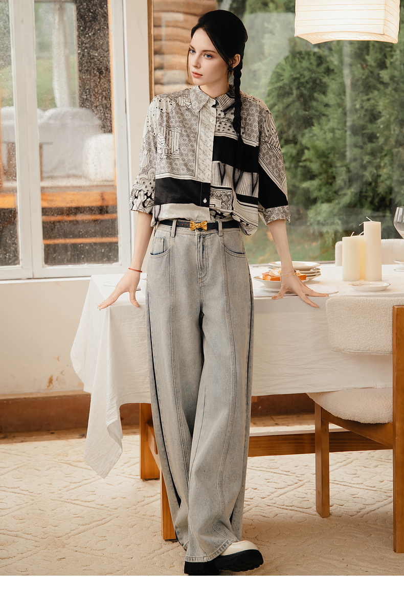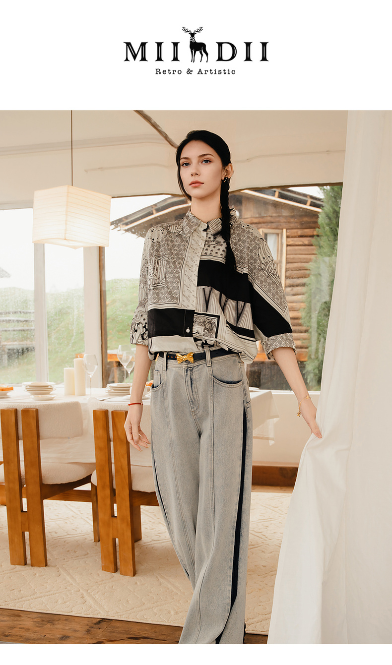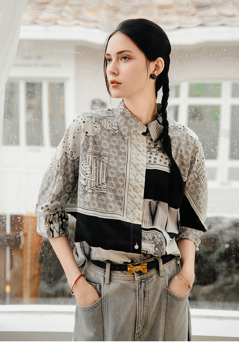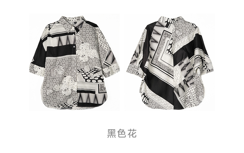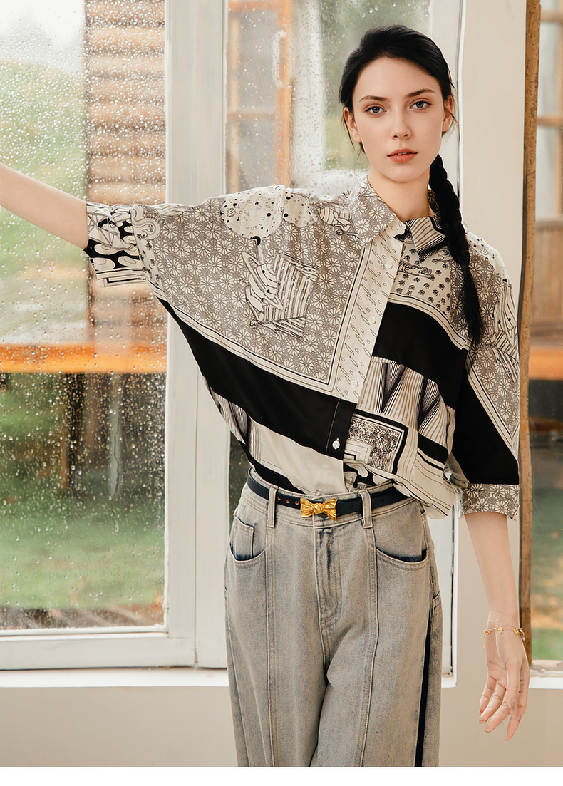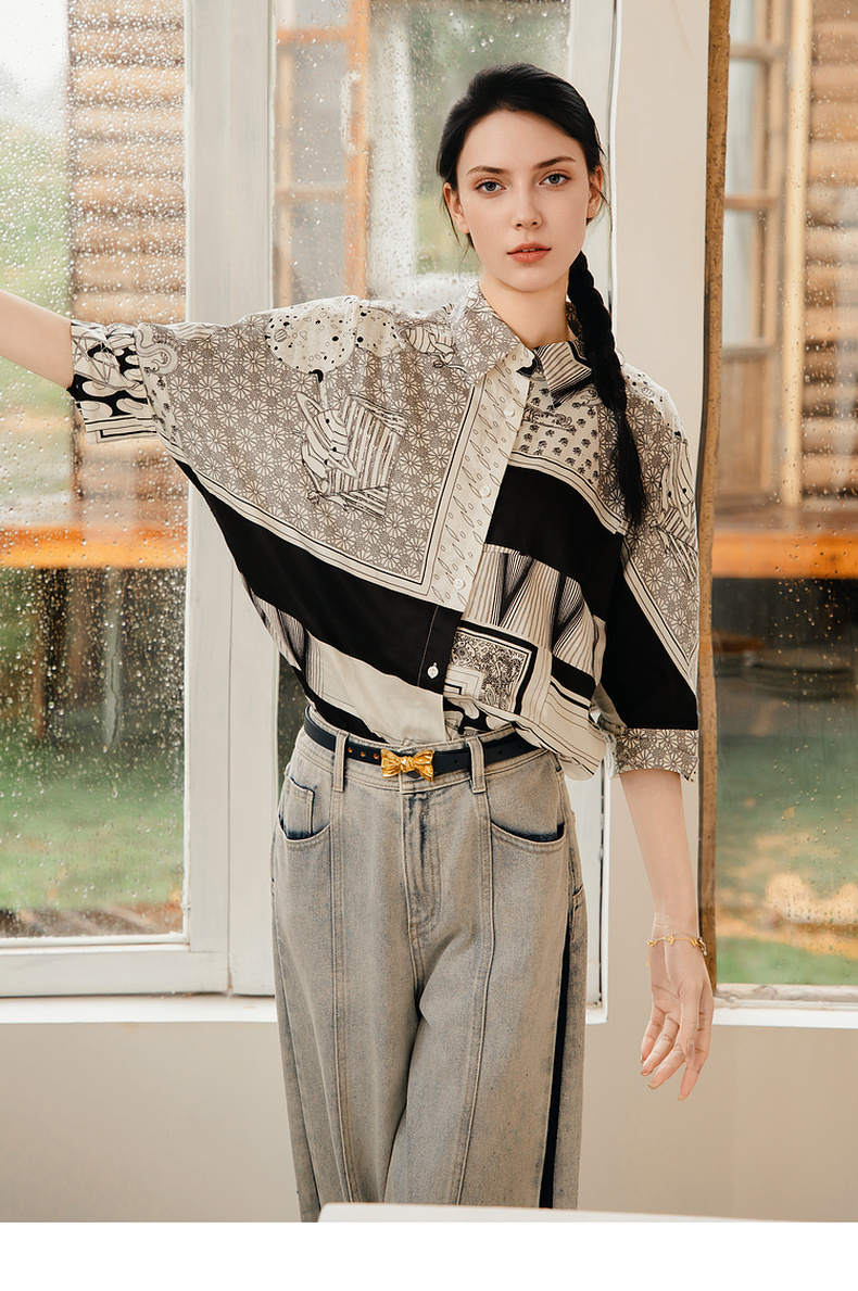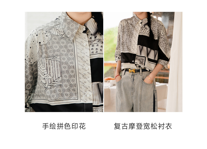 谜底花色衬衫分袖女2025夏新款复古文艺印花大廓形衬衣256MC6211