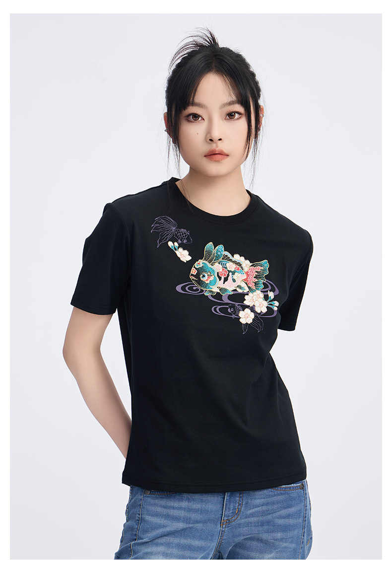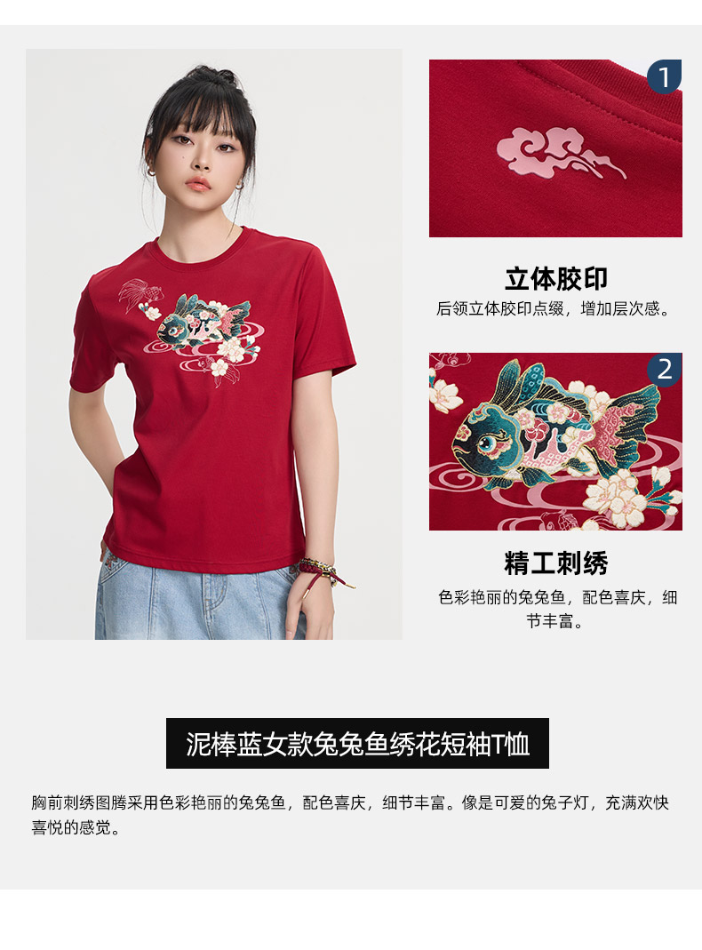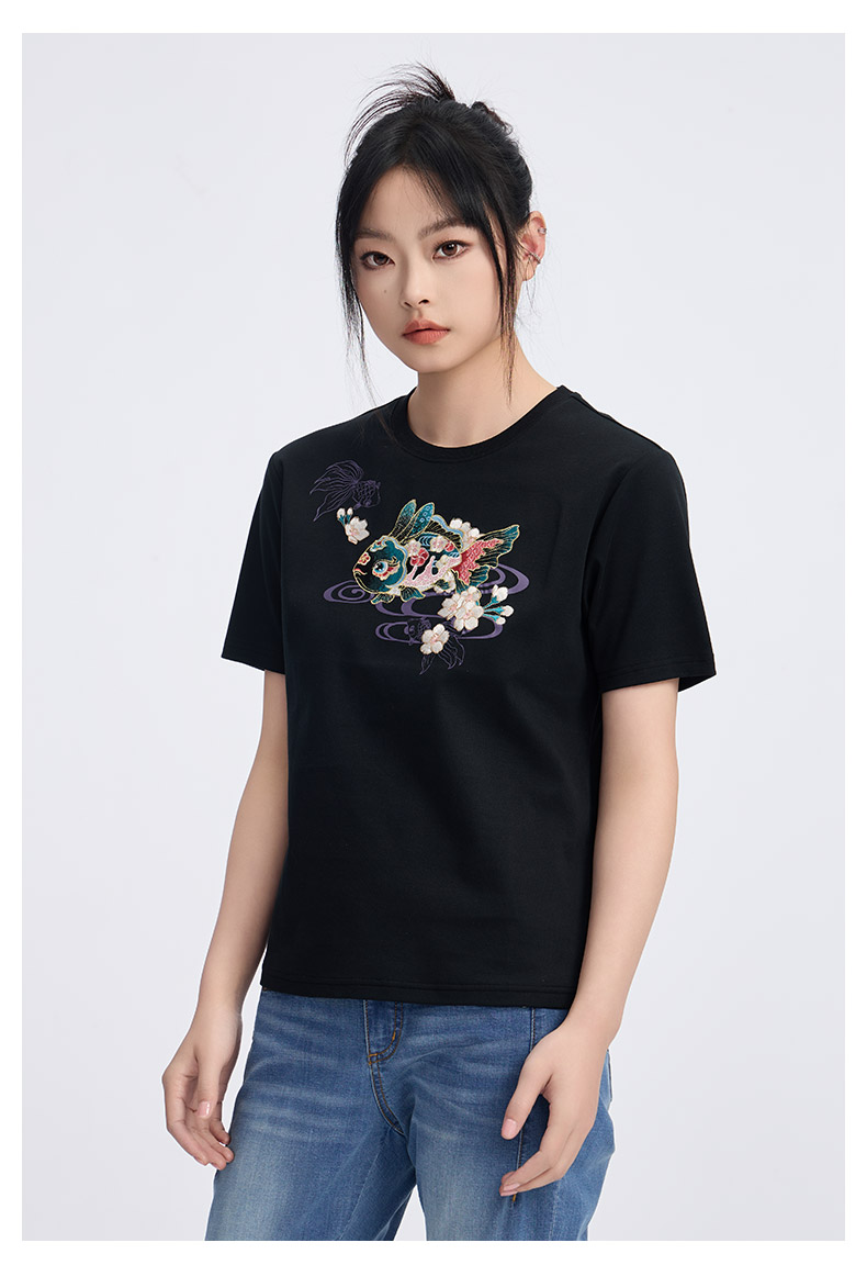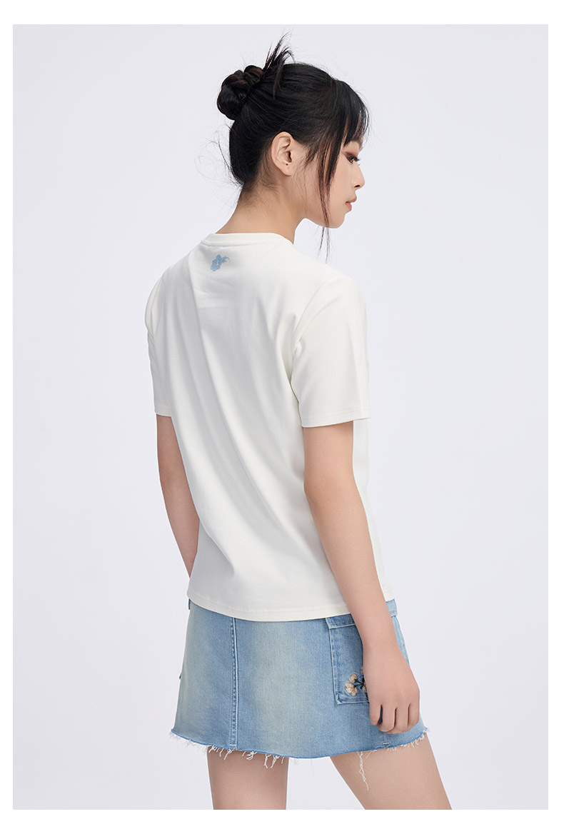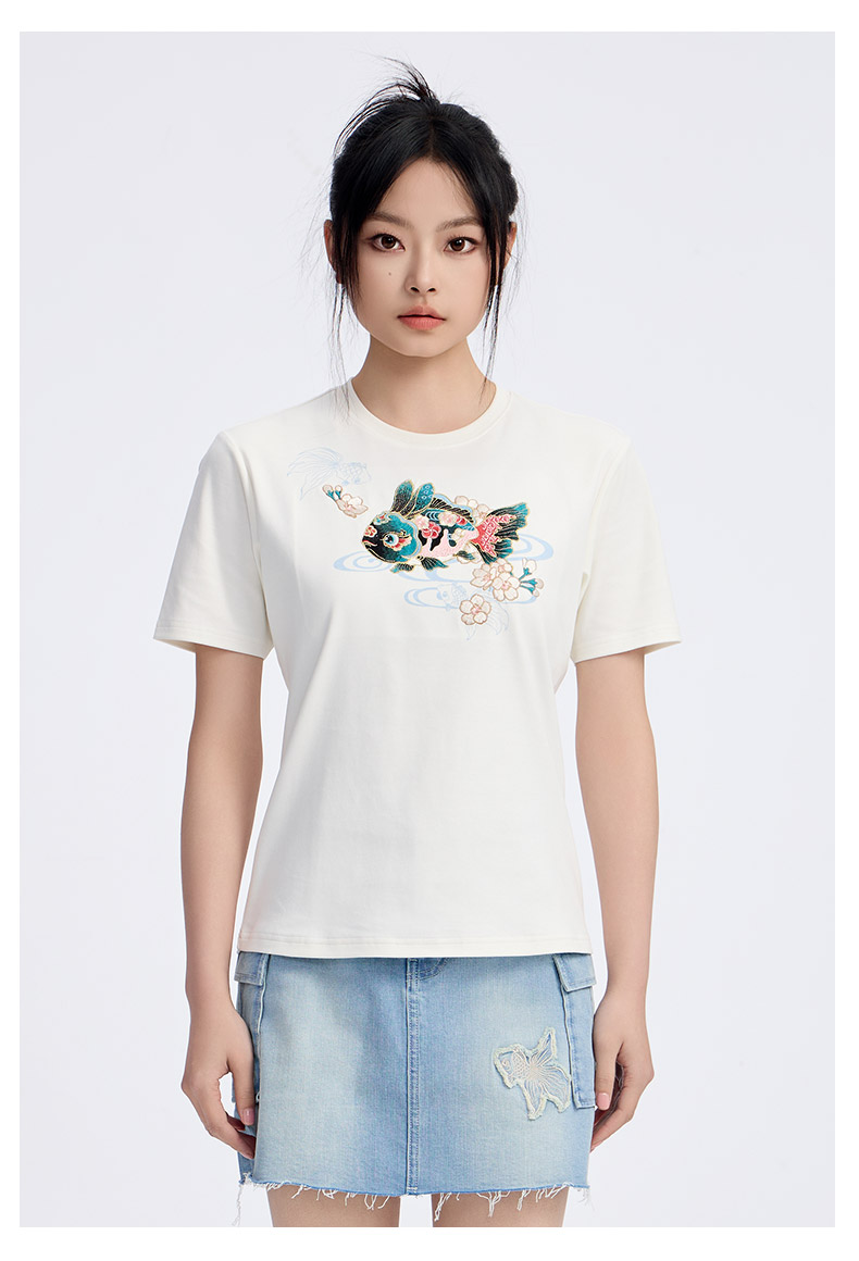ONIARAI/鬼洗25春夏新品泥棒蓝女款兔兔鱼绣花短袖T恤 N840272