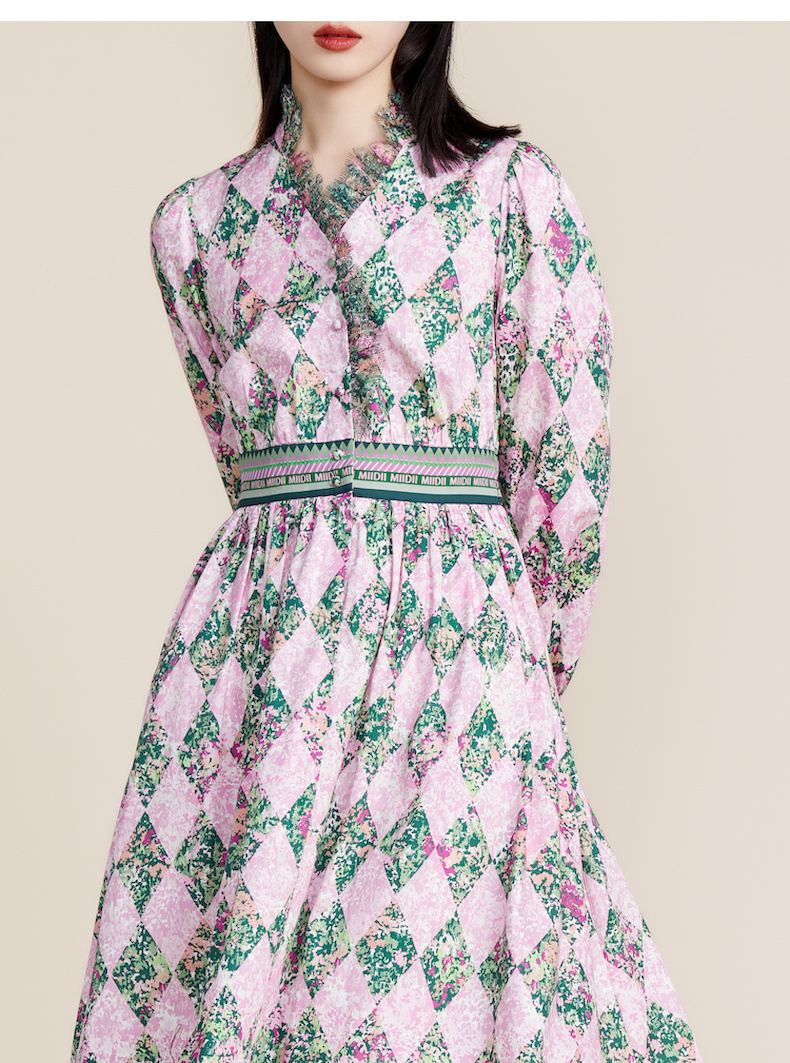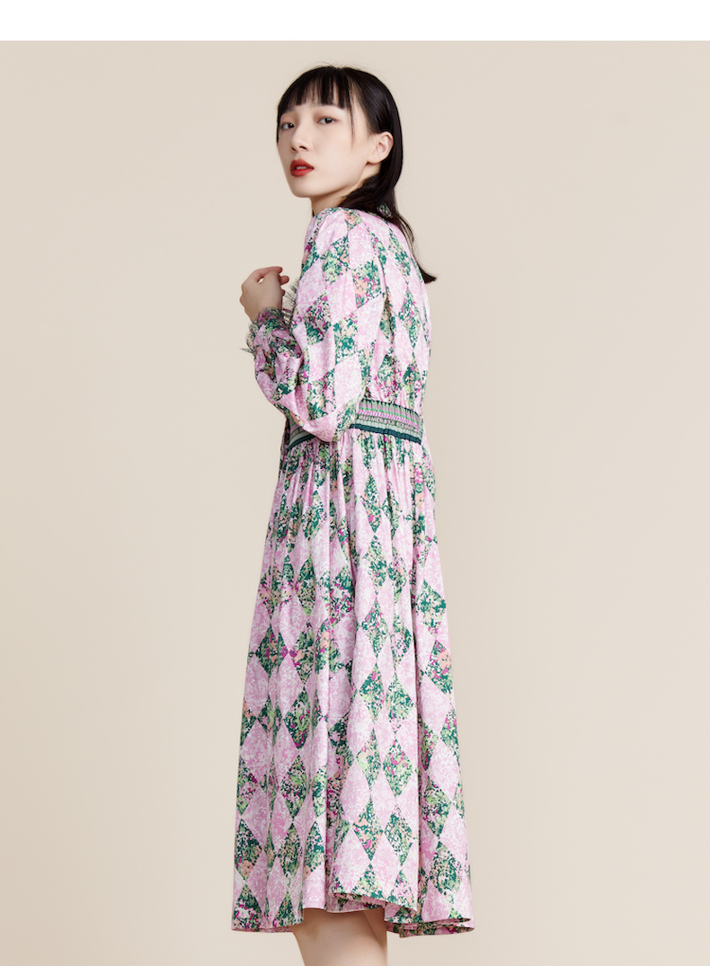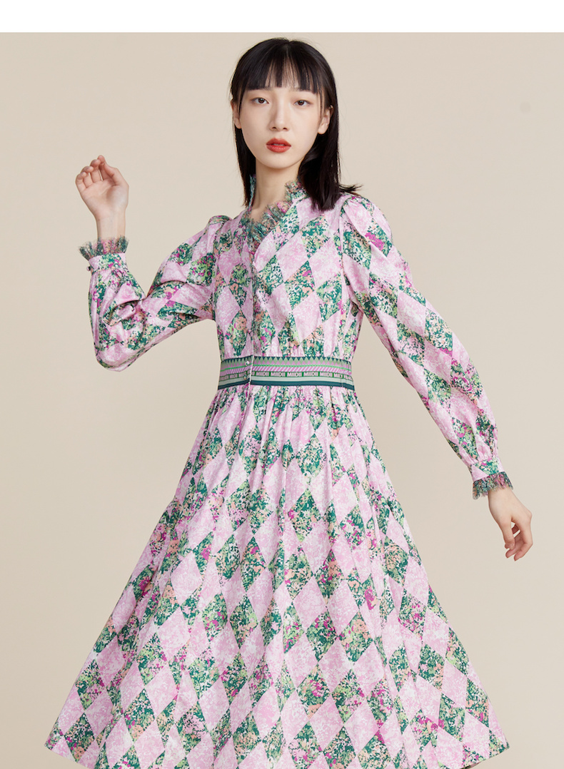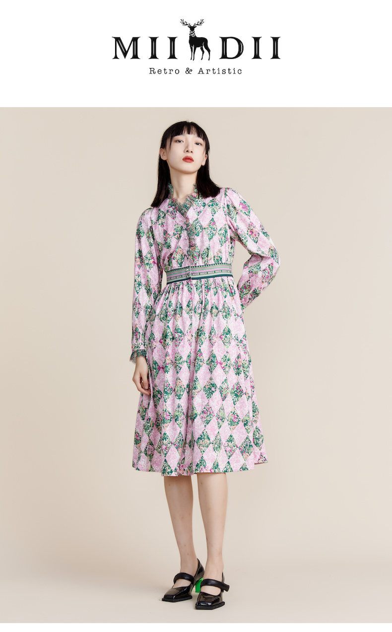 MIIDII谜底2022春新款收腰连衣裙法式田园菱形格印花221ML0088