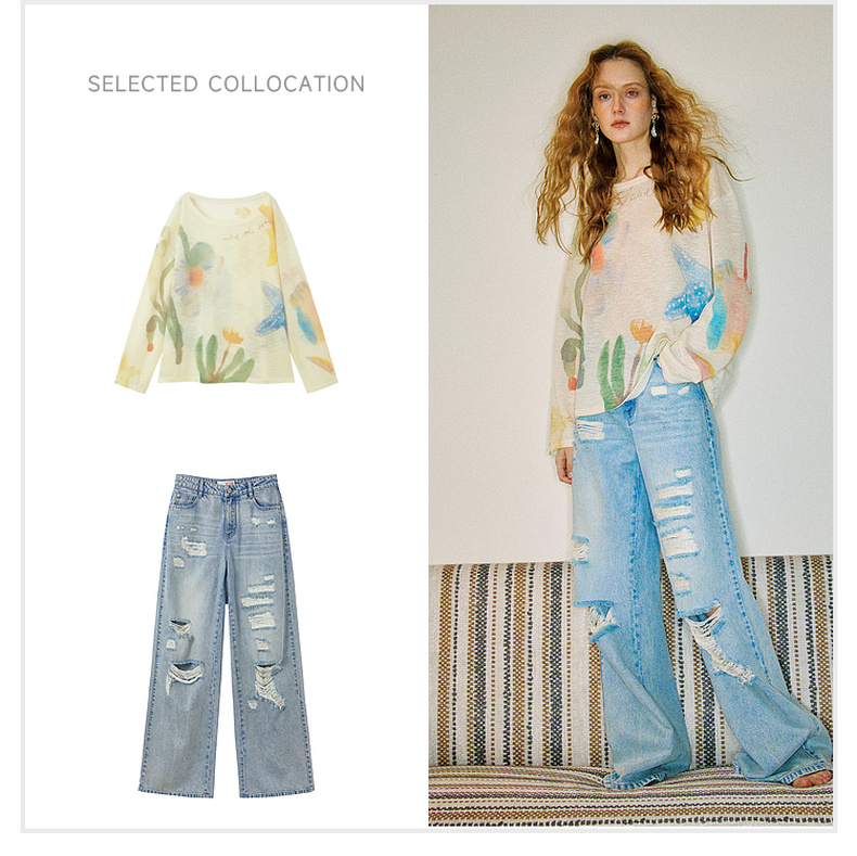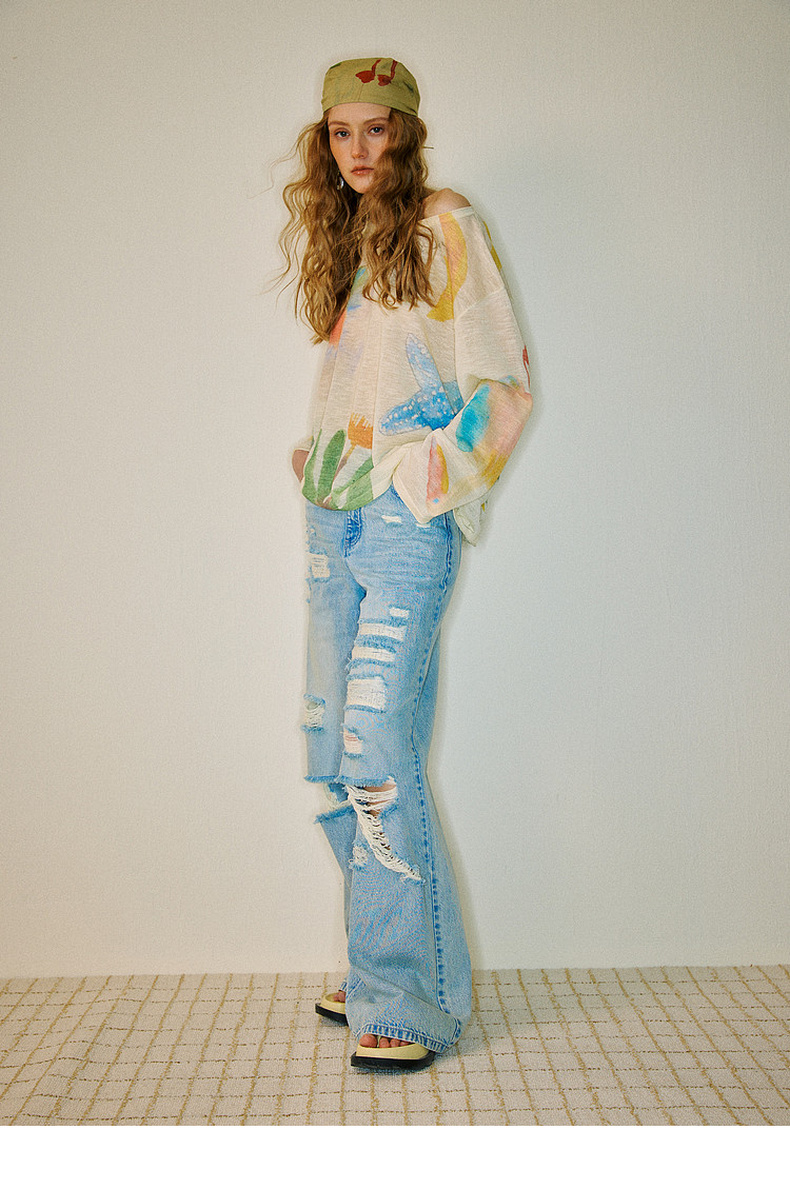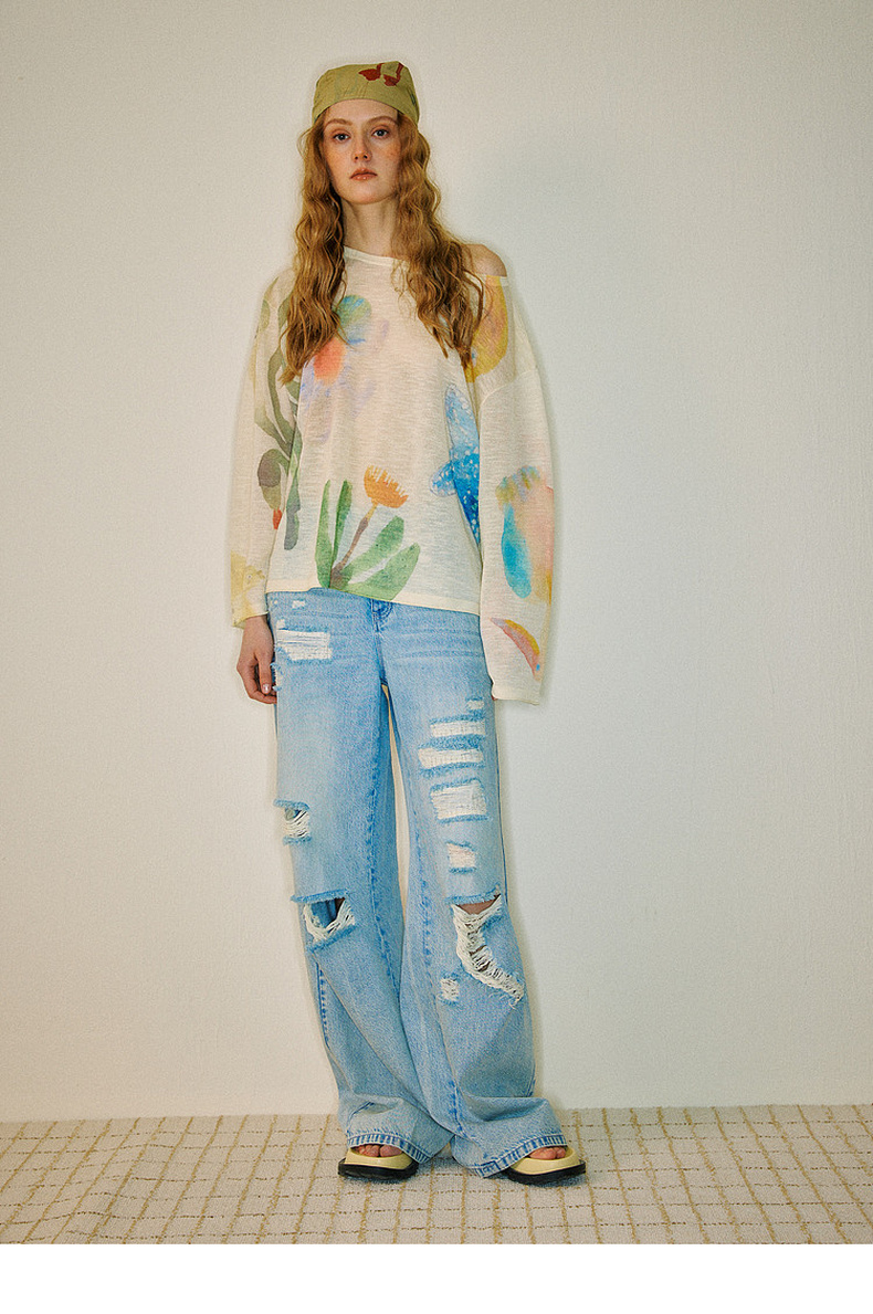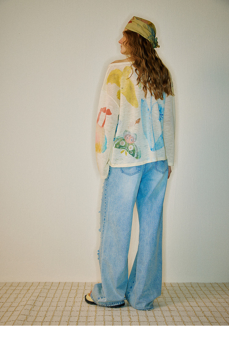 谜底针织衫长袖2026夏季新品一字肩干爽舒适印花罩衫女262MZ0751