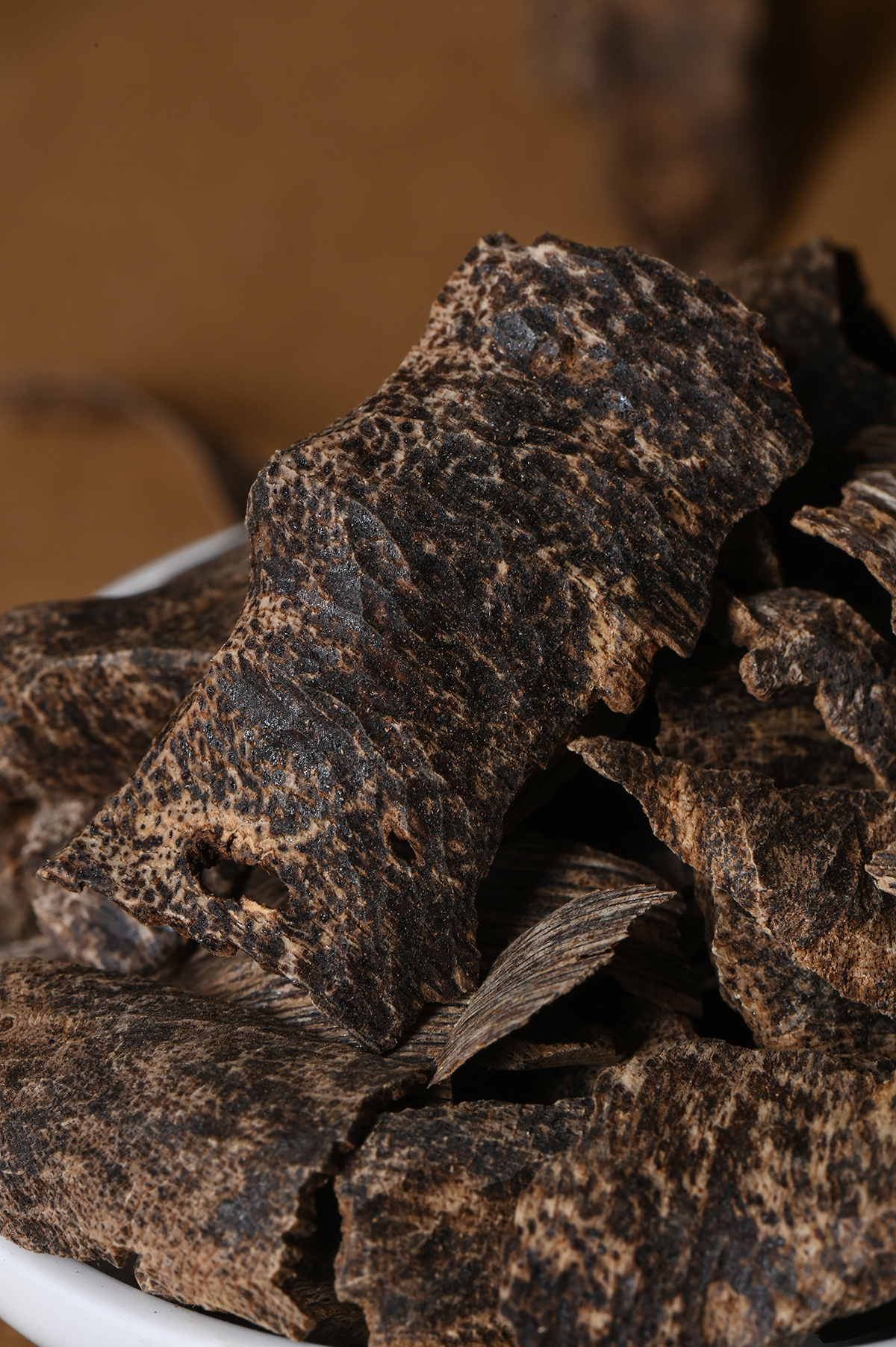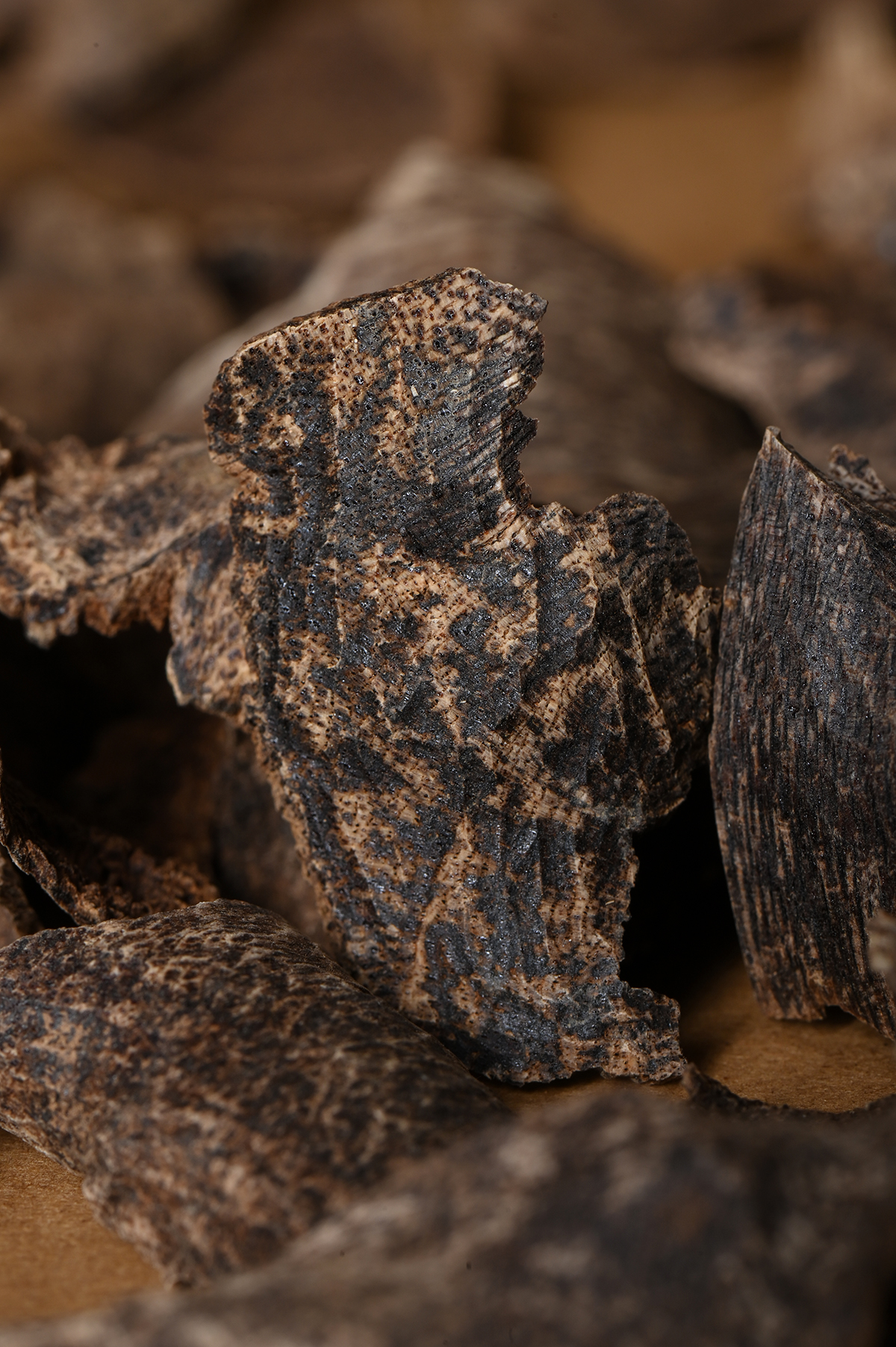 在清代所出的《崖州志》中,描绘了虫漏沉香的色状:“虫漏者,虫蛀之孔,结香不多,内尽粉土,是名虫口粉。肚花划者,以色黑为贵。”
