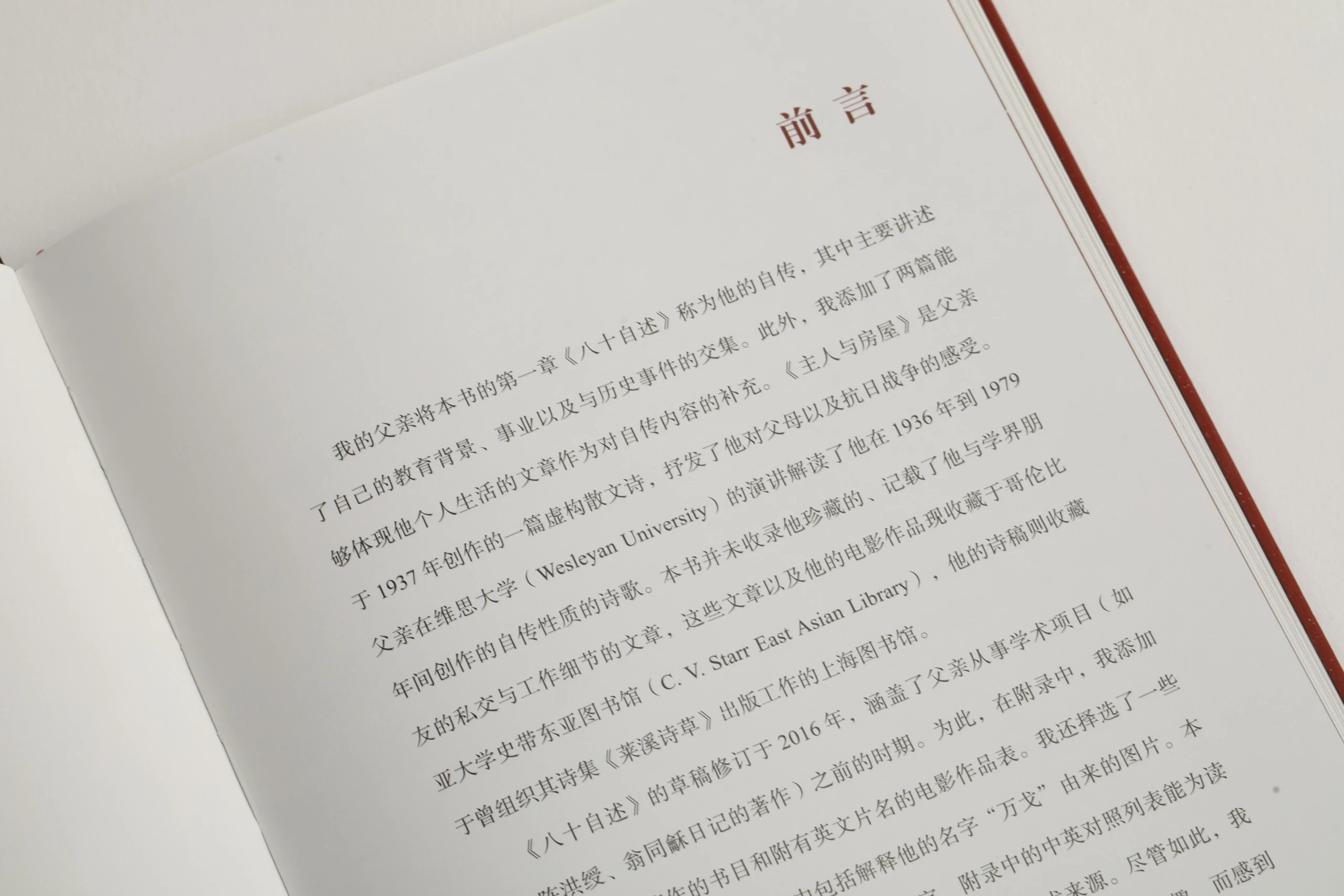 【前言】 我的父亲将本书的第一章《八十自述》称为他的自传,其中主要讲述了自己的教育背景、事业以及与历史事件的交集。此外,我添加了两篇能够体现他个人生活的文章作为对自传内容的补充。《主人与房屋》是父亲于1937 年创作的一篇虚构散文诗,抒发了他对父母以及抗日战争的感受。父亲在维思大学(Wesleyan University)的演讲解读了他在1936 年到1979年间创作的自传性质的诗歌。本书并未收录他珍藏的、记载了他与学界朋友的私交与工作细节的文章,这些文章以及他的电影作品现收藏于哥伦比亚大学史带东亚图书馆(C. V. Starr East Asian Library),他的诗稿则收藏于曾组织其诗集《莱溪诗草》出版工作的上海图书馆。 《八十自述》的草稿修订于2016 年,涵盖了父亲从事学术项目(如关于陈洪绶、翁同龢日记的著作)之前的时期。为此,在附录中,我添加了父亲已出版著作的书目和附有英文片名的电影作品表。我还择选了一些照片来丰富自传的内容,其中包括解释他的名字“万戈”由来的图片。本书中提及了一些少为人知的汉译外文名字,附录中的中英对照列表能为读者提供参考。鉴于我的局限性,大多数注释并无学术来源。尽管如此,我希望我的母亲和父亲会为这本书的出版以及读者对他自传的兴趣,而感到高兴。 【目录】 前言 / 07 致谢 / 08 八十自述 / 09 主人与房屋 / 113 中文诗歌新与旧 我的个人观点 / 129 附录 / 161 【精彩书摘】 (第16页)背书是基本训练 背错误、生涩或遗漏有几种惩罚:一是下学时间后留在书房补读,一是用竹板打手。我比较会念书,很少受罚,可是那位表兄弟常常挨打。一次,老师拿起好娘给我的玻璃镇尺打他手掌,他抽手很快,老师把镇尺打到桌面上变成碎片,使我哭笑不得。 (第23页)在课余的时间,我尽量利用新建的图书馆,一本接着一本地看新文学:五四运动以来的书籍、杂志,包括用白话文翻译的欧美名著。尤其是新诗,对我有飞入太空般的启发,重新认识旧有的文字、想象及美感。从此我除了应付国文考试以外,不再用文言文写作。 (第46 47页)1942 年8 月,美国军部在好莱坞的特别服务处(即电影宣传部门)编制一部系列讲解第二次世界大战远因近果的影片,其中第五部《中国之抗战》需要既了解中国又懂得电影的人作技术顾问,于是他们找到了我 加上那时军部利用商业电影的设备和人才,我也有时到录音场、卡通绘制及摄制处(迪士尼公司)等地方去考察。可以说在好莱坞的四个月,我得到了对美国电影企业的初步认识及最新电影技术的普遍考察。 (第73 74页)我们全家由港返台,我立刻安排到台中去观研故宫博物院的国宝 大约在(八七水灾)发水七天后,听说道路可行,但有几条小河都没有桥梁,必须赤脚扛车蹚过。好在两人(翁万戈、艾瑞慈)都年轻力壮,路虽不近,也走到了,使两院的主持人庄慕陵及谭旦冏两位先生大吃一惊 有一天忽然地震,大家赶紧收摊,书画放妥,全跑到院子里等候余震的平息。这是我一生难忘的机缘,初次见到范宽的《溪山行旅图》、郭熙的《早春图》等大幅画作、黄公望《富春山居图》长卷等。 (第88 89页)利用这个机会,我能实验一些展览方式,如以三层玻璃影印范宽《溪山行旅图》来表现近、中、远的构图方式,以半墙高的放大表现怀素《自叙帖》的狂逸雄浑,以背后打光的五彩“陶瓷之墙”显出一百件自商到清的中国杰作,乍看像展出灿烂的实物,放大而逐渐延伸(用电动)的唐寅《溪山渔隐图》卷,字字随音突出的一页古诗 张继《枫桥夜泊》 都是别出心裁的技术,在台湾博物馆界有其影响。