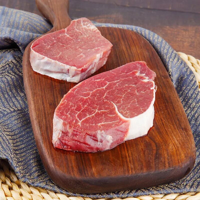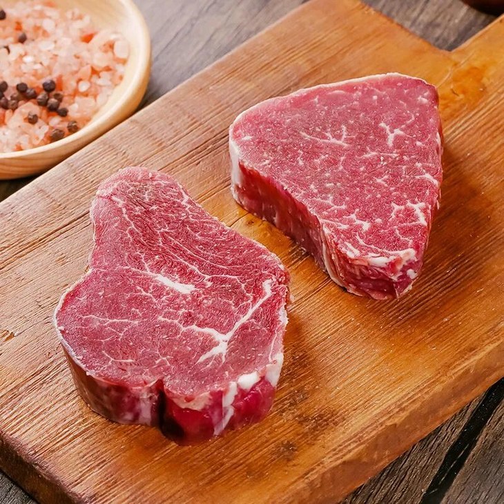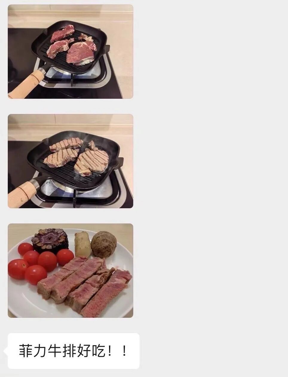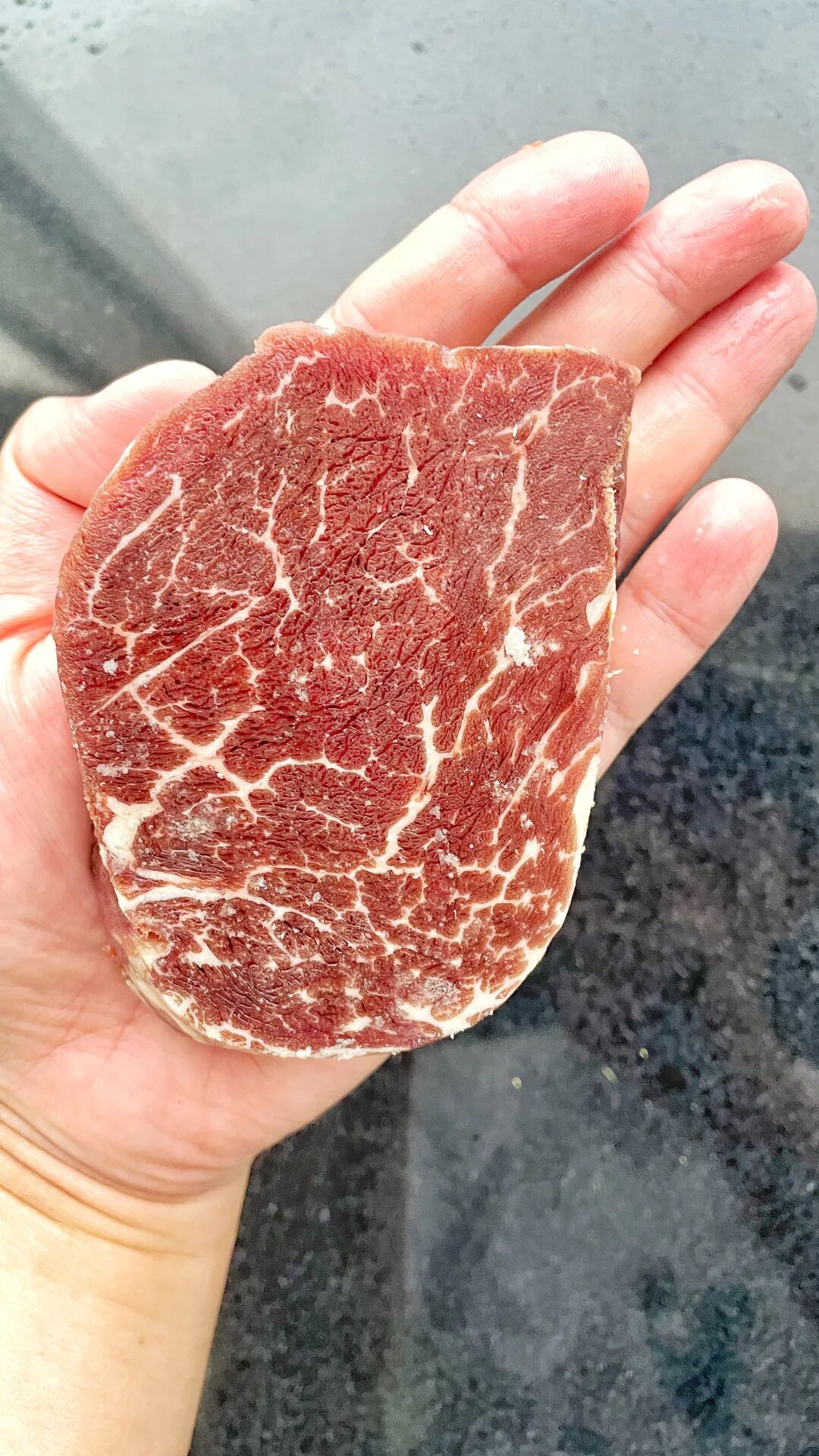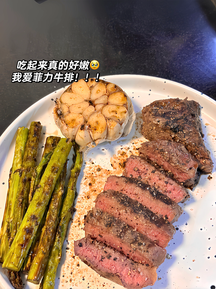 这款菲力牛排是谷物饲养的,谷物饲养可以增加牛肉的产量