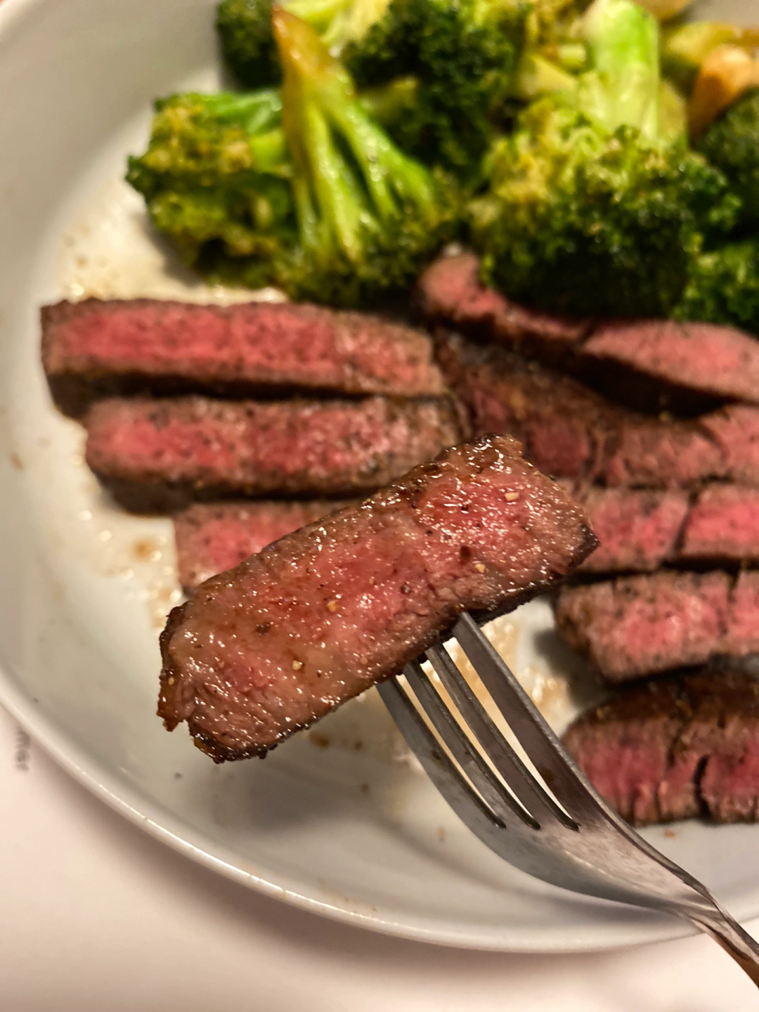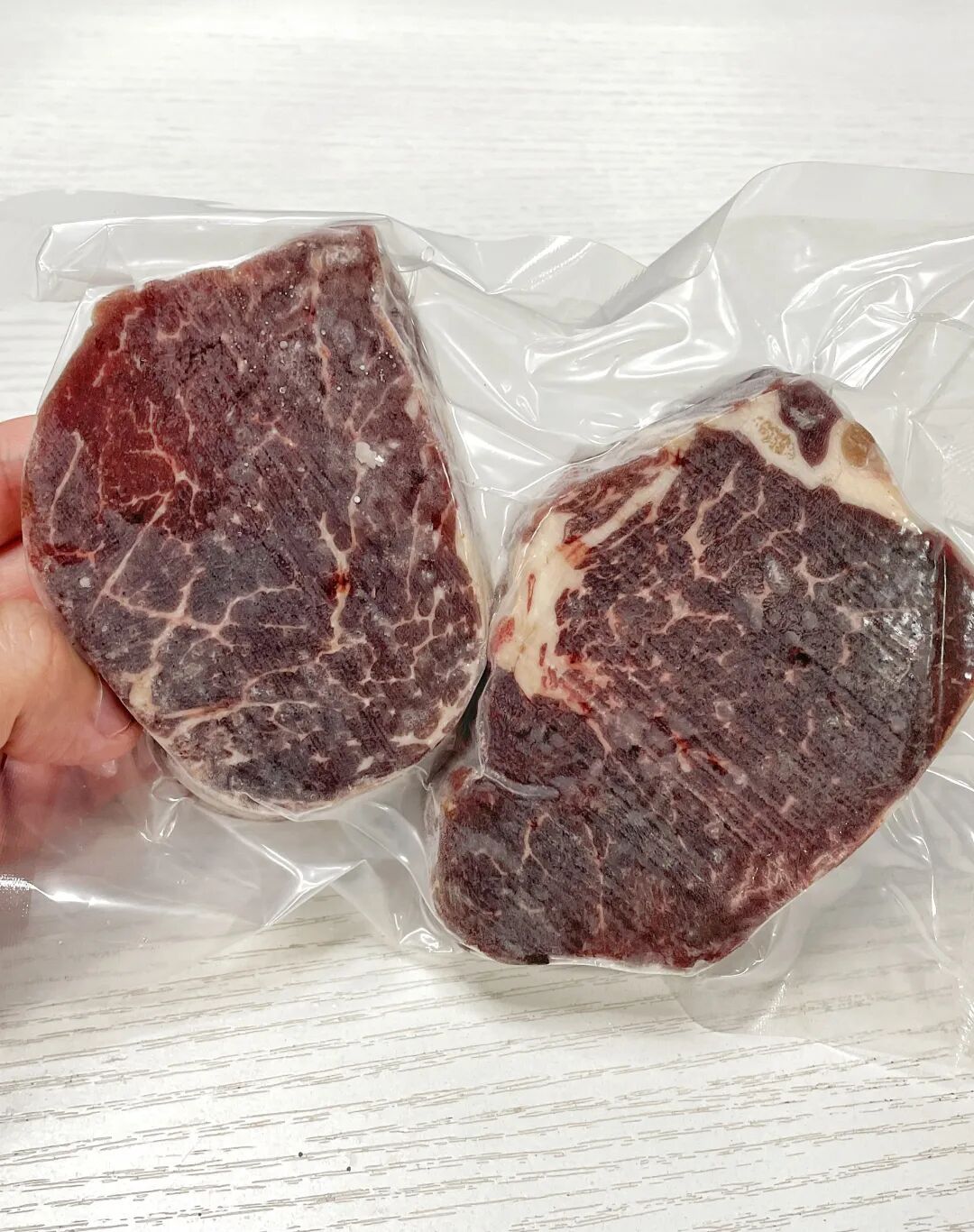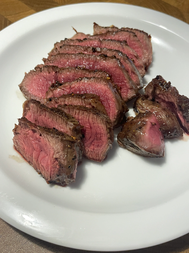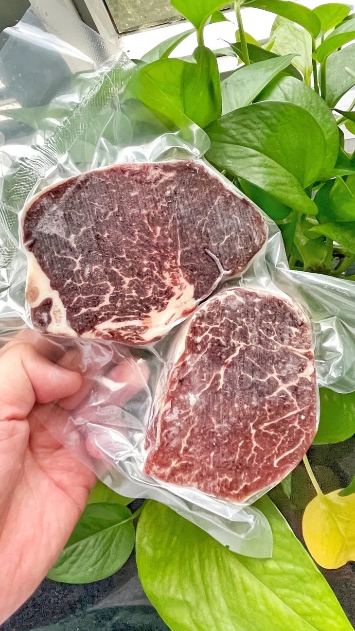这款菲力牛排是谷物饲养的,谷物饲养可以增加牛肉的产量