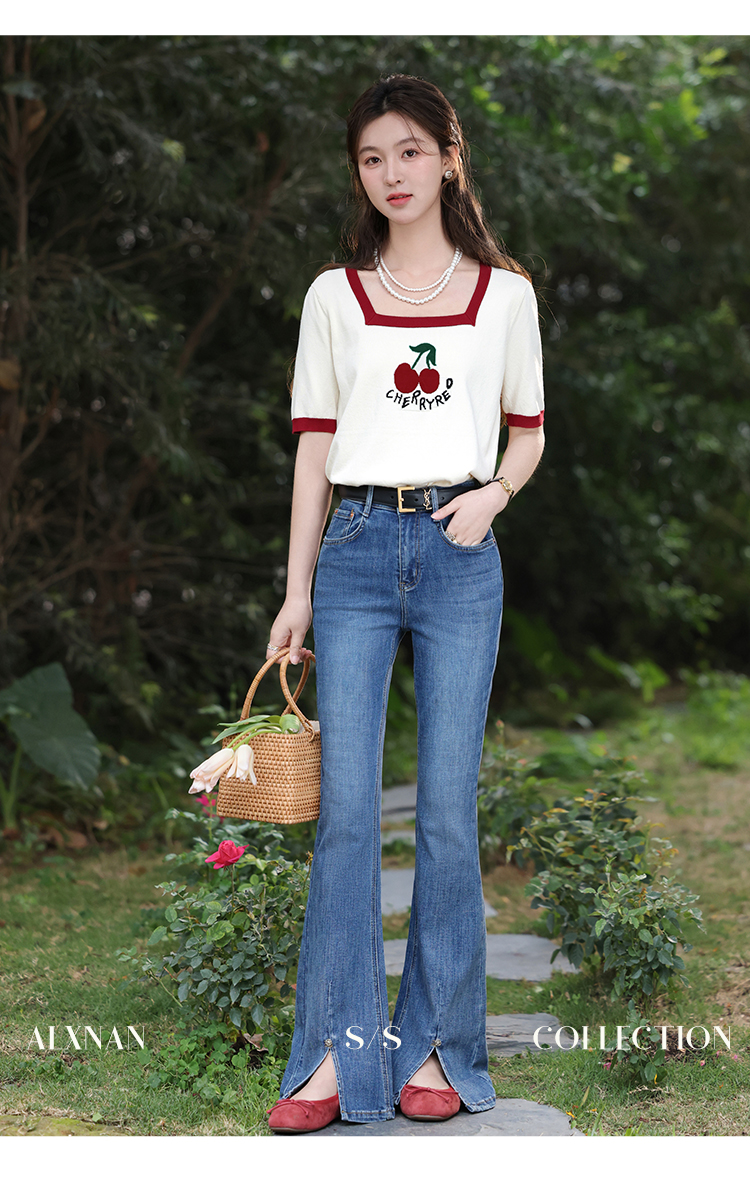鹿向南《夏日樱桃》冰丝针织t恤女新款夏季薄款短袖方领上衣L35023 商品图4