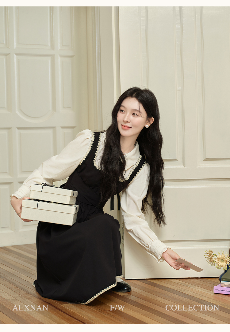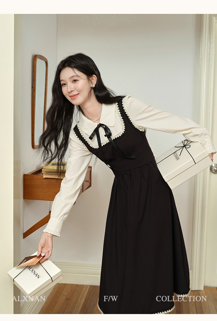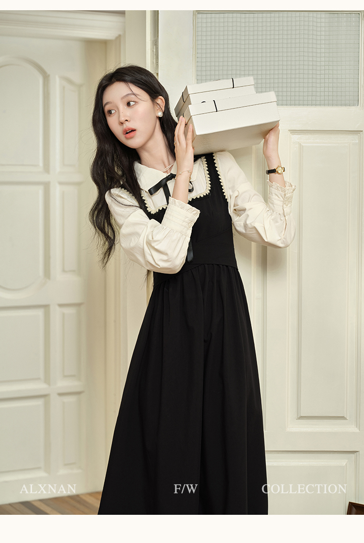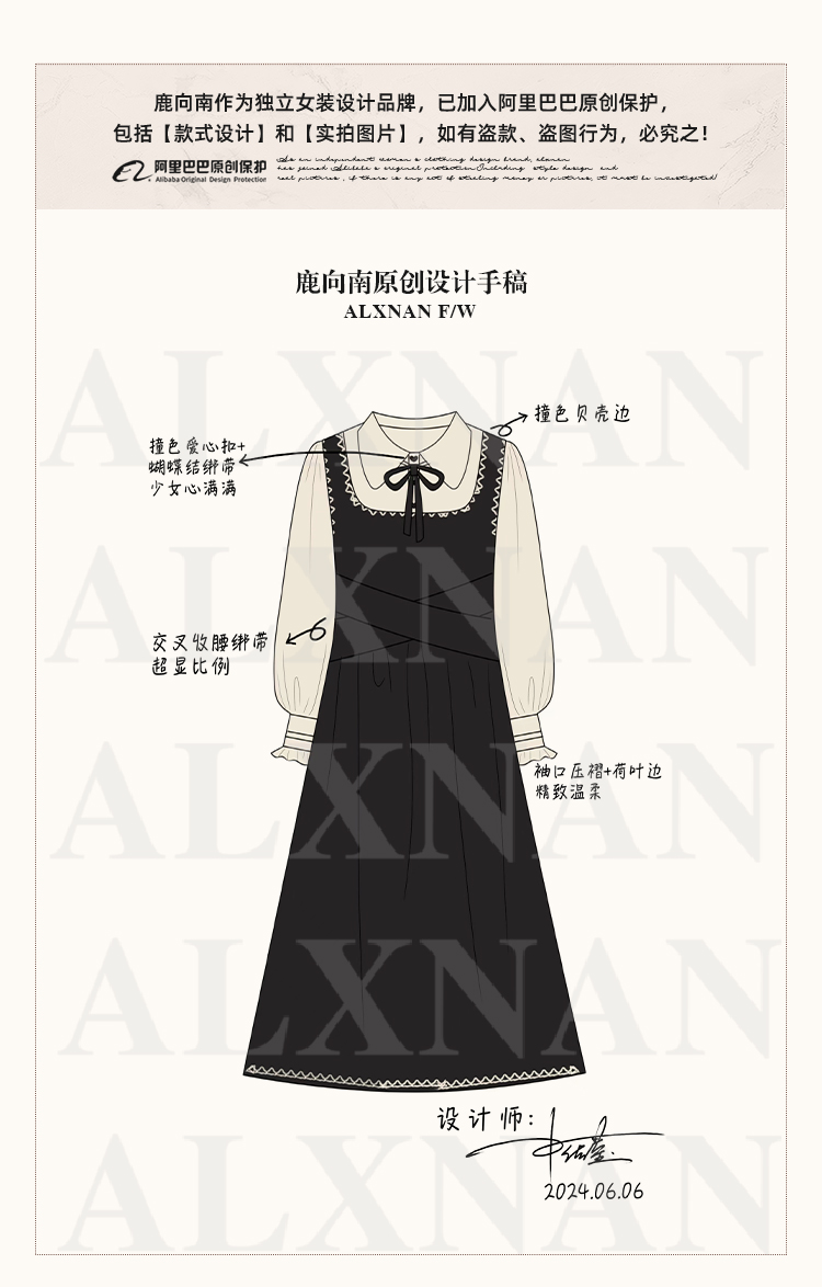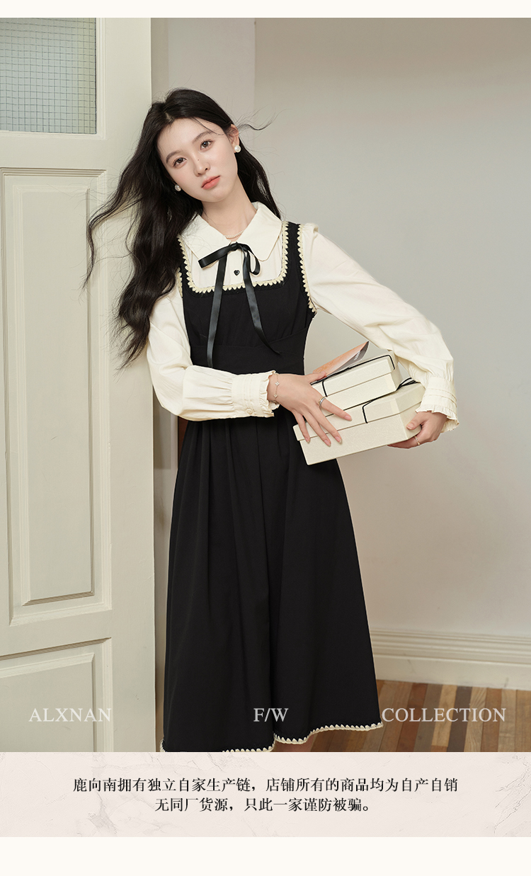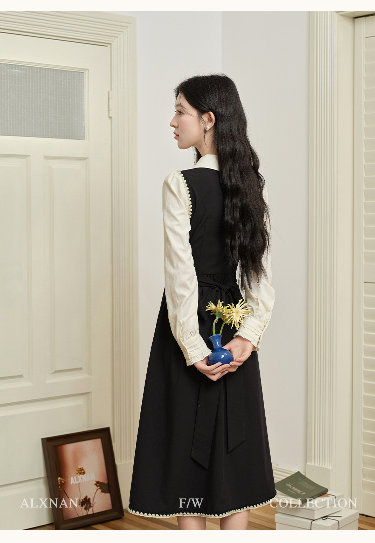 鹿向南「南法假日」假两件黑色连衣裙L39725