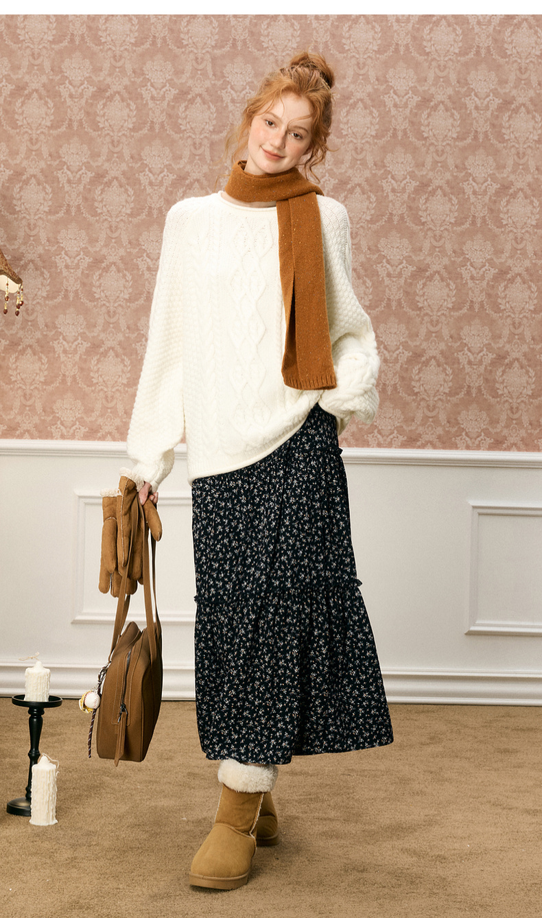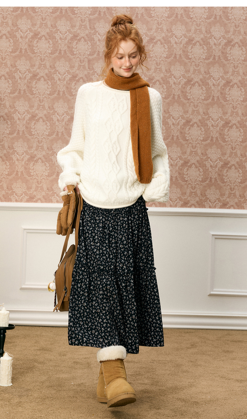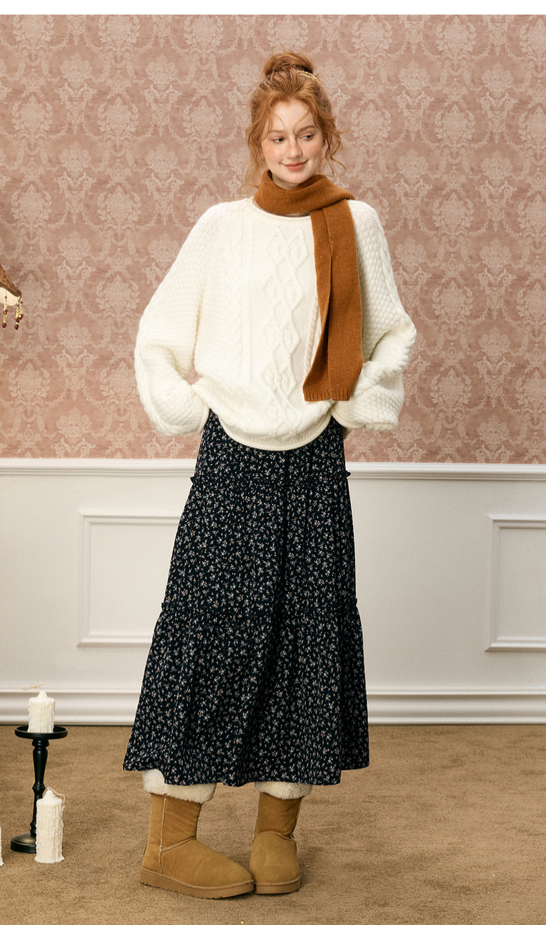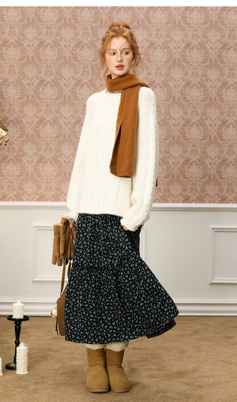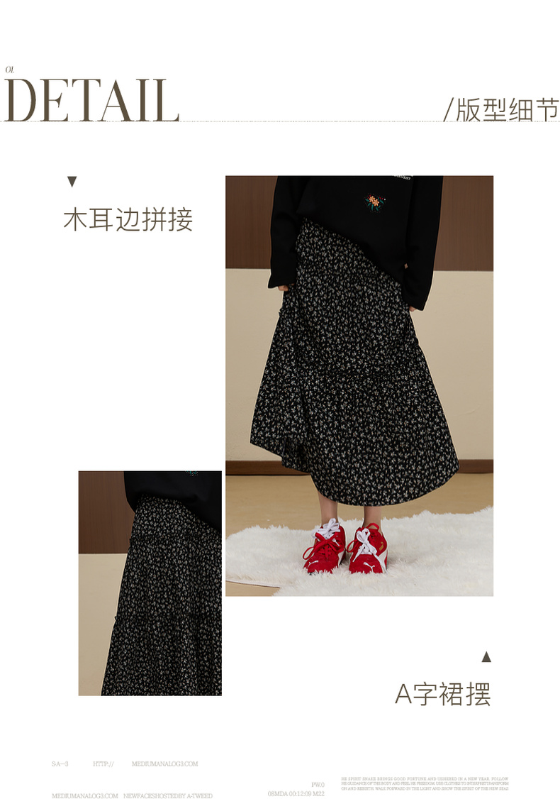 三彩独醒2025冬季新款碎花半身裙松紧腰A字裙木耳边长裙F