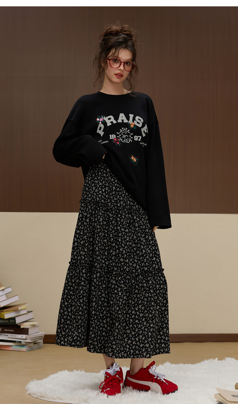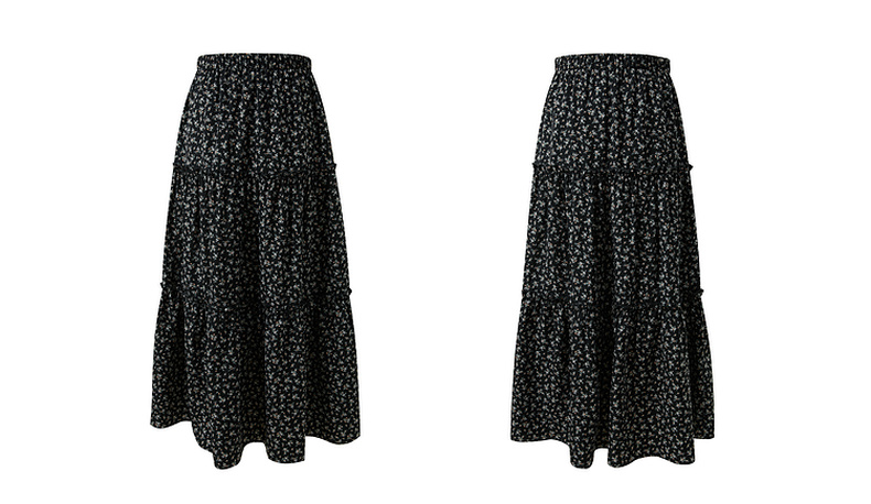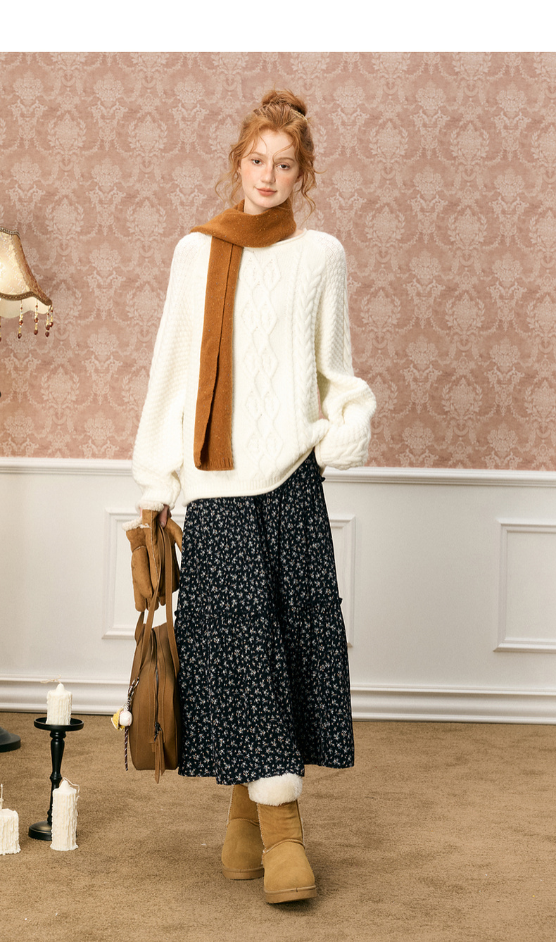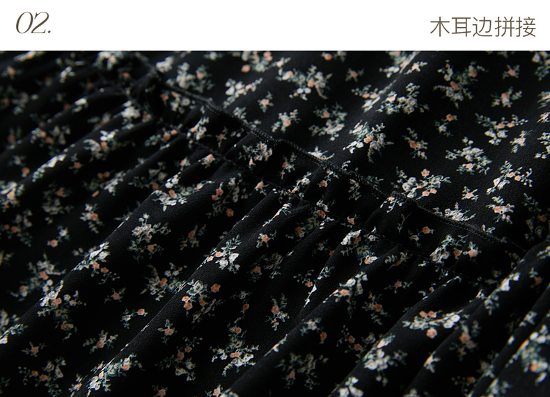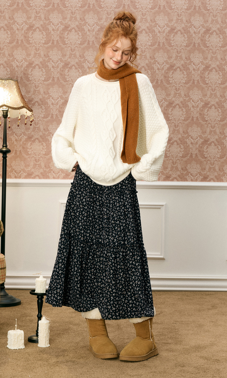 三彩独醒2025冬季新款碎花半身裙松紧腰A字裙木耳边长裙F