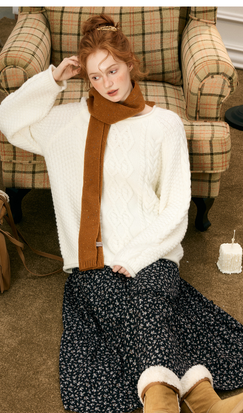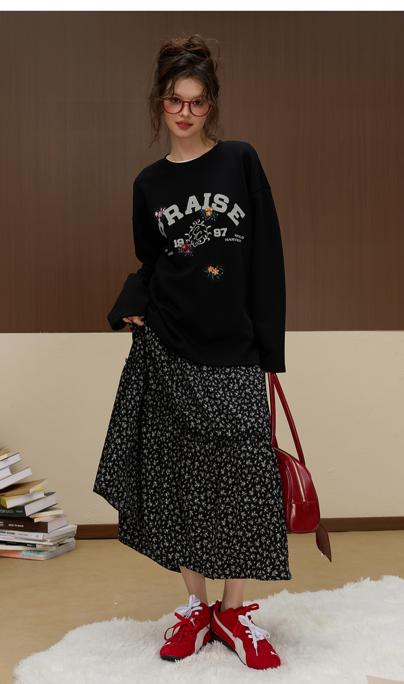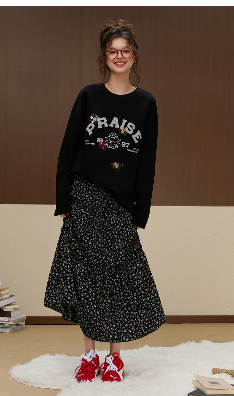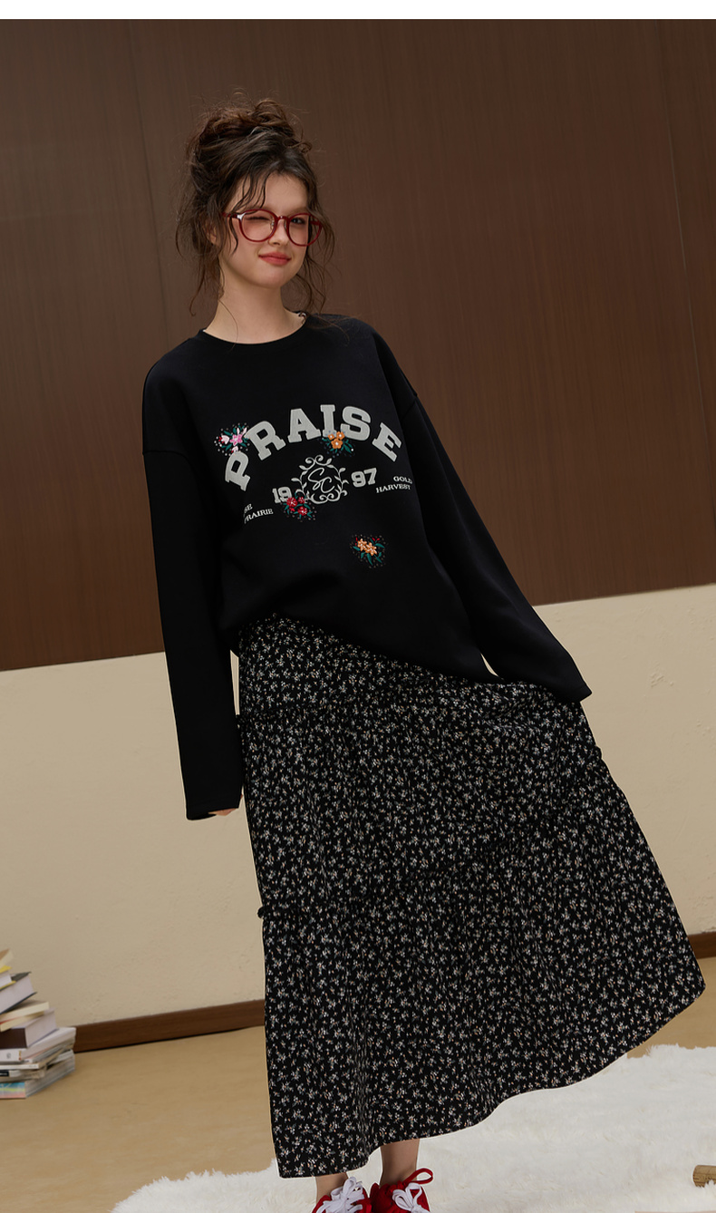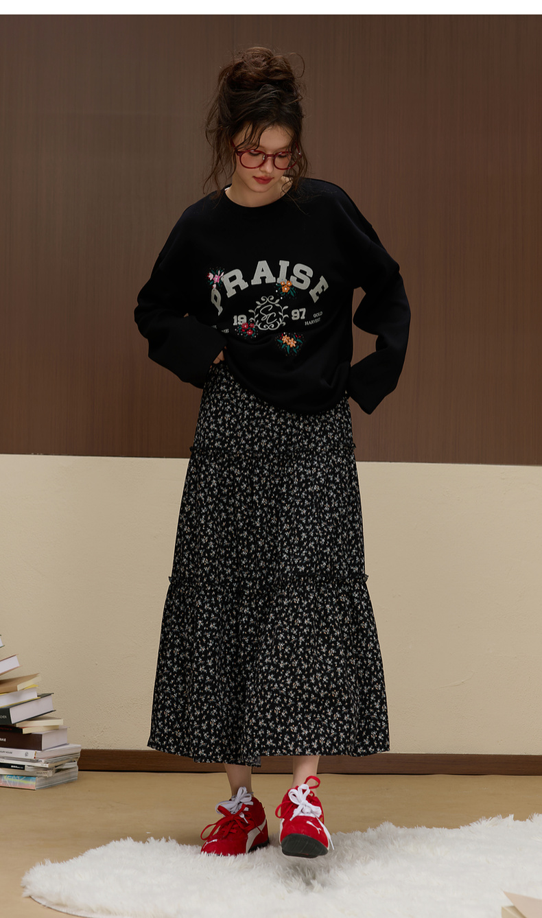三彩独醒2025冬季新款碎花半身裙松紧腰A字裙木耳边长裙F