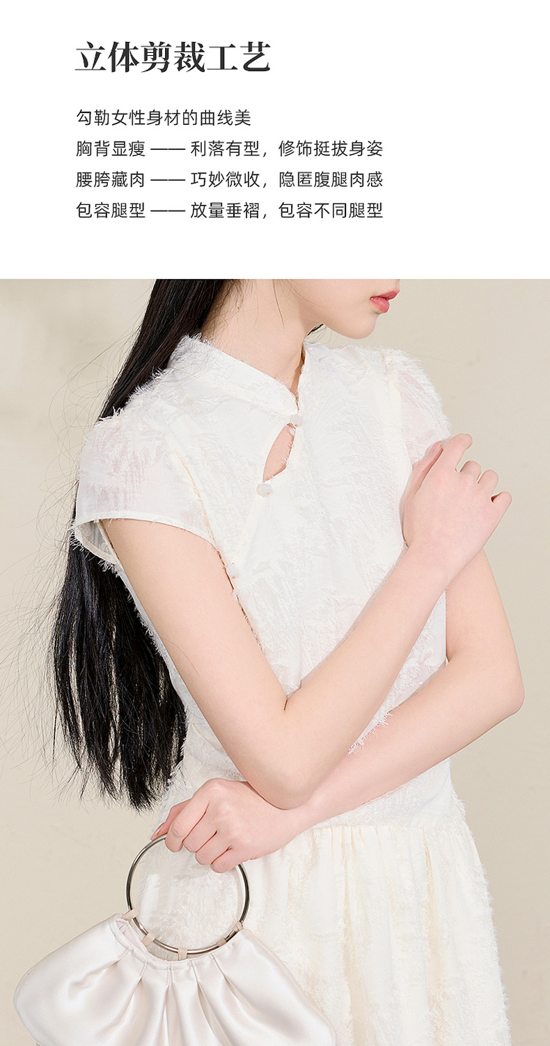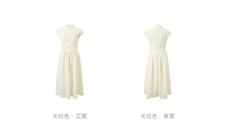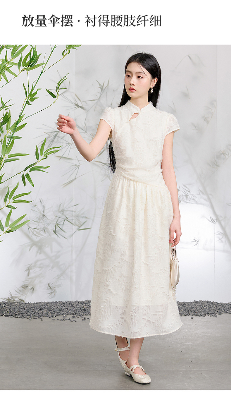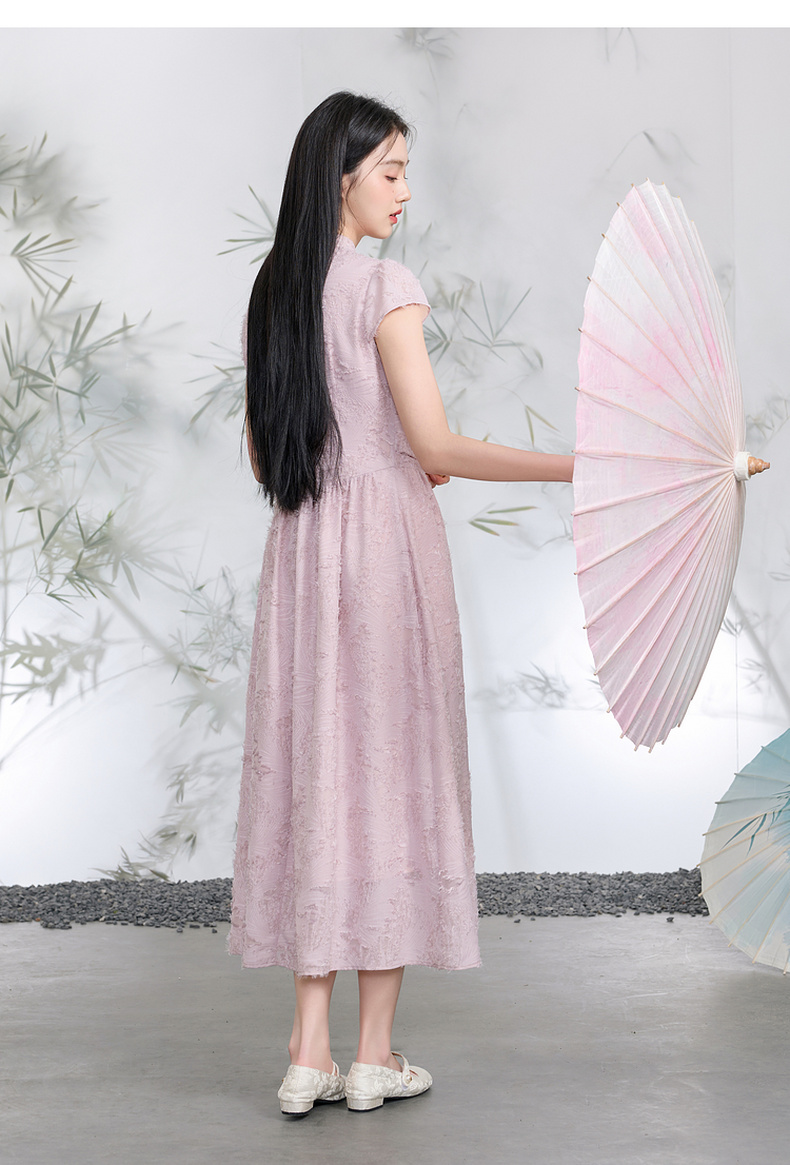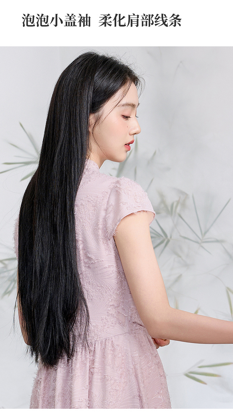 三彩【不染烟霞】2026春季新款剪花连衣裙短袖立领A字裙长裙C