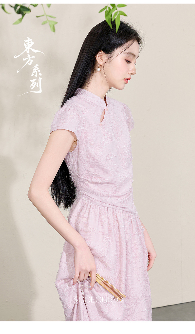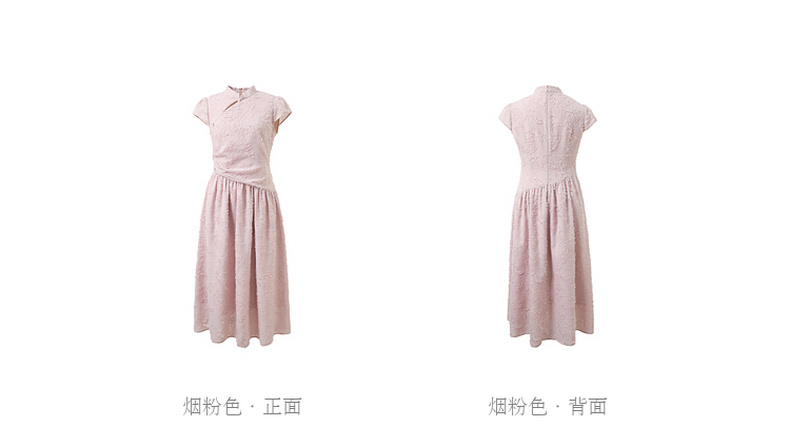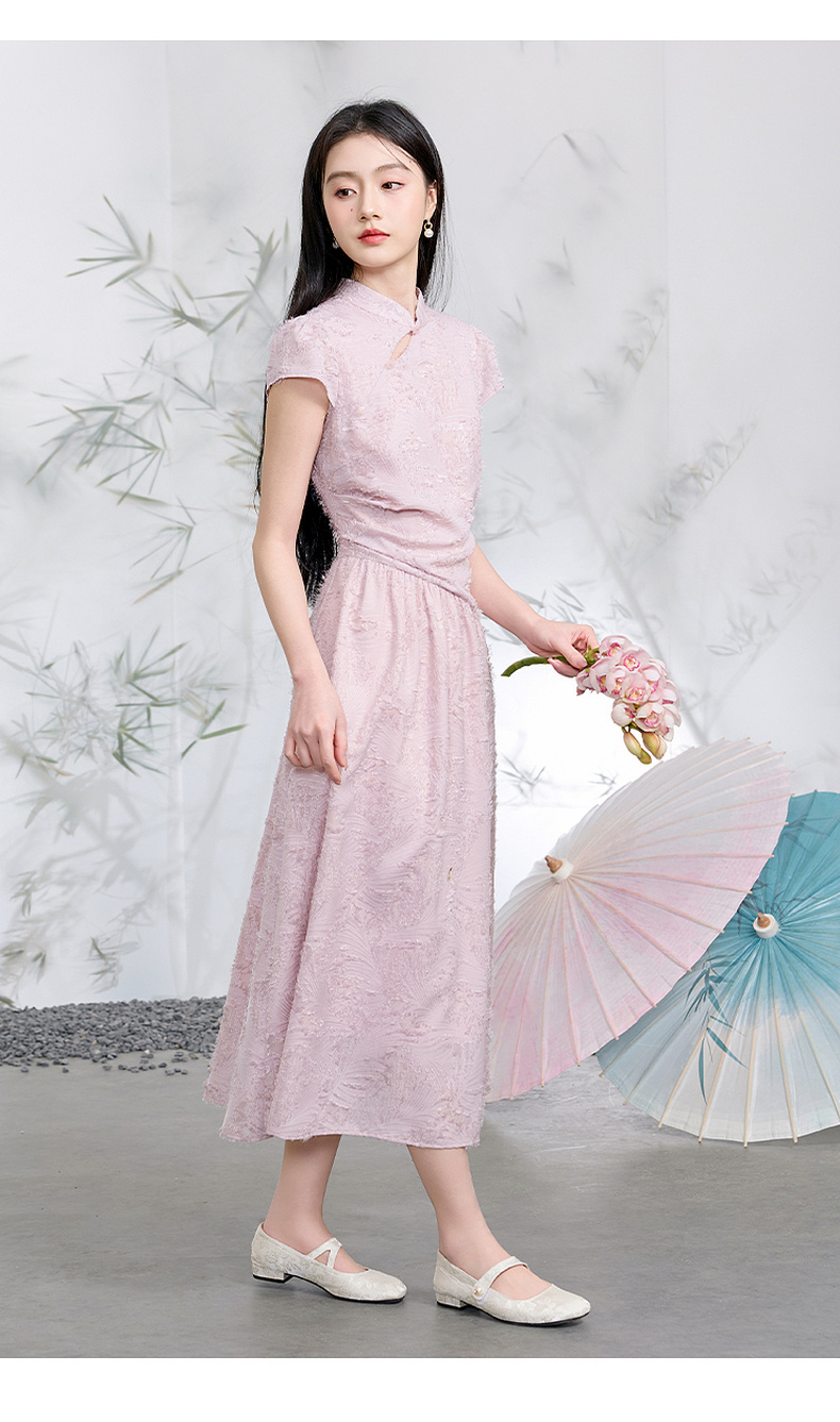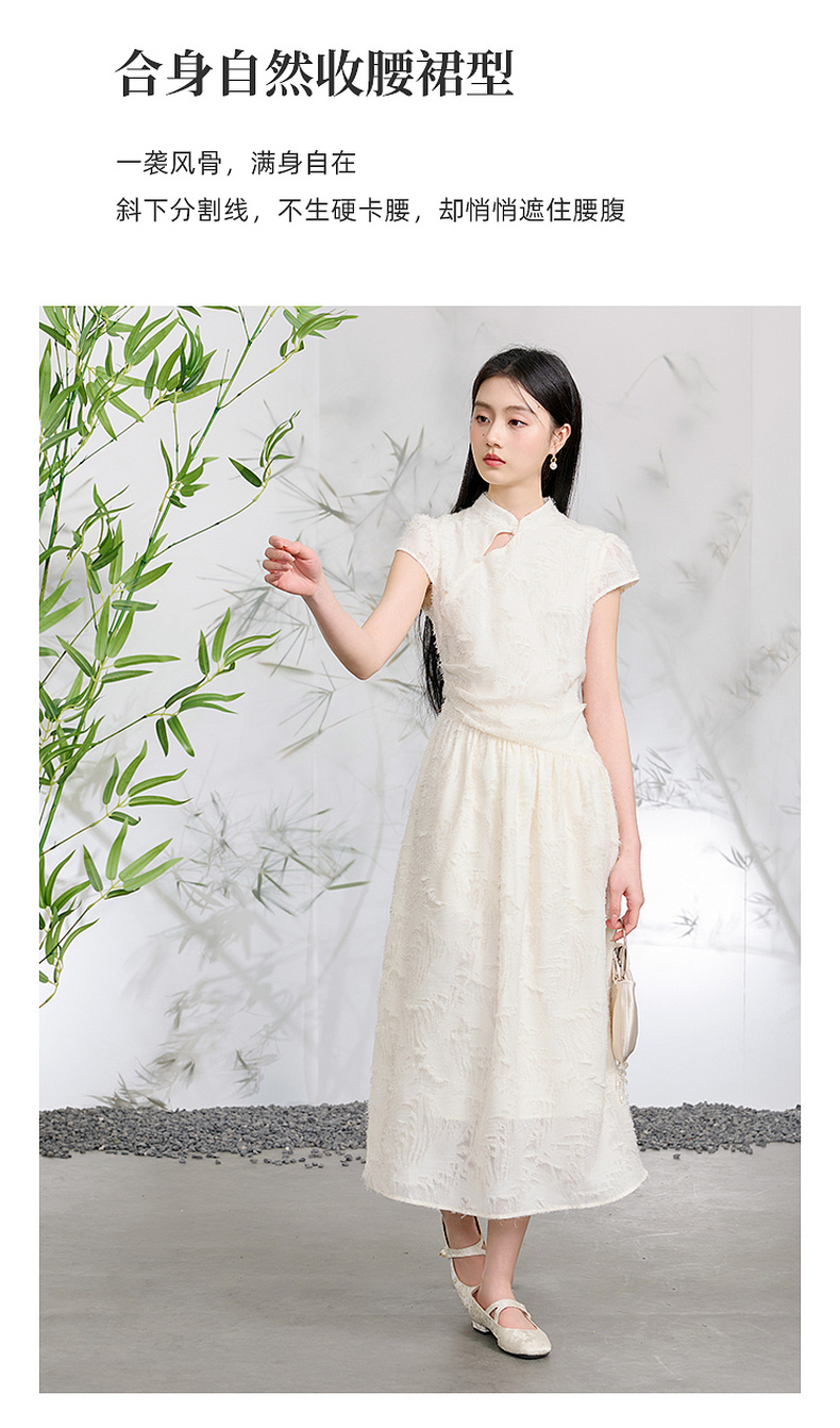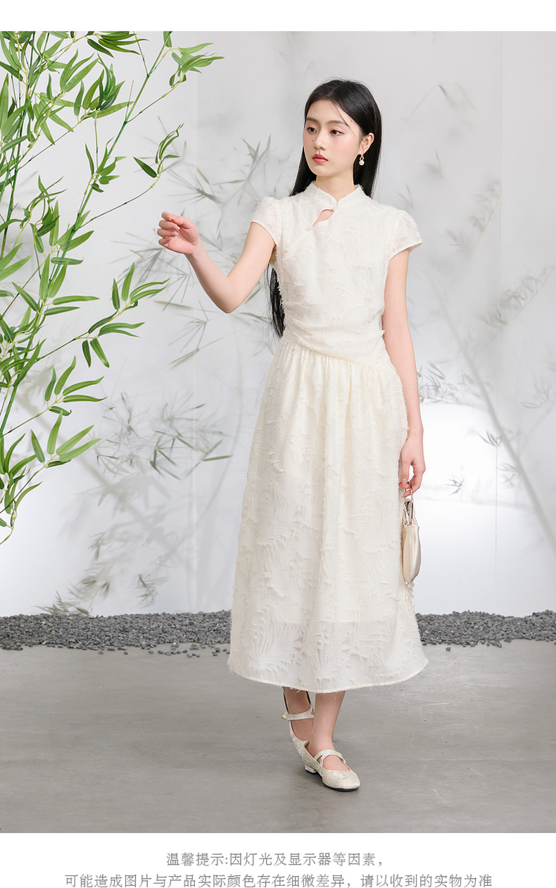 三彩【不染烟霞】2026春季新款剪花连衣裙短袖立领A字裙长裙C