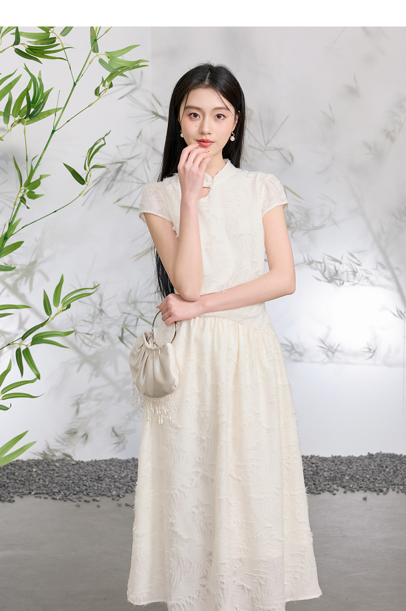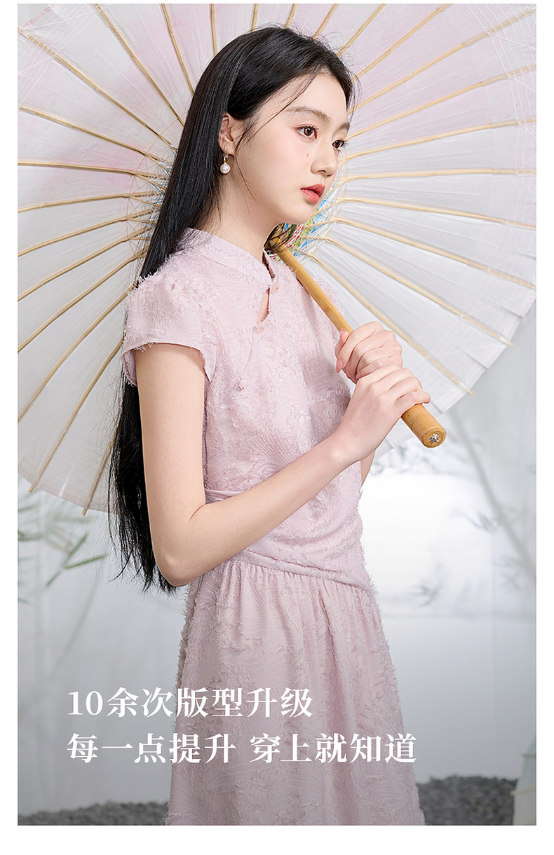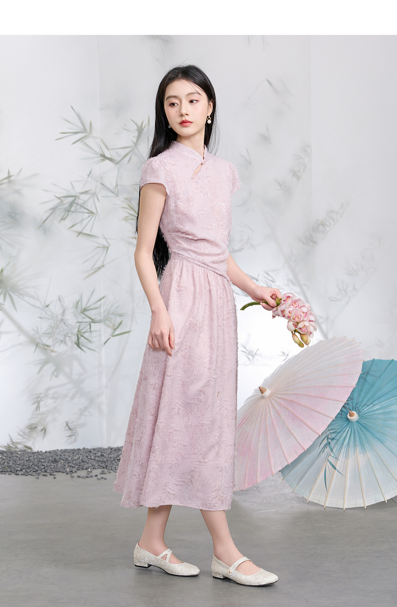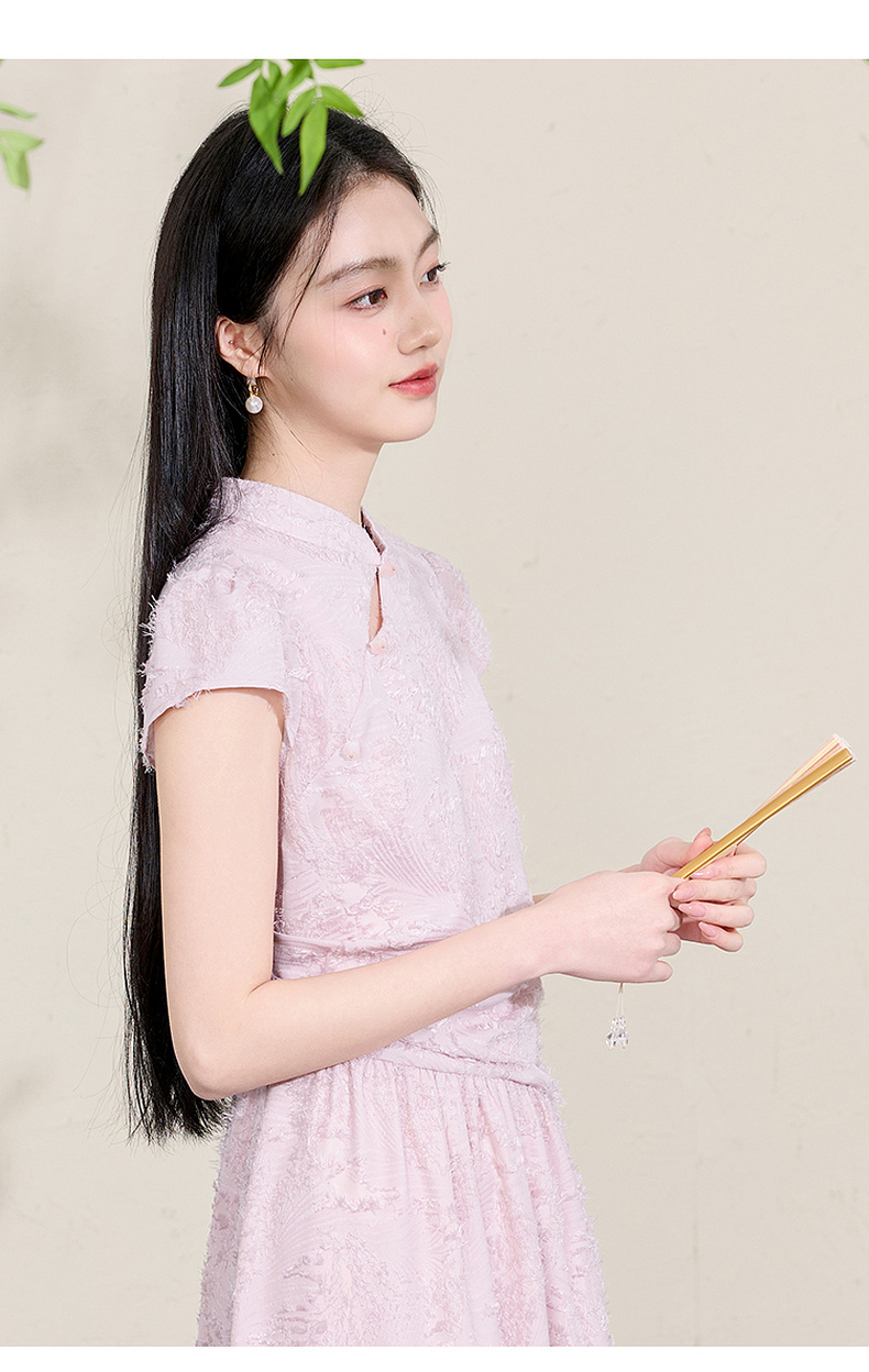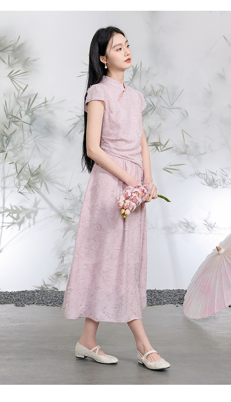 三彩【不染烟霞】2026春季新款剪花连衣裙短袖立领A字裙长裙C