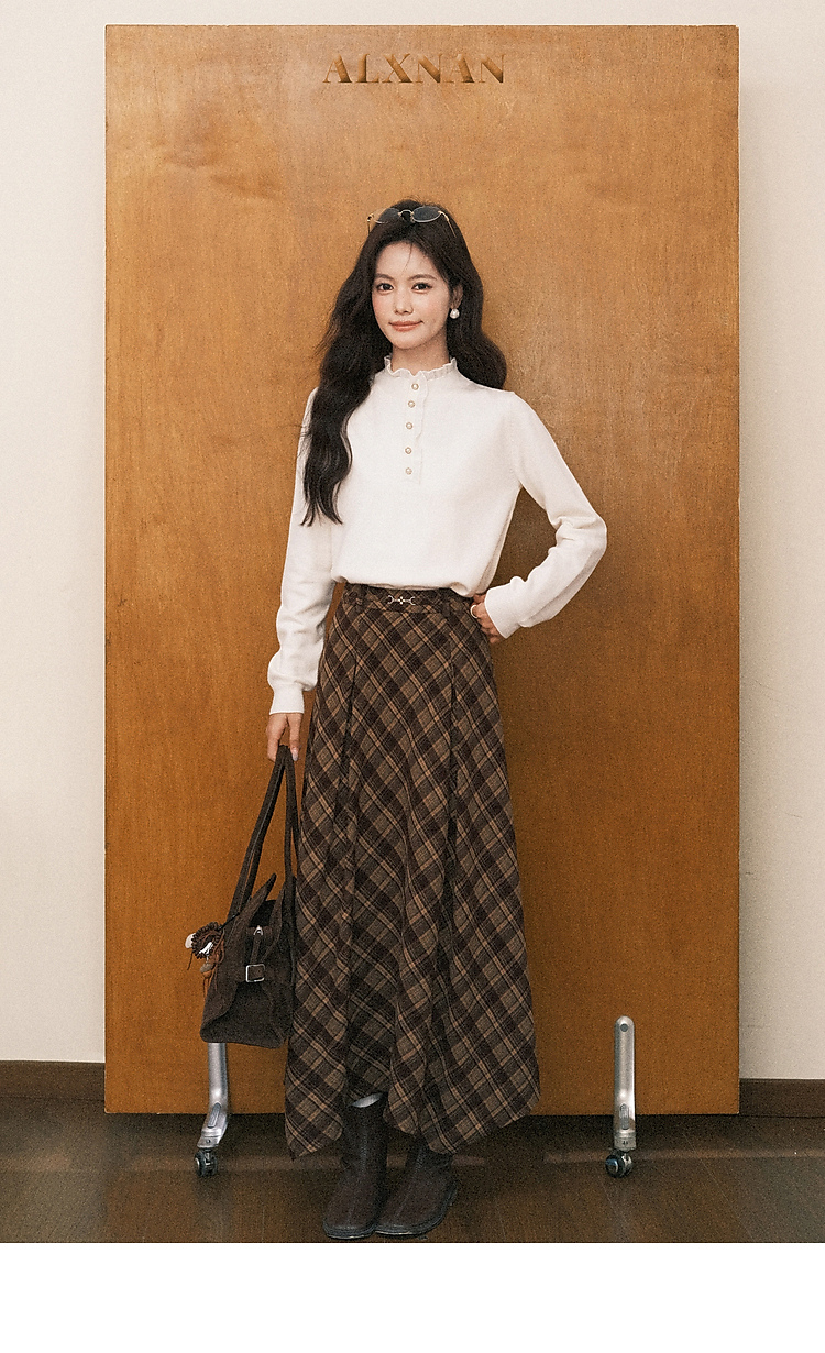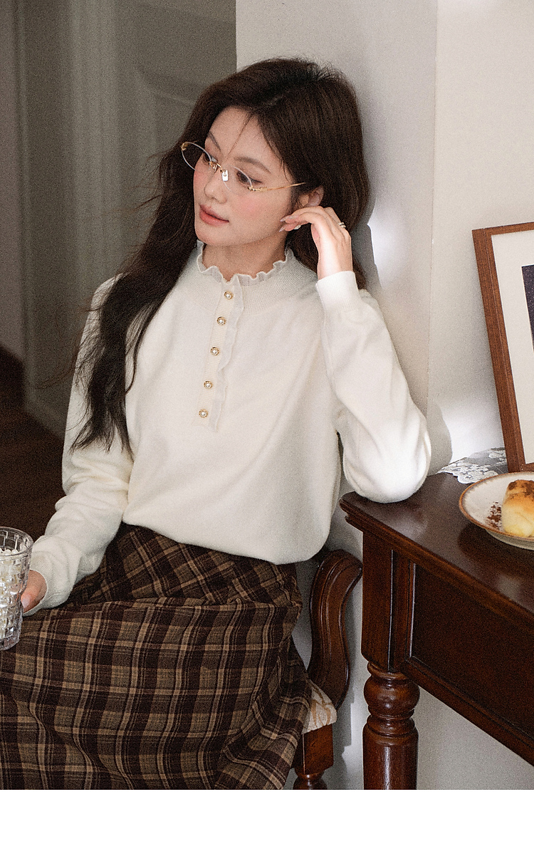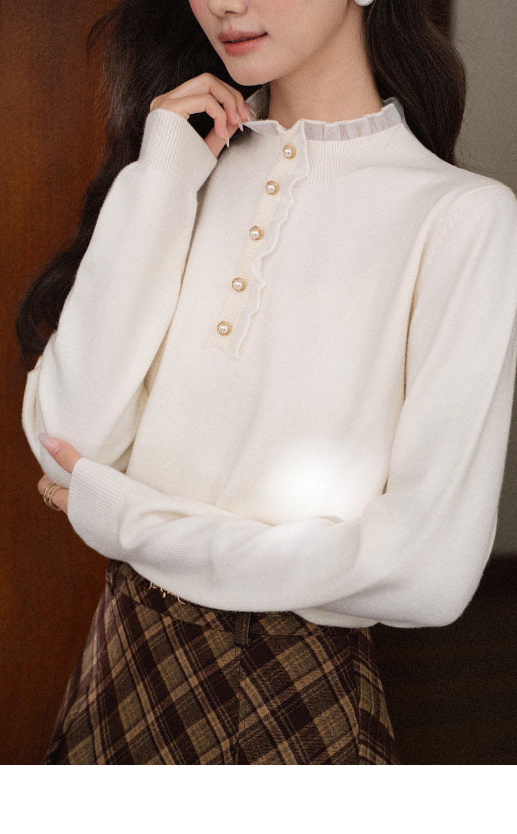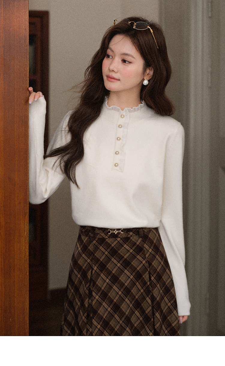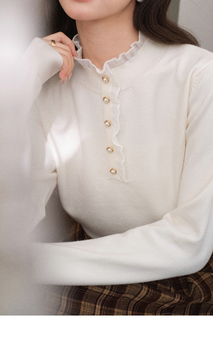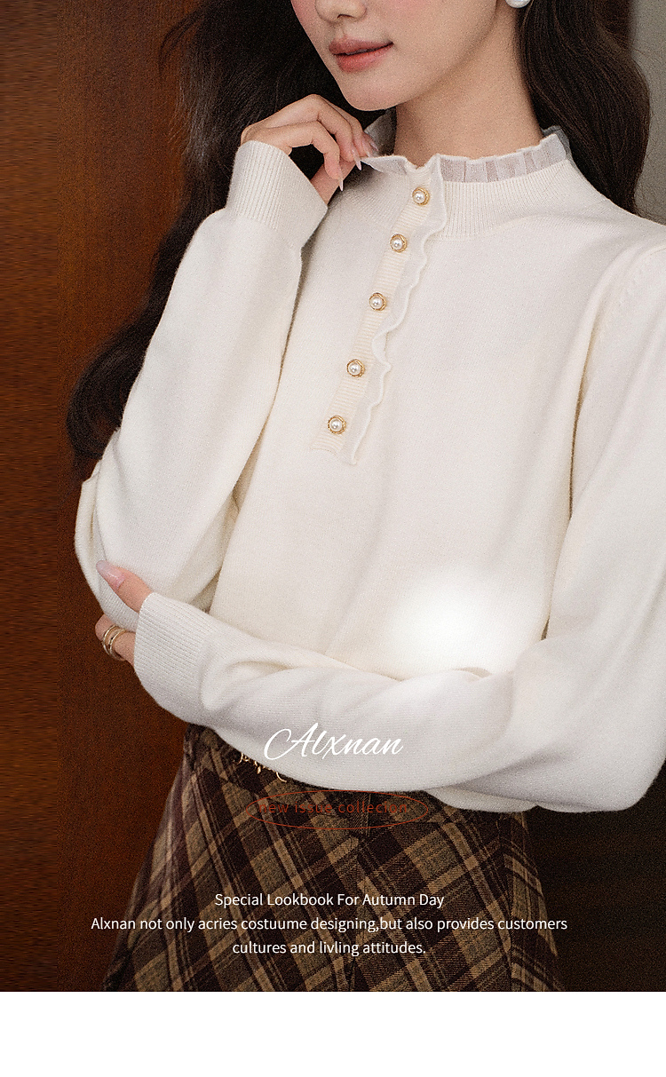 鹿向南「法式织语」浅杏色针织衫秋冬法式气质珍珠扣立领上衣女士