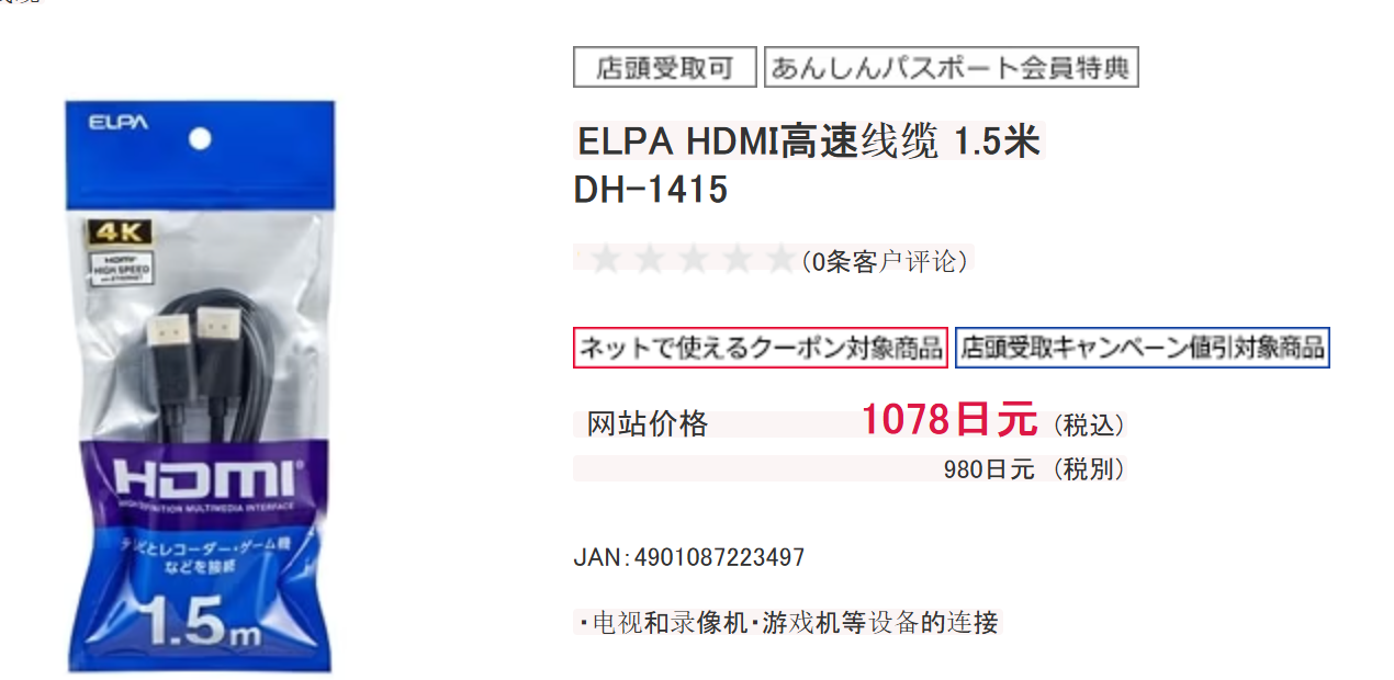日本 ELPA朝日电器 4K HDMI高清线 DH-1415 ( 1.5米)