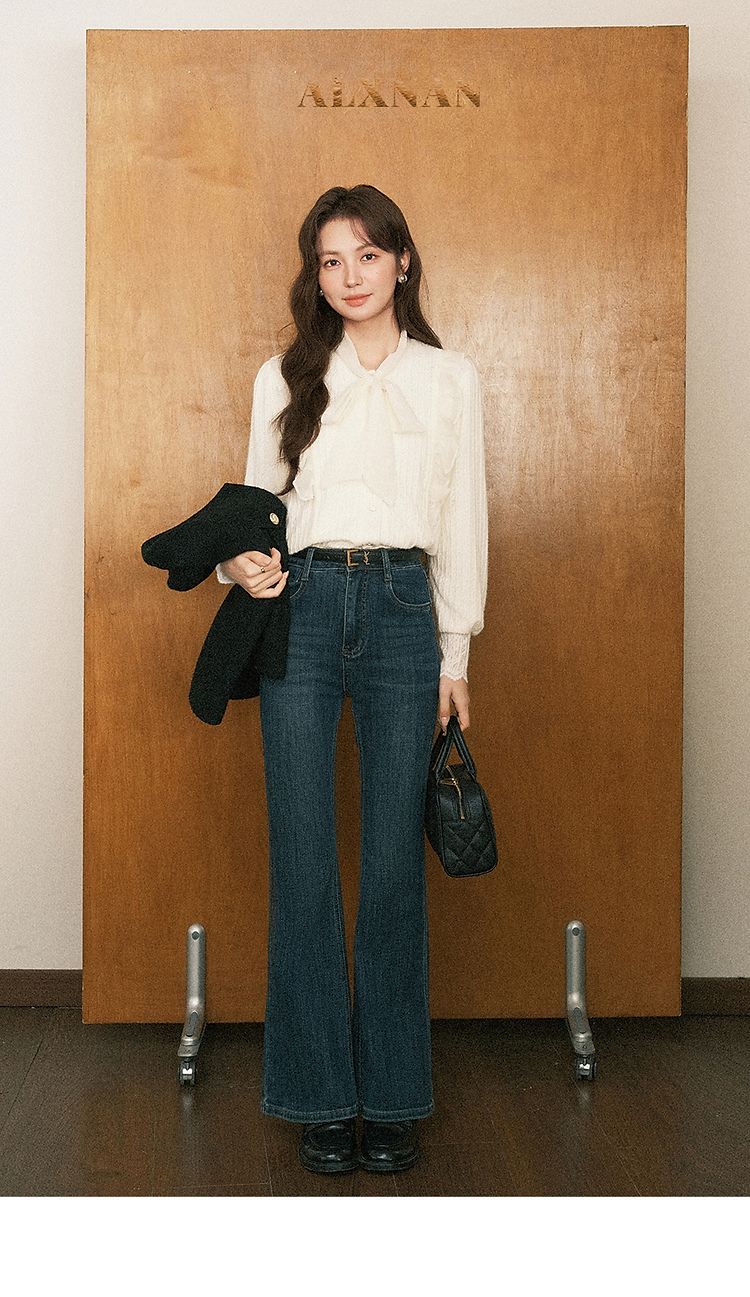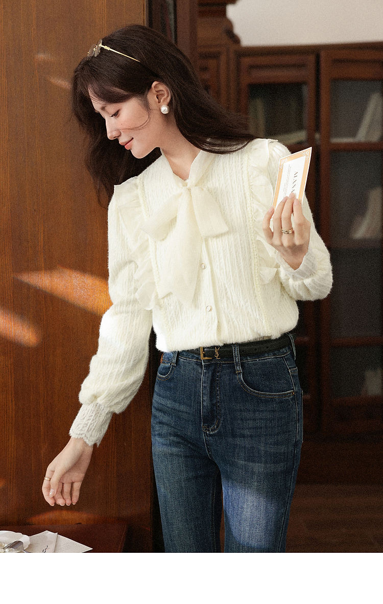 鹿向南「风吟秋日」法式杏色蝴蝶结蕾丝衬衫女秋温柔气质长袖上衣
