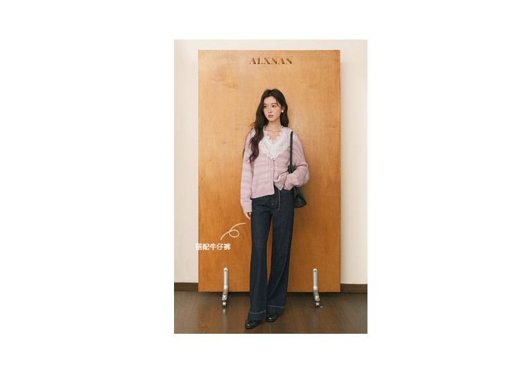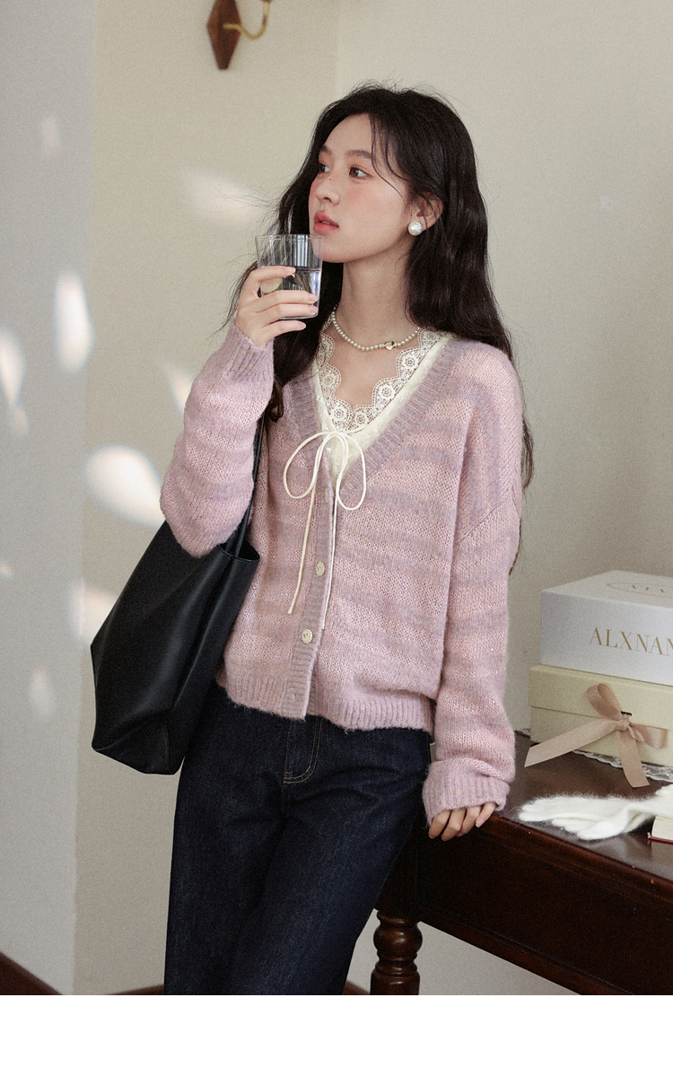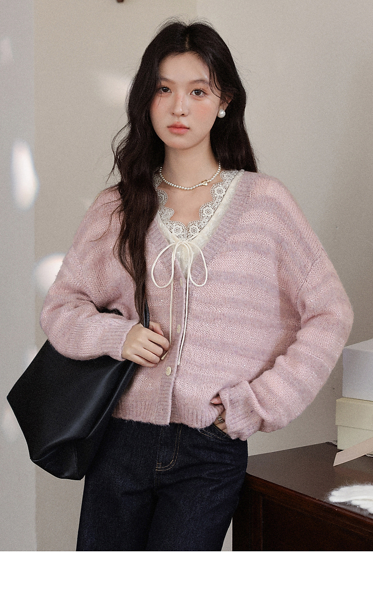 鹿向南「半岛弥香」法式拼接高级感粉色条纹V领毛衣开衫上衣女秋