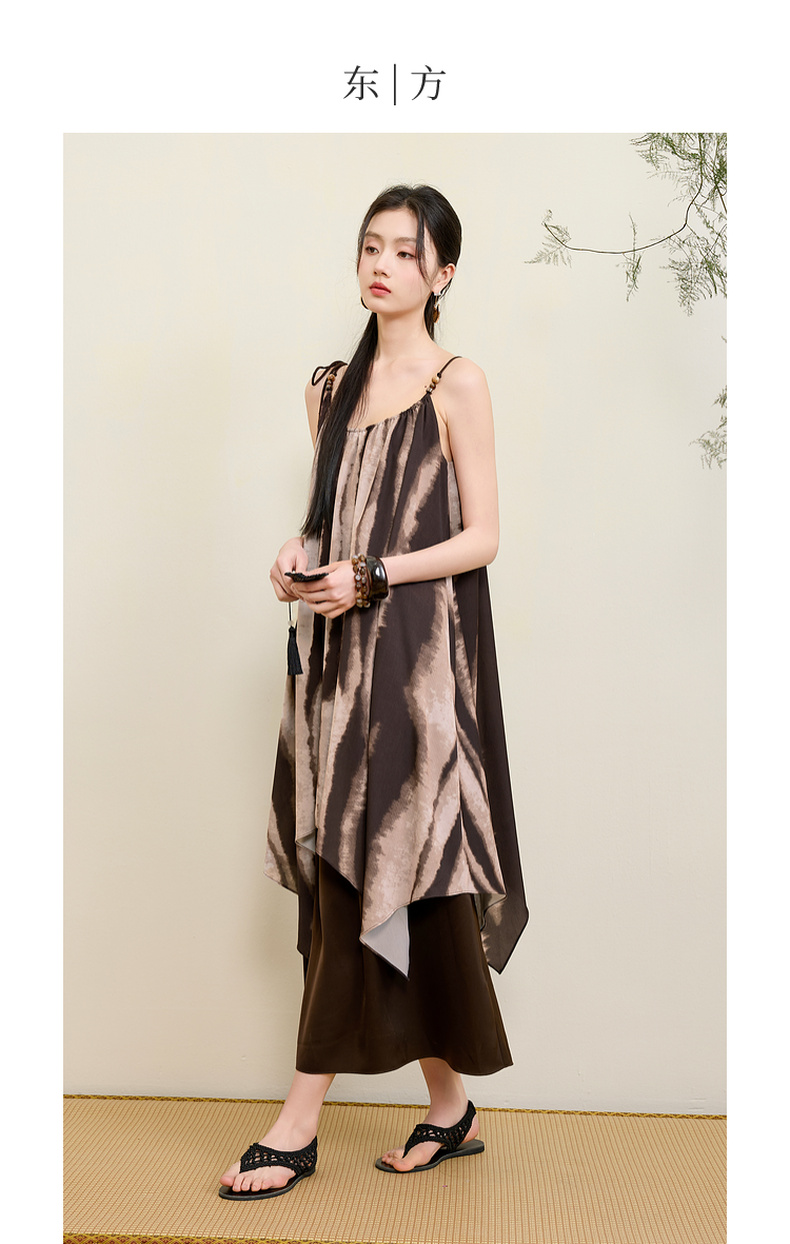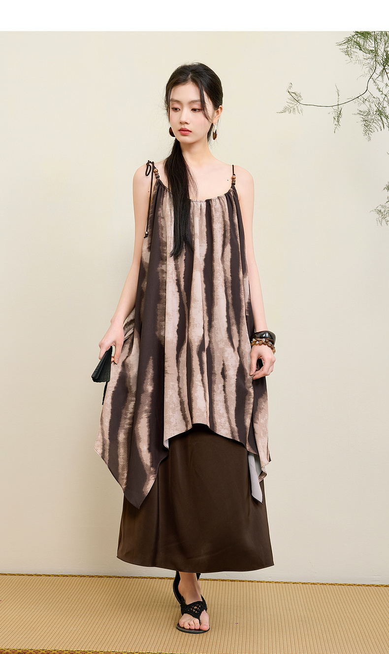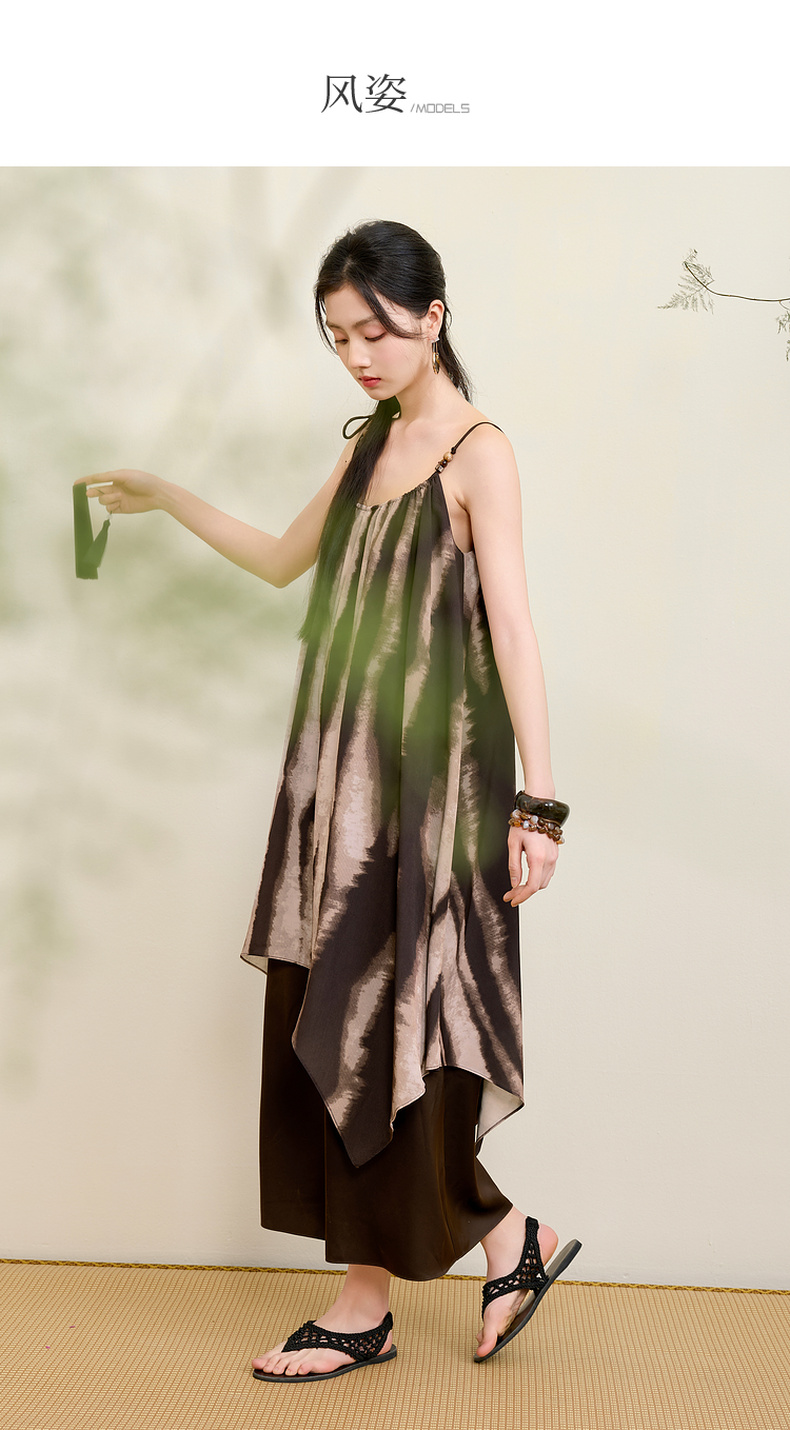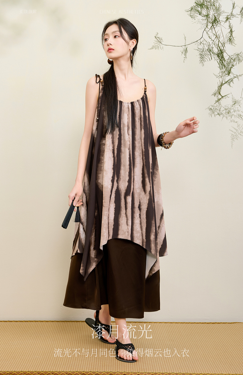 三彩【漆月流光】2025夏季新款新中式假两件吊带裙印花连衣裙C