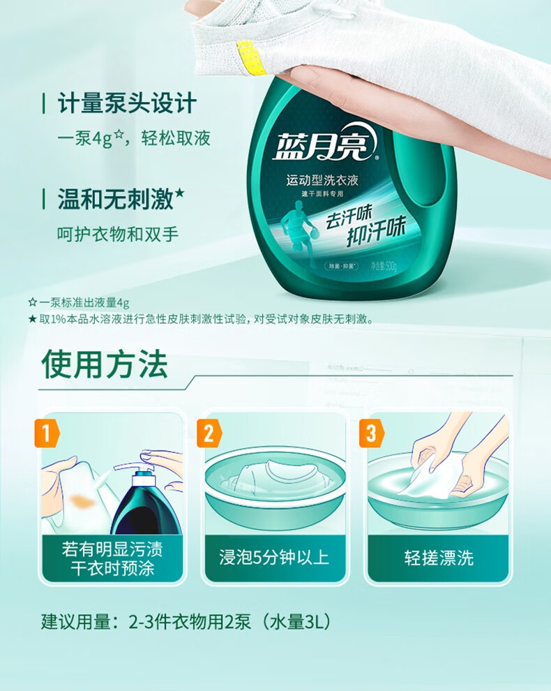 蓝月亮 洗衣液 10001939 青茶香运动型洗衣液(速干面料专用)泵装500g