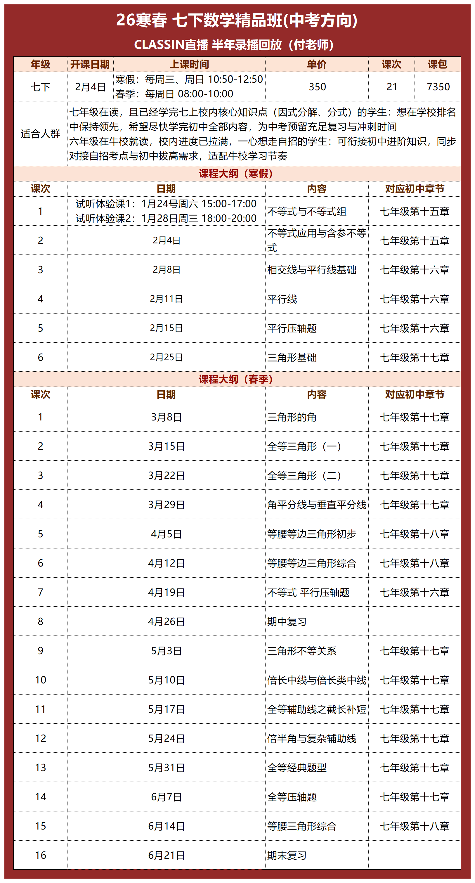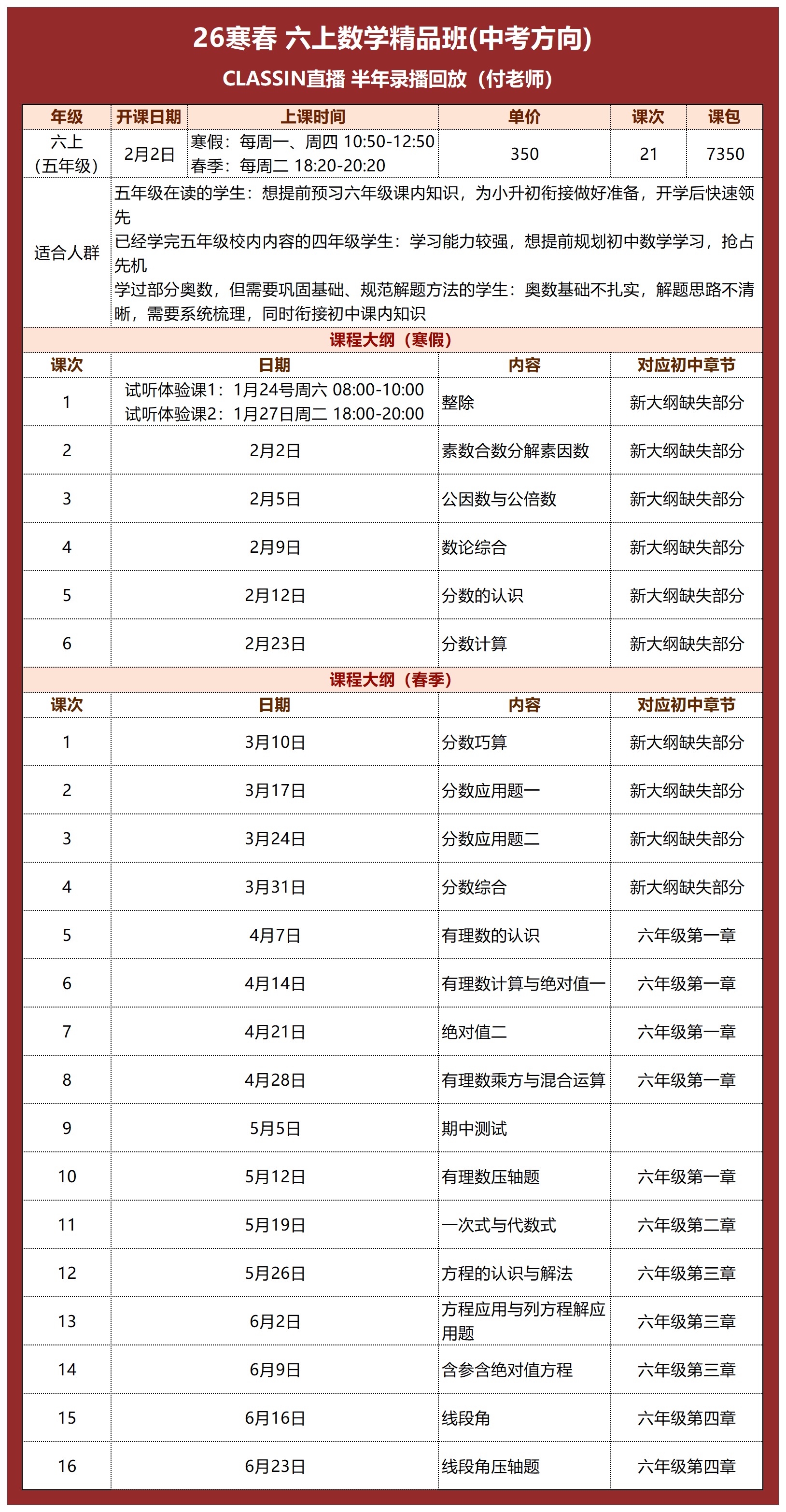 寒假5讲,春季16讲,一共21讲,350元/120分钟/讲