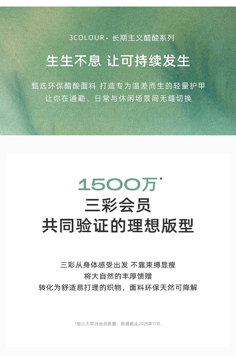 - 3COLOUR,一直致力于探索自我与时尚审美,用穿衣哲学折射生活主张,在流动中探寻恒久。