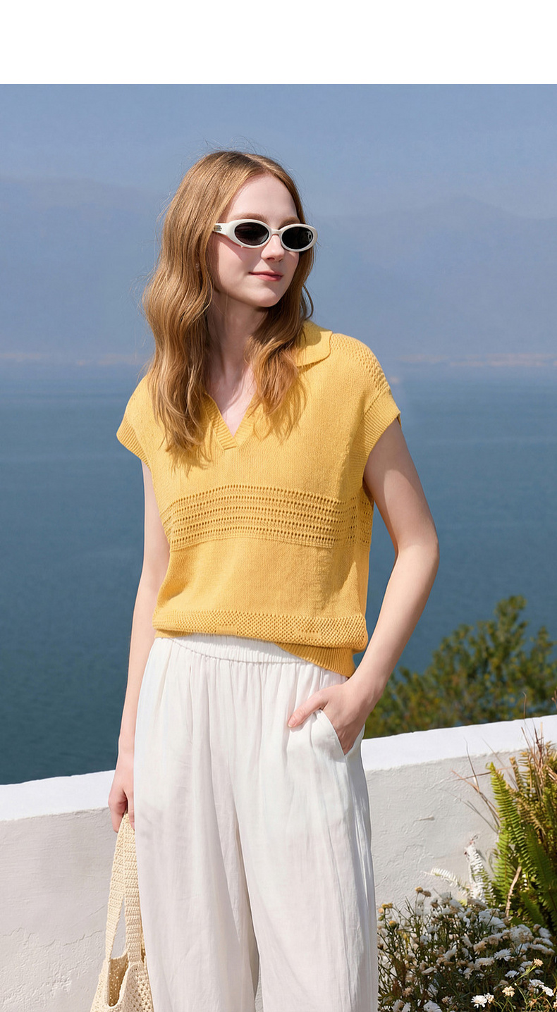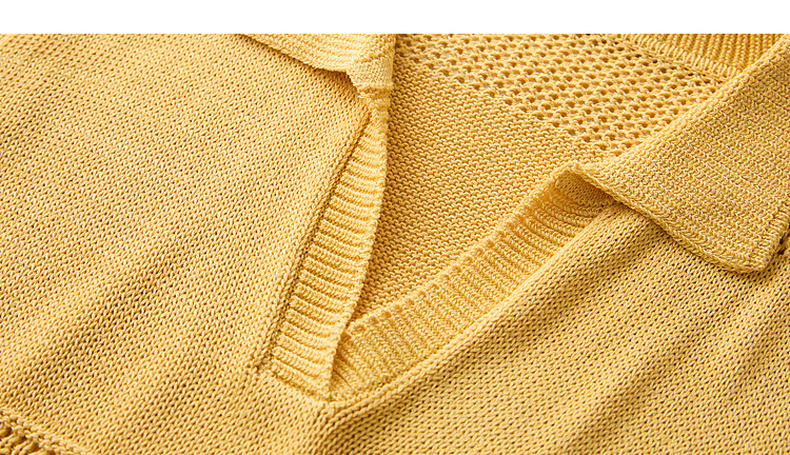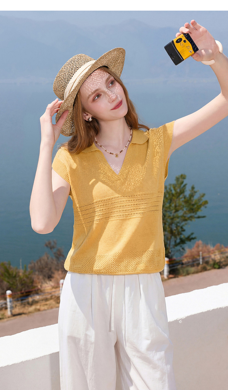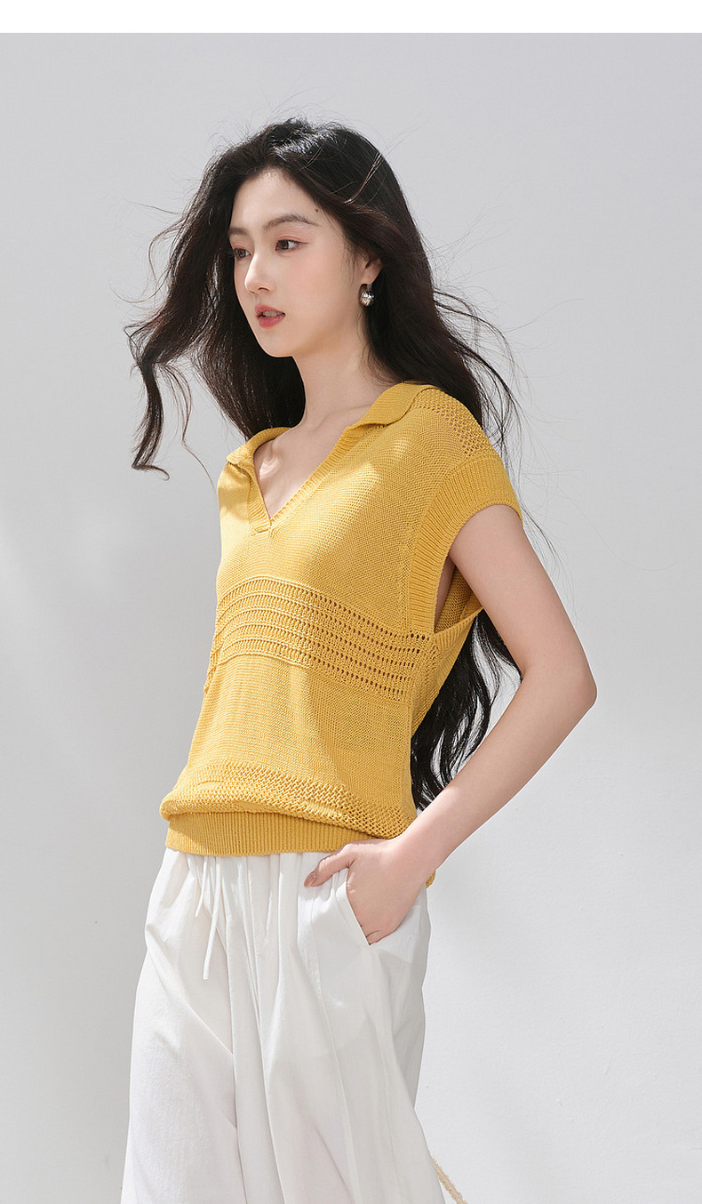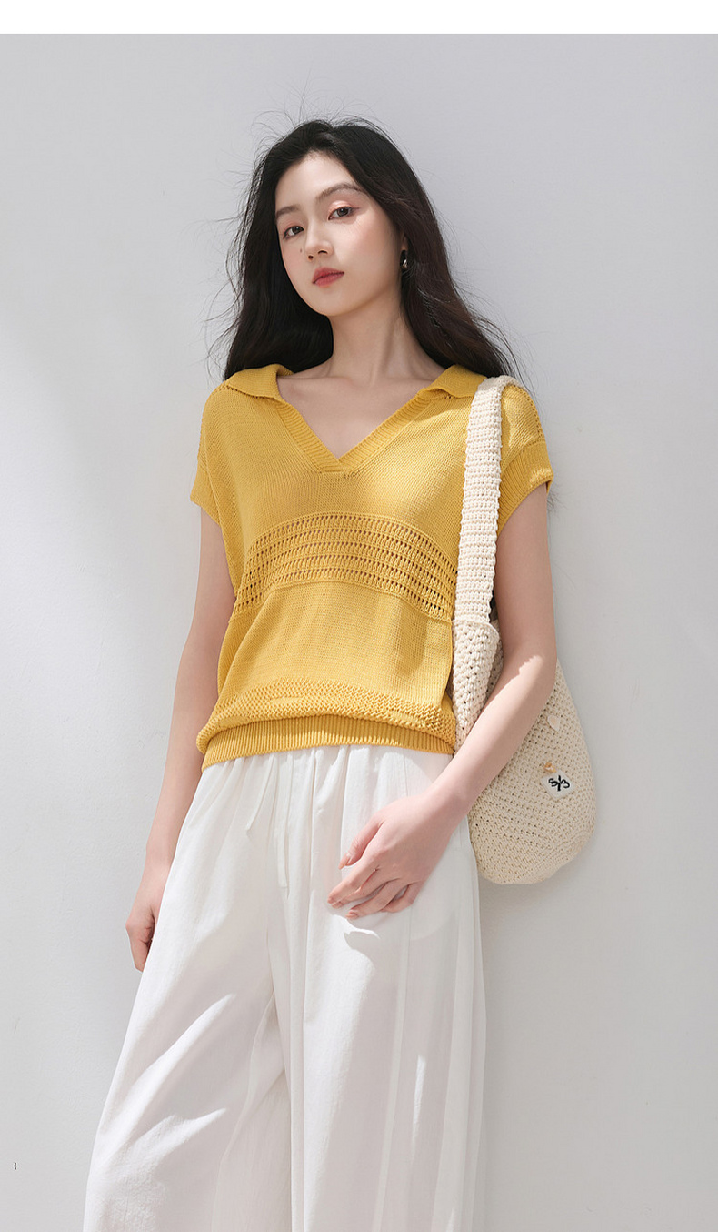三彩2026夏季新款镂空肌理针织衫Polo领毛衫简约气质上衣M