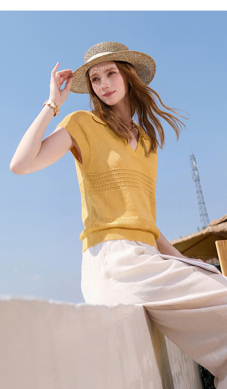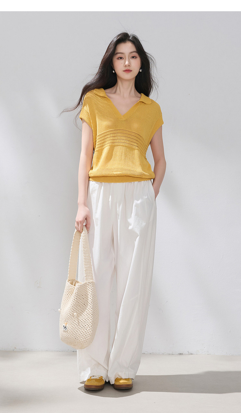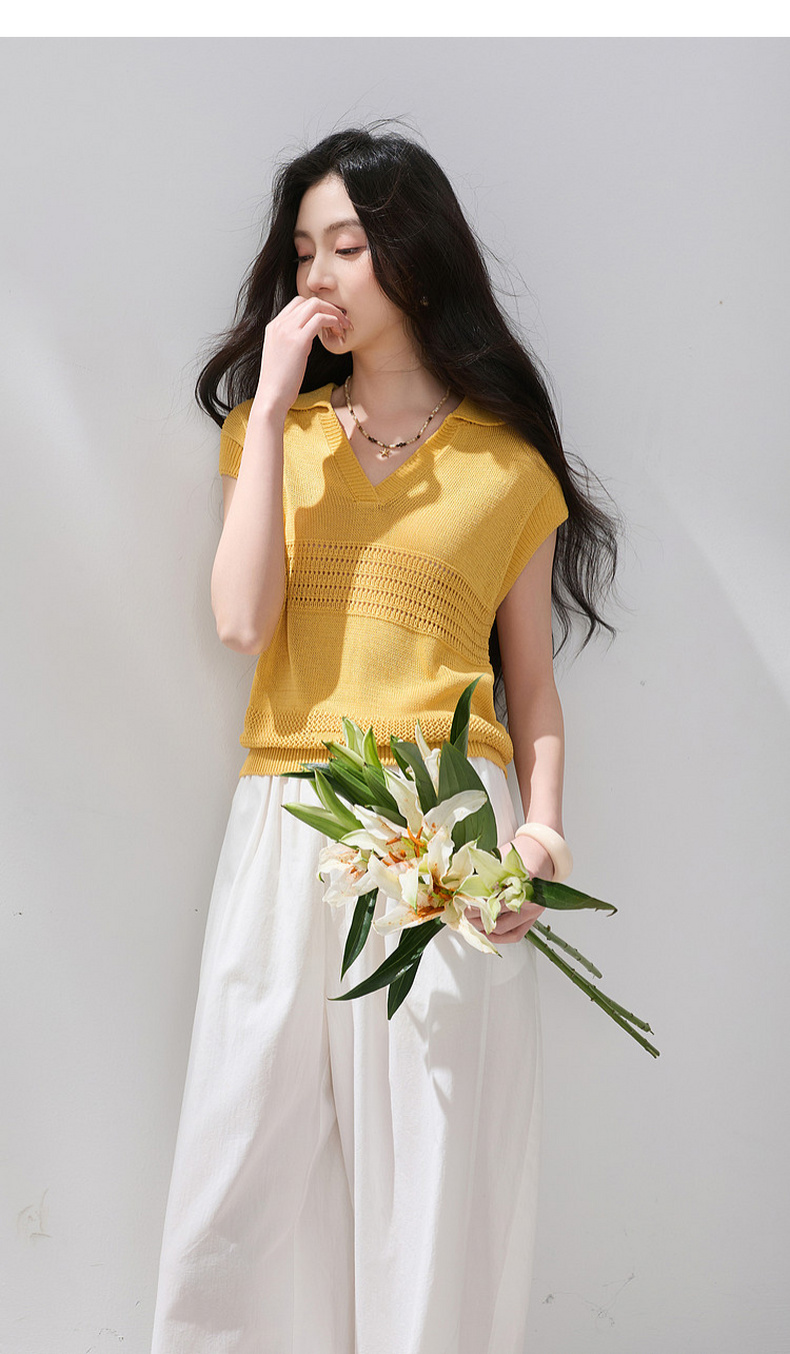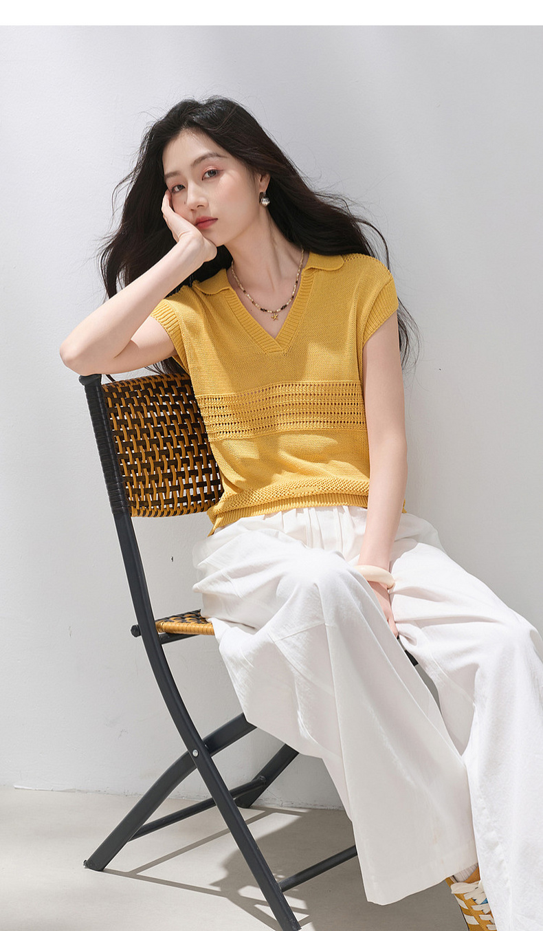 三彩2026夏季新款镂空肌理针织衫Polo领毛衫简约气质上衣M