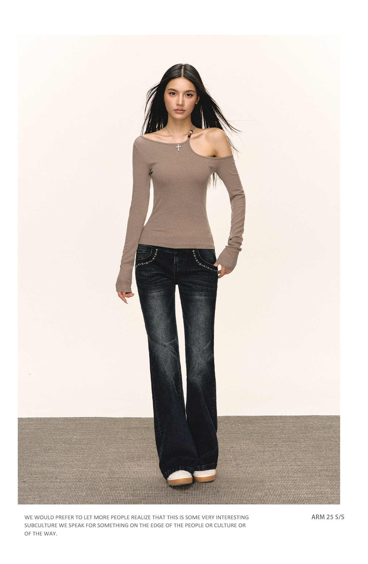 Ariseism 美式辣妹设计感一字肩长袖T恤女春季新款内搭修身上衣