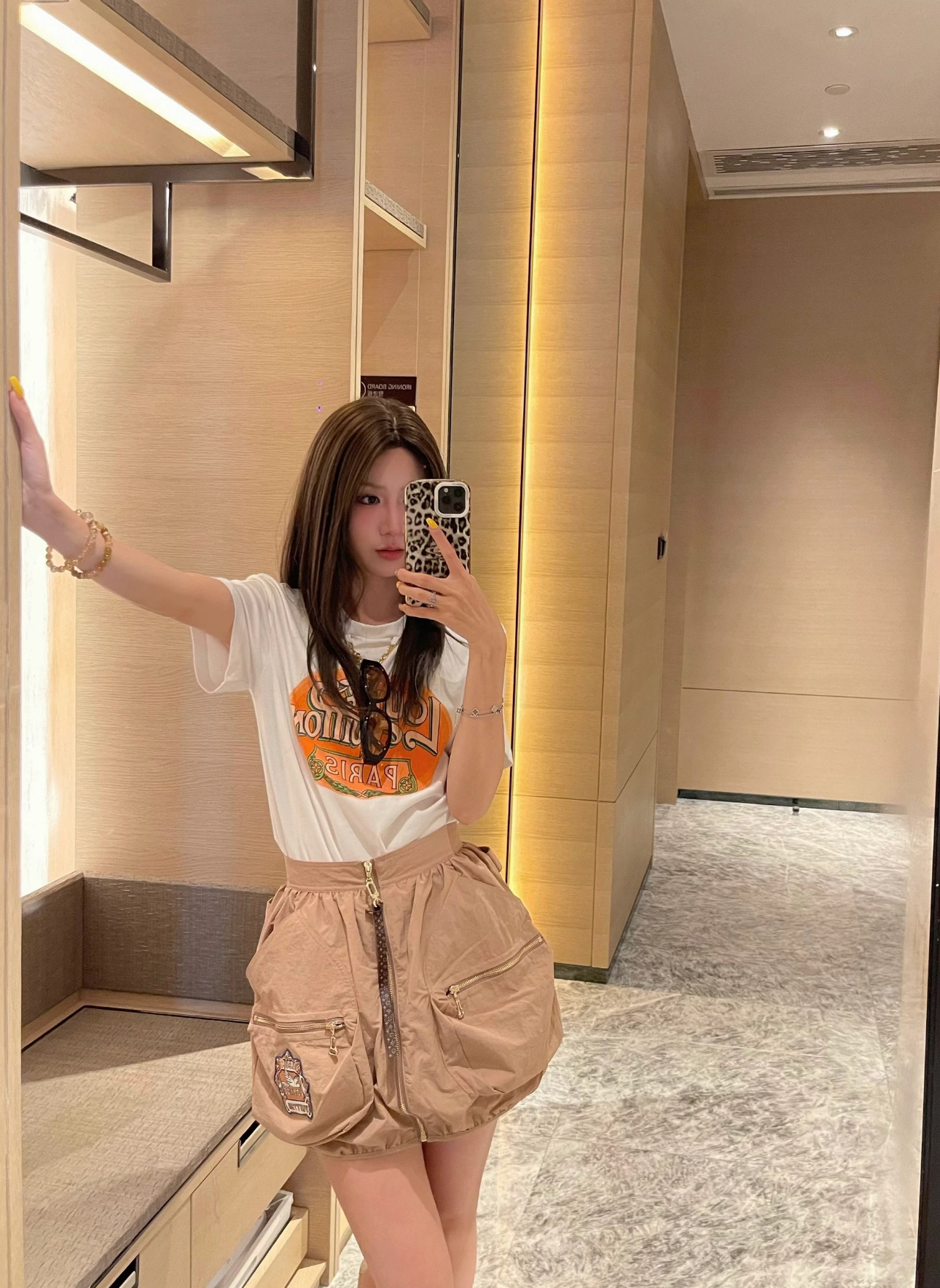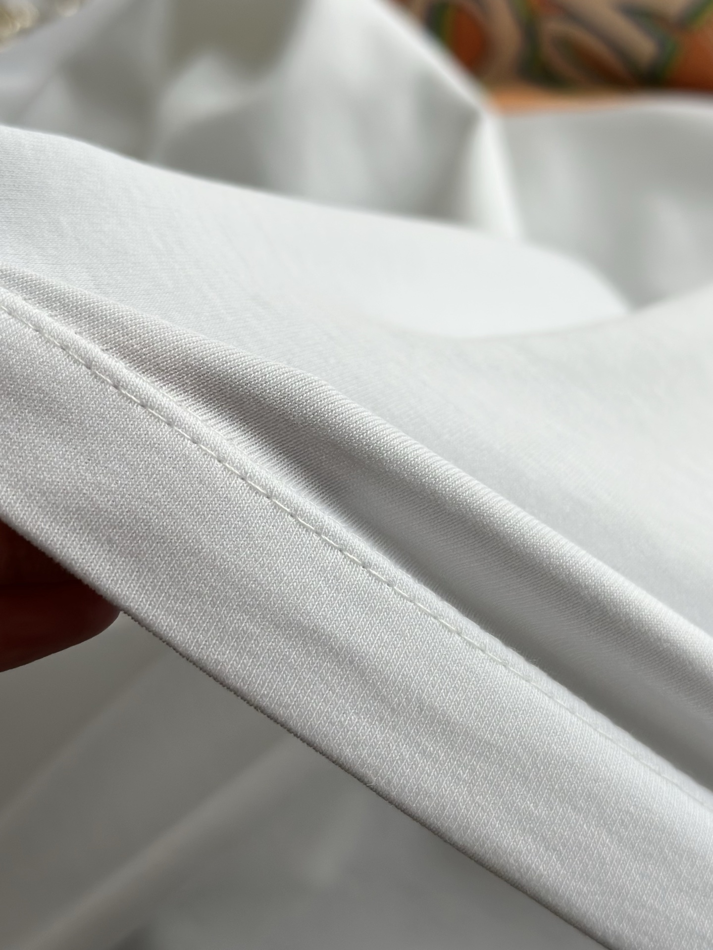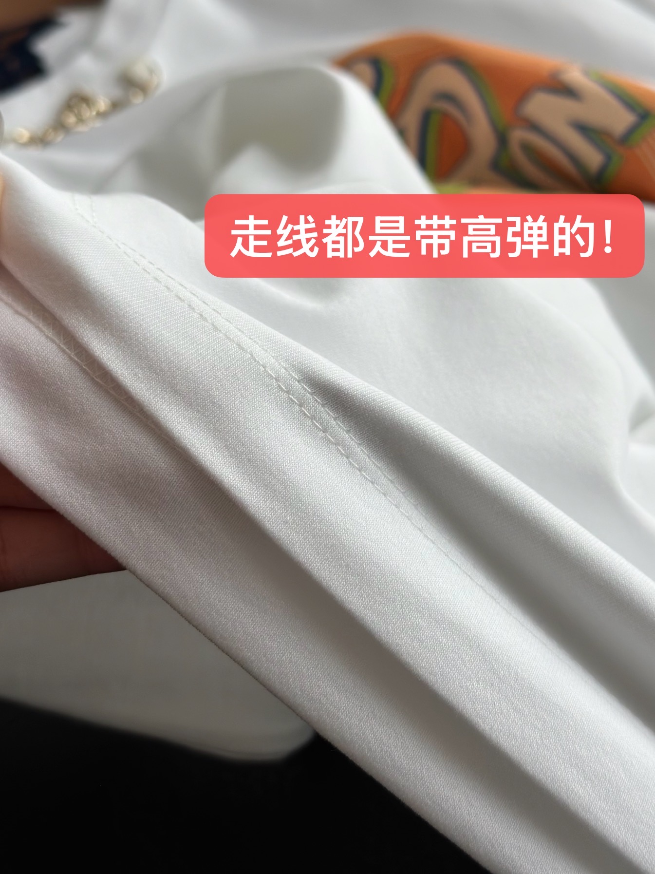 重点看面料❗️ 220gsm 50支双纱平纹布 这种面料最大的特点就在于它的透气性和舒适度更好,仿佛是一件会呼吸的tee!经过液氨处理手感更加更轻盈,面料丝滑有弹性,触感冰冰凉的,仿佛裹了一层云朵面膜,出汗也不粘腻,巨巨巨舒服