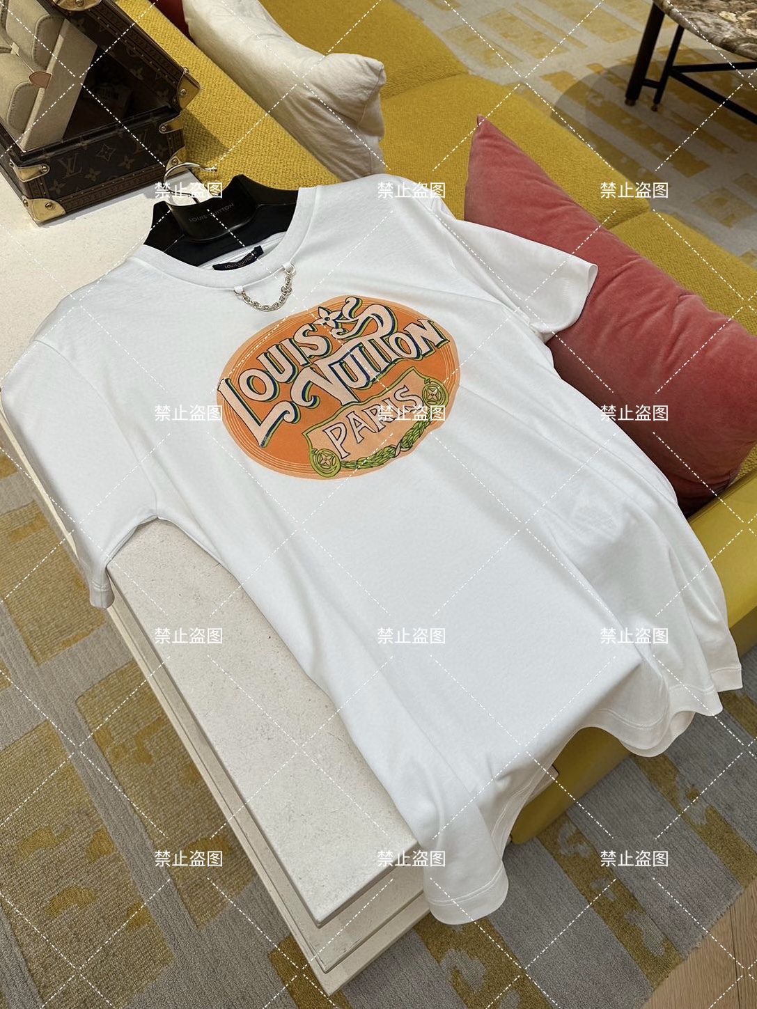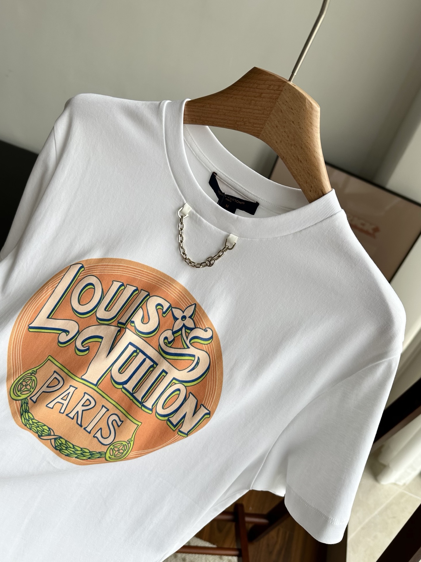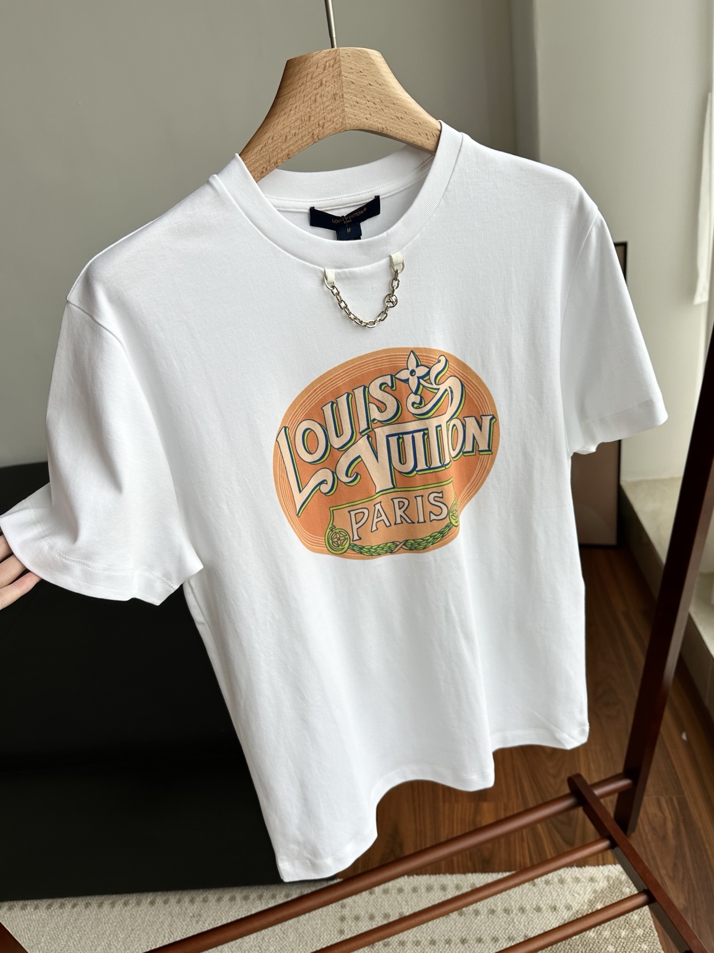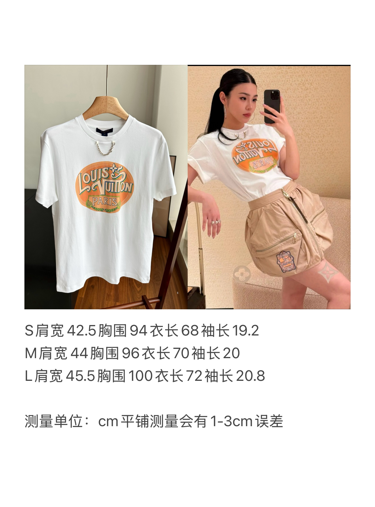 Lv 25夏装巴黎旅行印章T恤 全新夏季巴黎旅行印章T恤,面料为100%全棉50支纱220克双面平纹布料,其面料特性就是舒适柔软透气,印花采用康利全棉活性透气数码印花,印完花后在整个印花上的宝蓝色部位又加一层光亮的油光浆料,加了这层工艺后印花效果会更加光亮更特殊一点,领口的浅金色lv镀金链一直是lv的女款T恤百搭的经典装饰! 码数:S/M/L