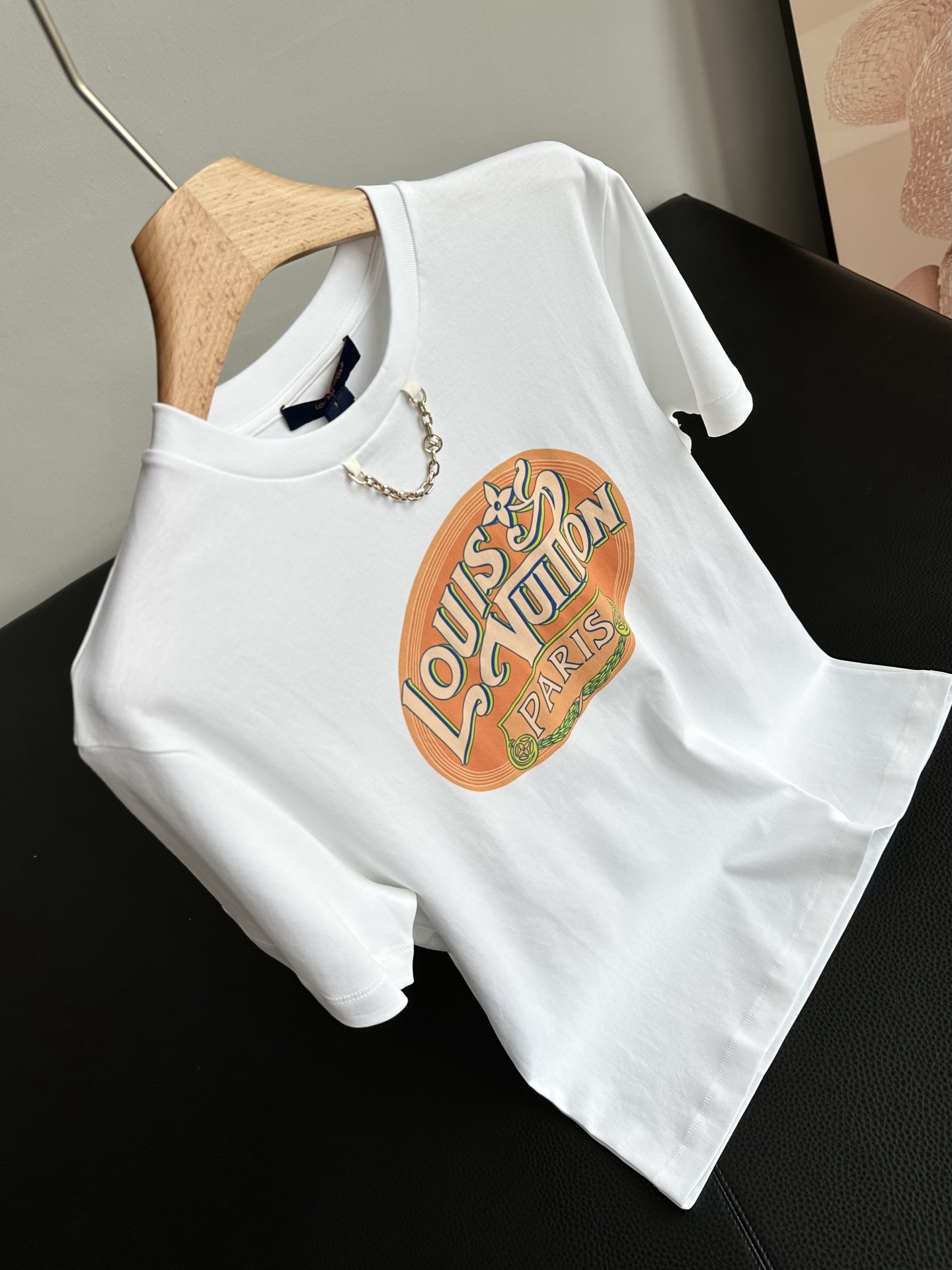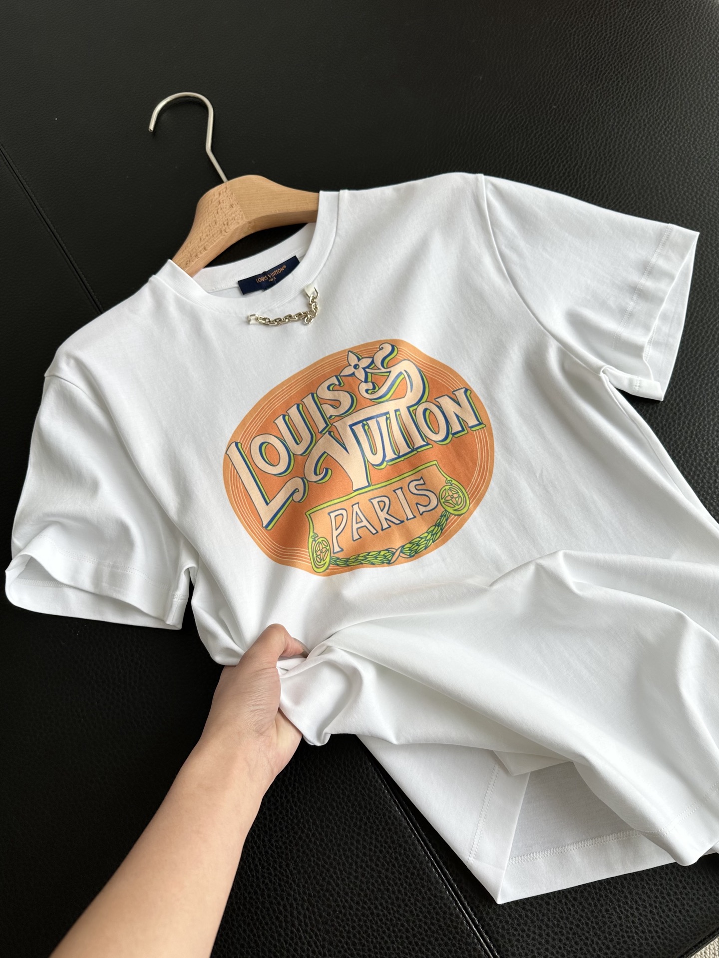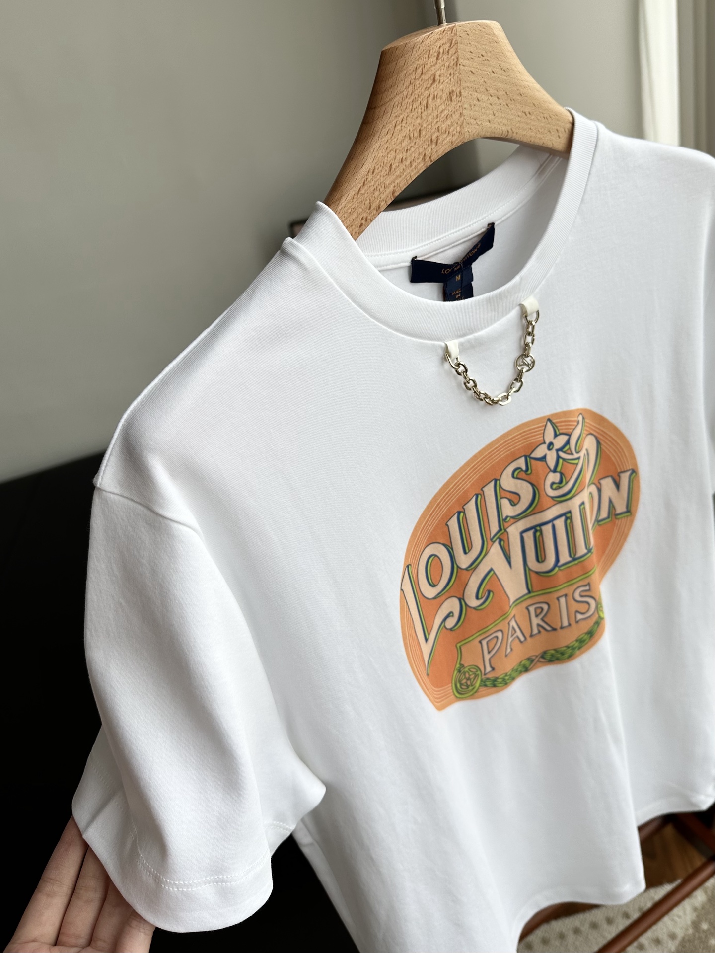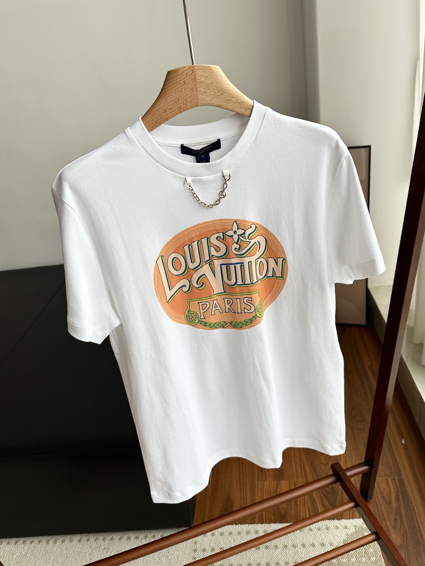 Lv 25夏装巴黎旅行印章T恤 全新夏季巴黎旅行印章T恤,面料为100%全棉50支纱220克双面平纹布料,其面料特性就是舒适柔软透气,印花采用康利全棉活性透气数码印花,印完花后在整个印花上的宝蓝色部位又加一层光亮的油光浆料,加了这层工艺后印花效果会更加光亮更特殊一点,领口的浅金色lv镀金链一直是lv的女款T恤百搭的经典装饰! 码数:S/M/L