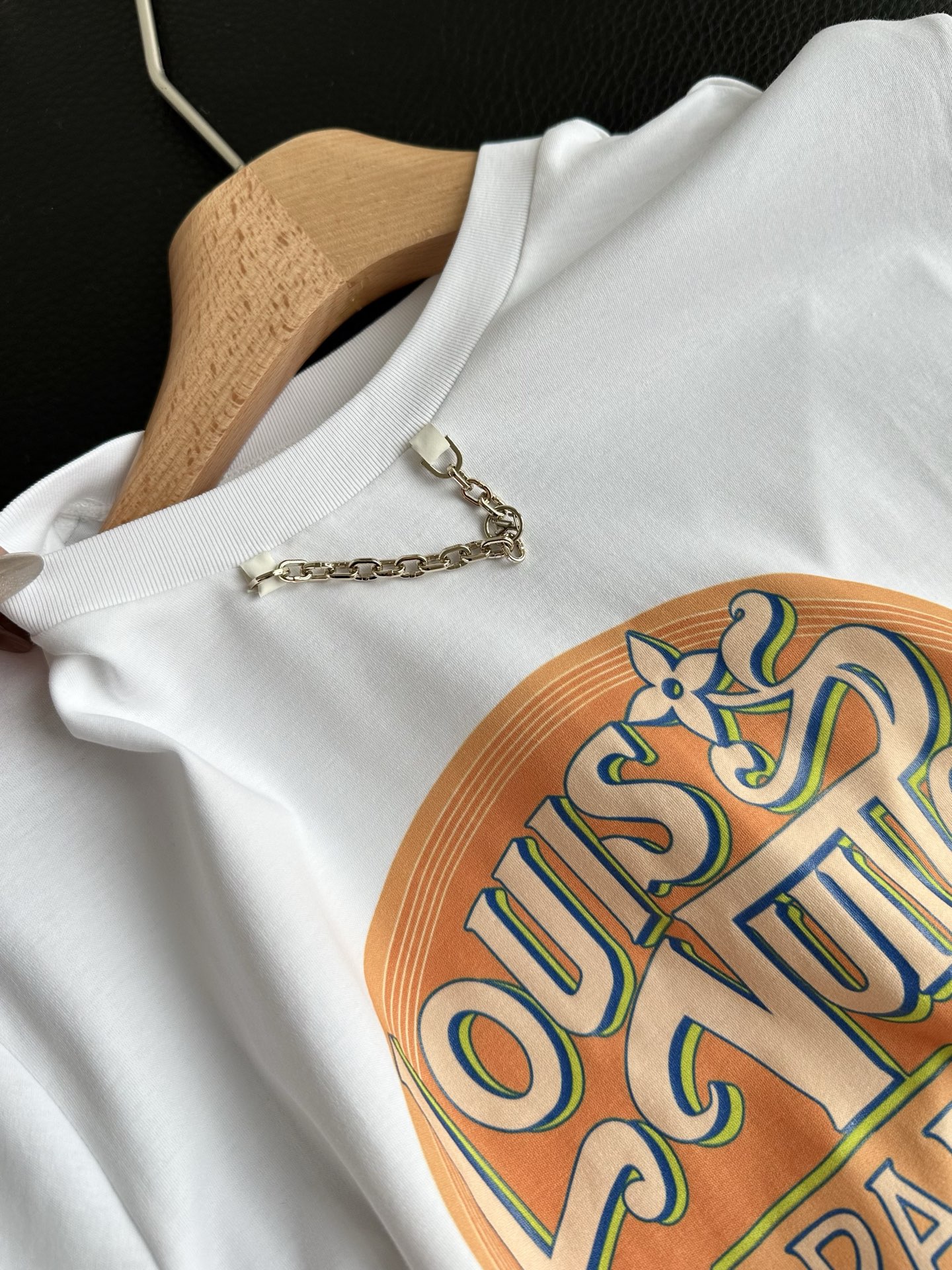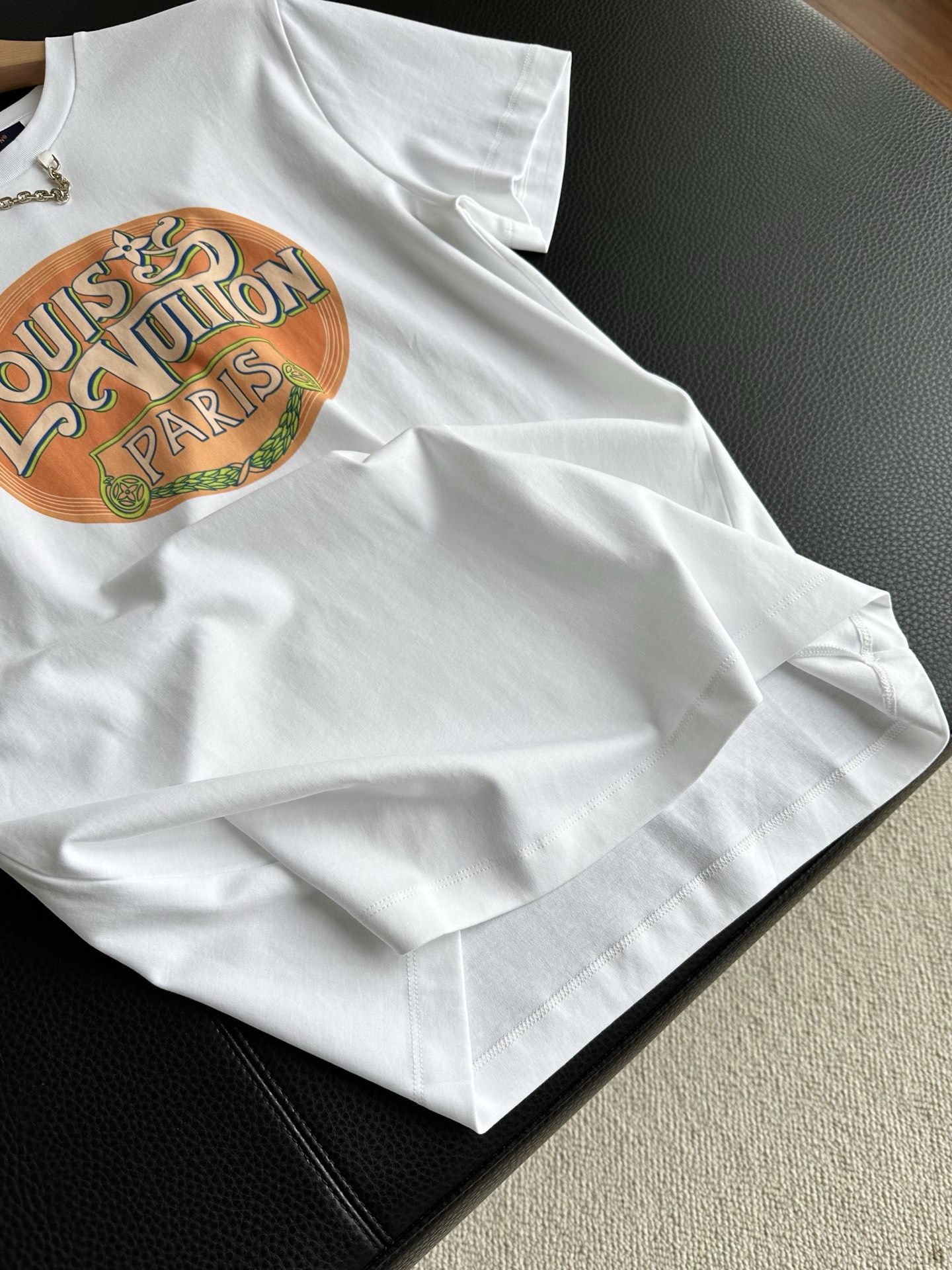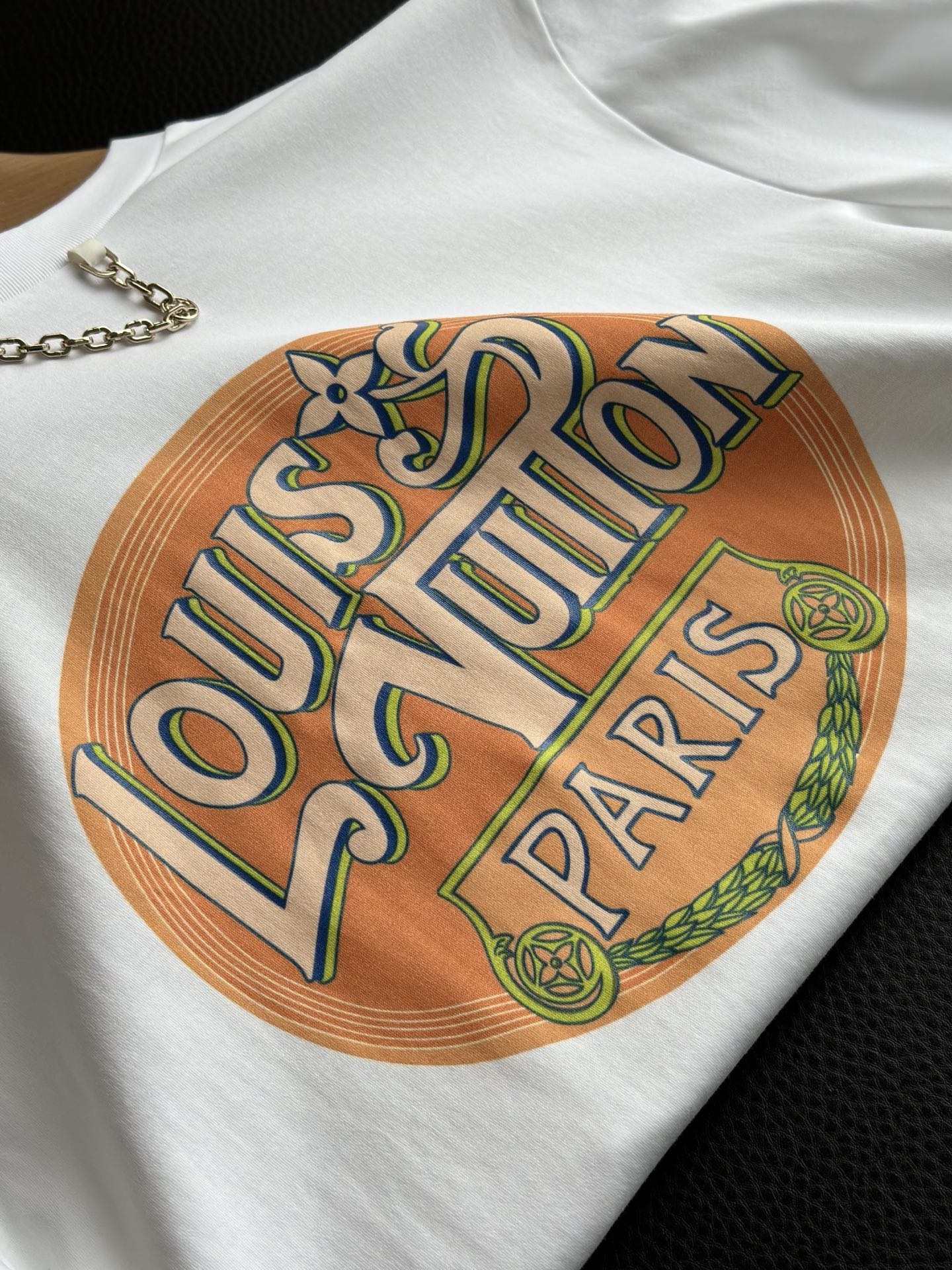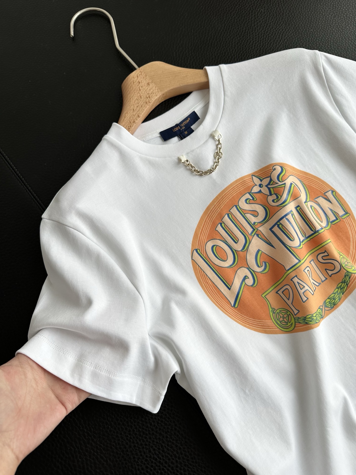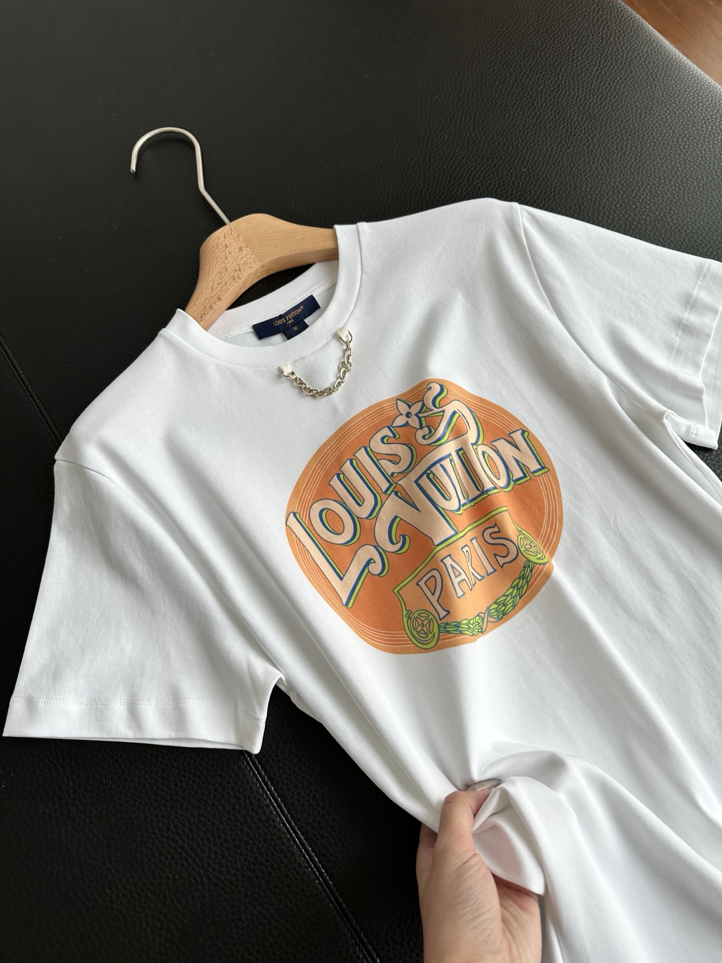 Lv 25夏装巴黎旅行印章T恤 全新夏季巴黎旅行印章T恤,面料为100%全棉50支纱220克双面平纹布料,其面料特性就是舒适柔软透气,印花采用康利全棉活性透气数码印花,印完花后在整个印花上的宝蓝色部位又加一层光亮的油光浆料,加了这层工艺后印花效果会更加光亮更特殊一点,领口的浅金色lv镀金链一直是lv的女款T恤百搭的经典装饰! 码数:S/M/L
