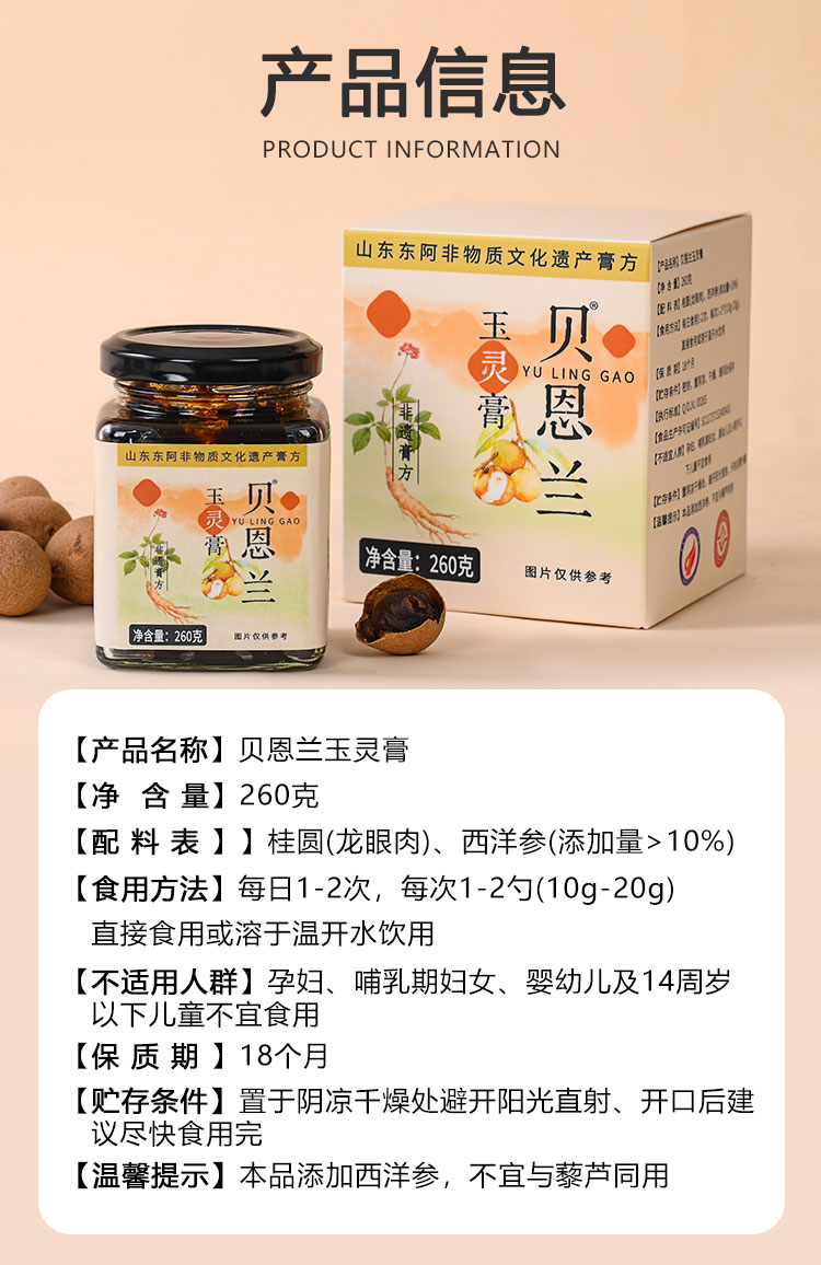 贝恩兰玉灵膏蒸桂圆补气养血安神助眠西洋参玉灵膏气色官方旗舰店