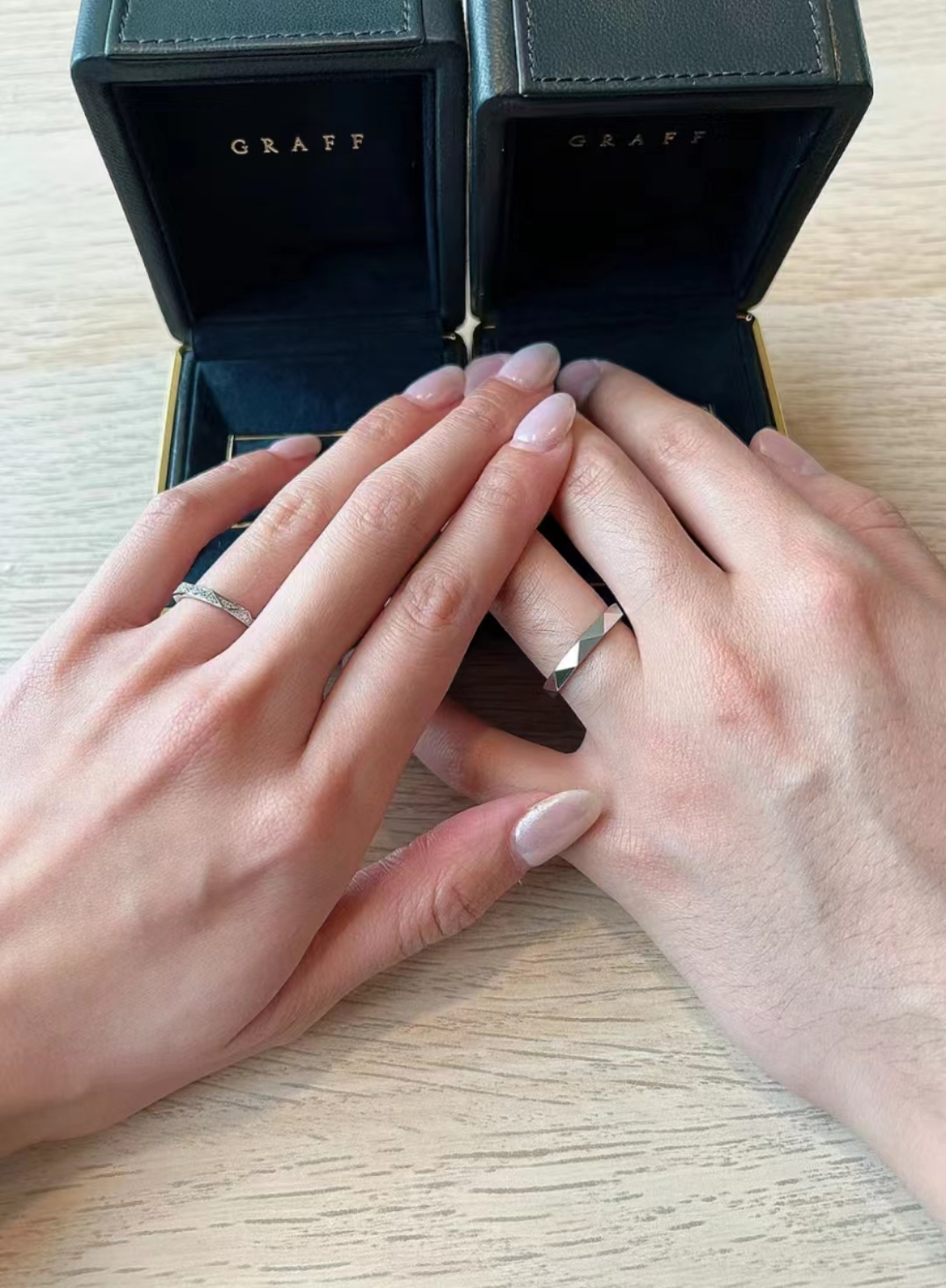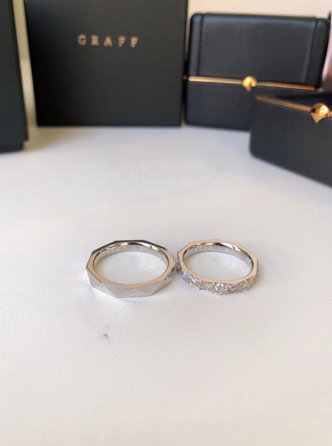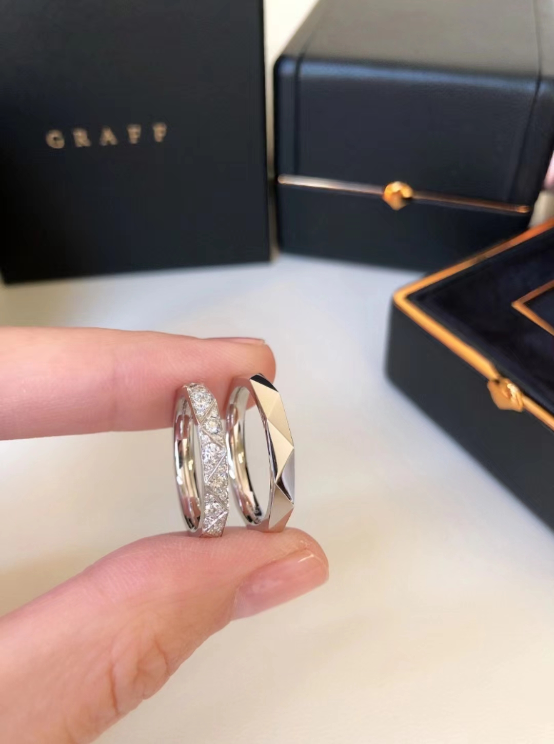格拉夫真的是低调的奢华,唯有格拉夫让我眼前一亮,切割菱格纹,让戒指更有结构感,满钻女戒柔和的菱角,上手好看优雅,男戒几何造型很有现代感。