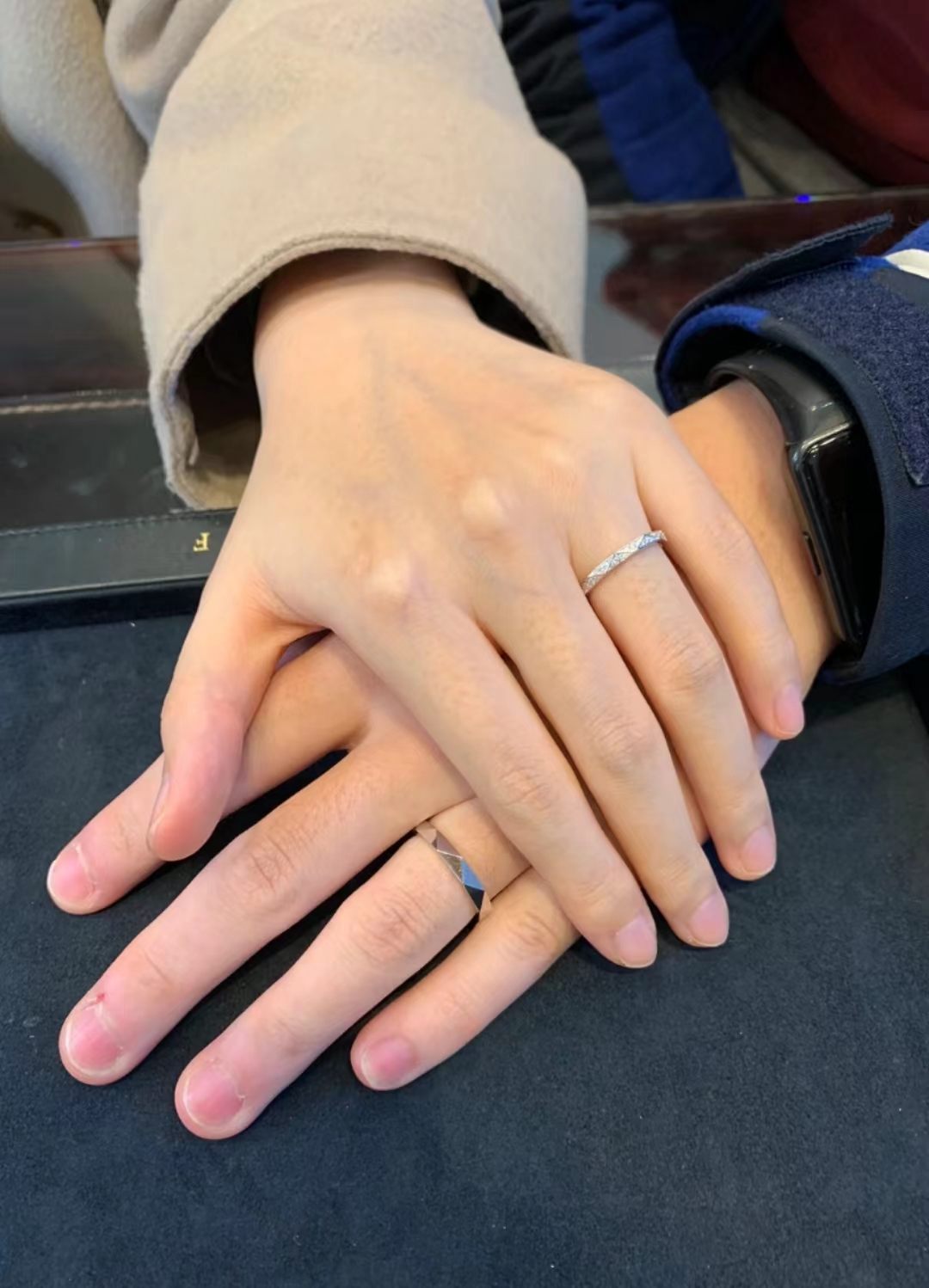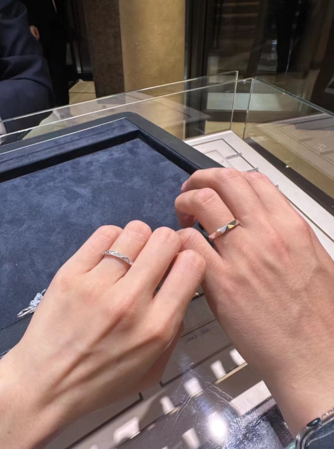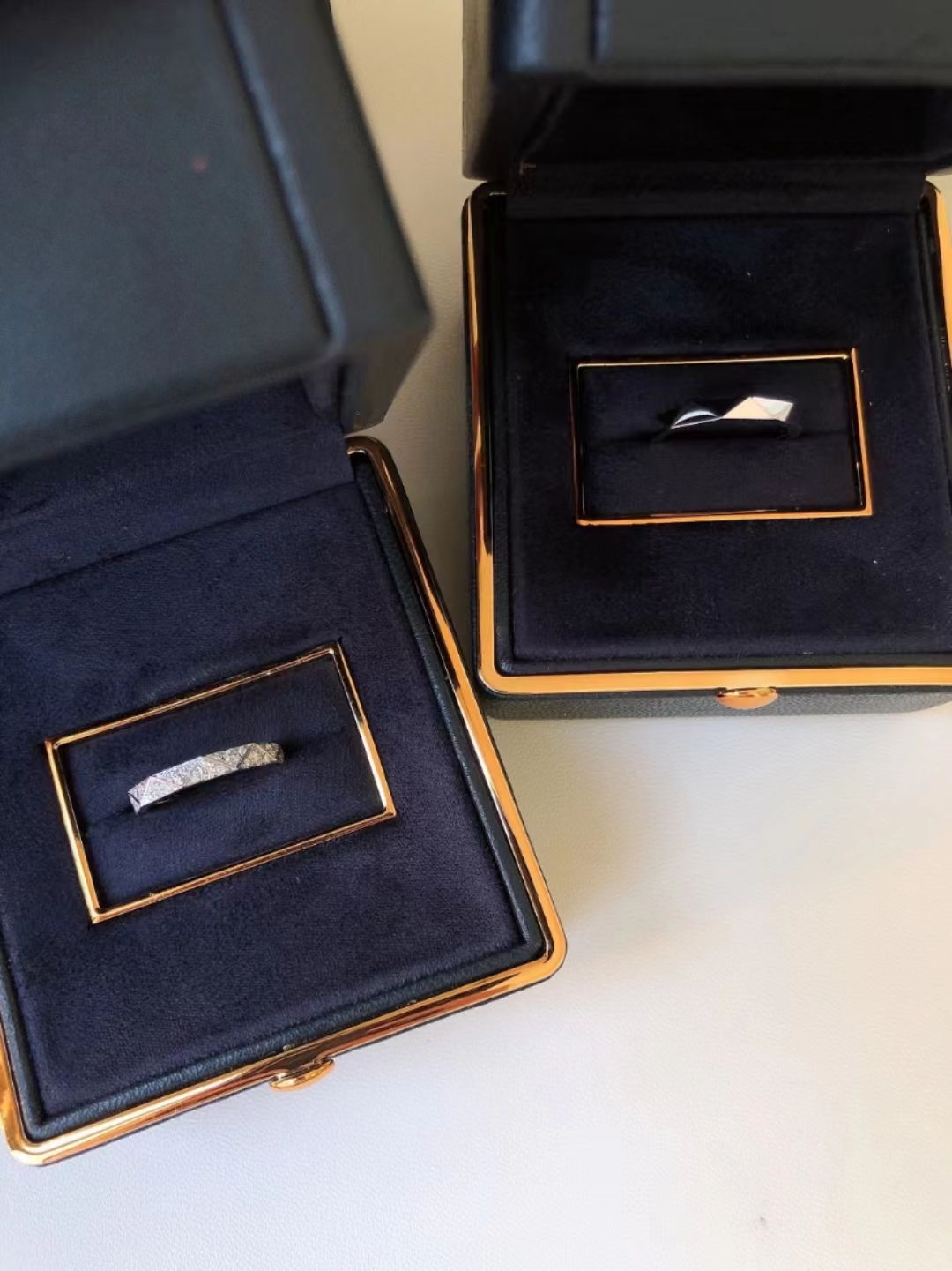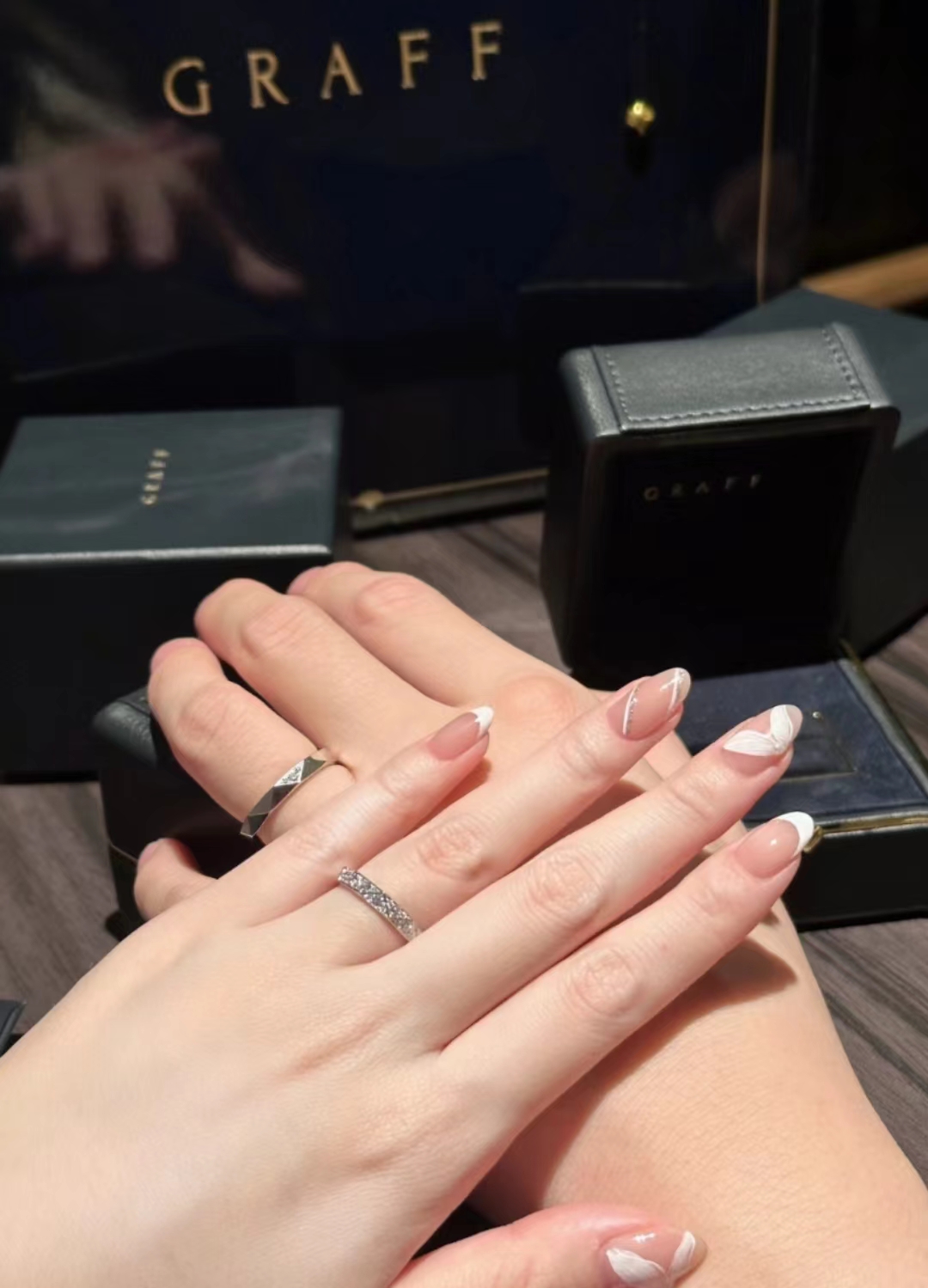 格拉夫真的是低调的奢华,唯有格拉夫让我眼前一亮,切割菱格纹,让戒指更有结构感,满钻女戒柔和的菱角,上手好看优雅,男戒几何造型很有现代感。
