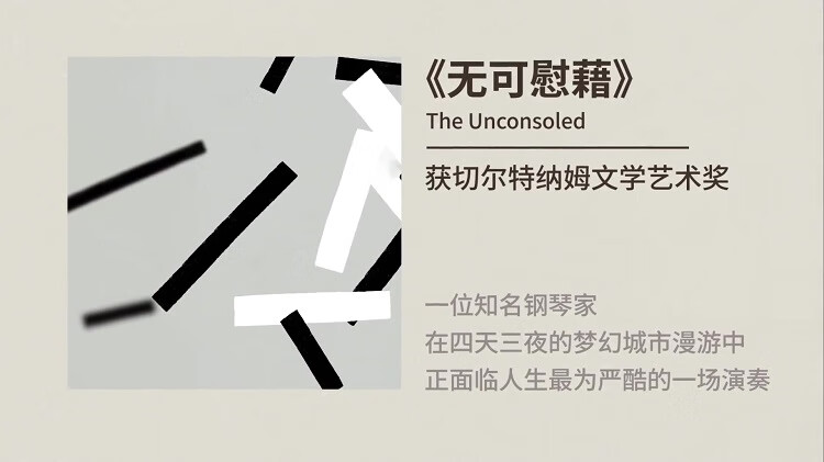 《无可慰藉》是石黑一雄篇幅的一部作品,一部极尽绵密细腻、令人难以自拔的心理奇作。本书秉承石?一雄的一贯风格,外表清淡,内心强大。描写一位钢琴演奏家在一座谜样的城市里所经历的谜样的几天。他忽而是旁观者,忽而又被卷入其中,所见之人无不一往情深却又执迷不悟;所遇之事无不怪异荒诞,充满变数。在这座人心为怪诞的艺术价值观所左右的城市里,在努力寻找梦境出口,为这一切寻求解释的过程中,他渐渐意识到自己正面临人生最为严酷的一场演奏。
