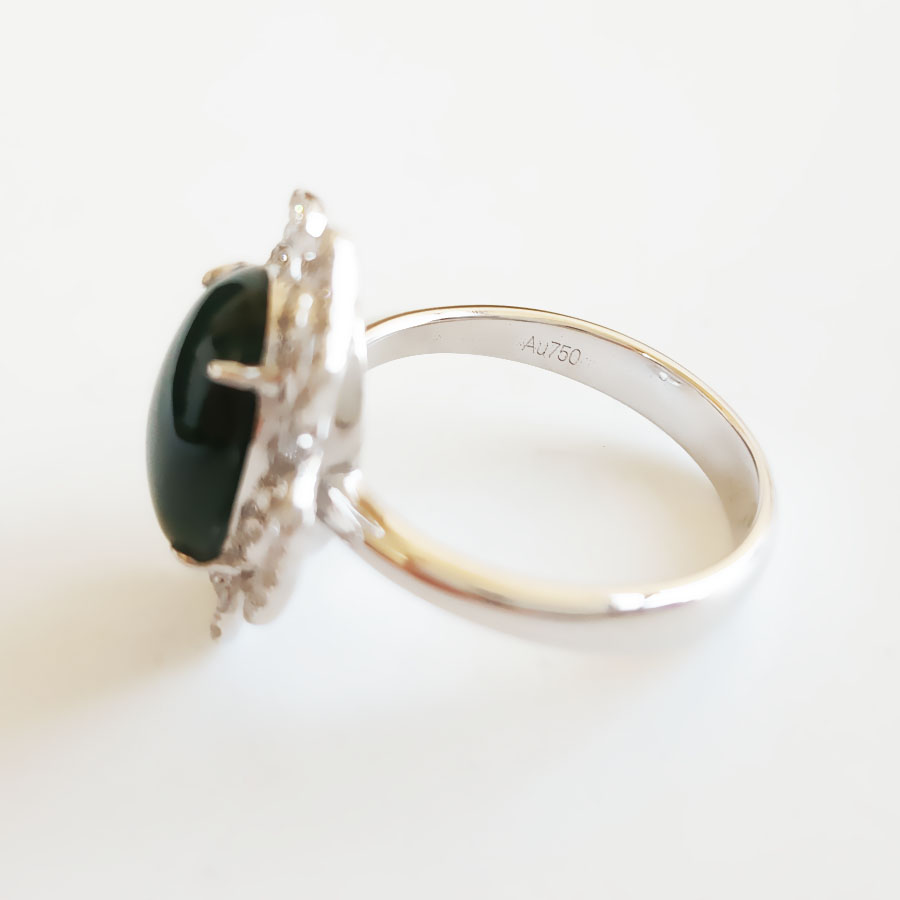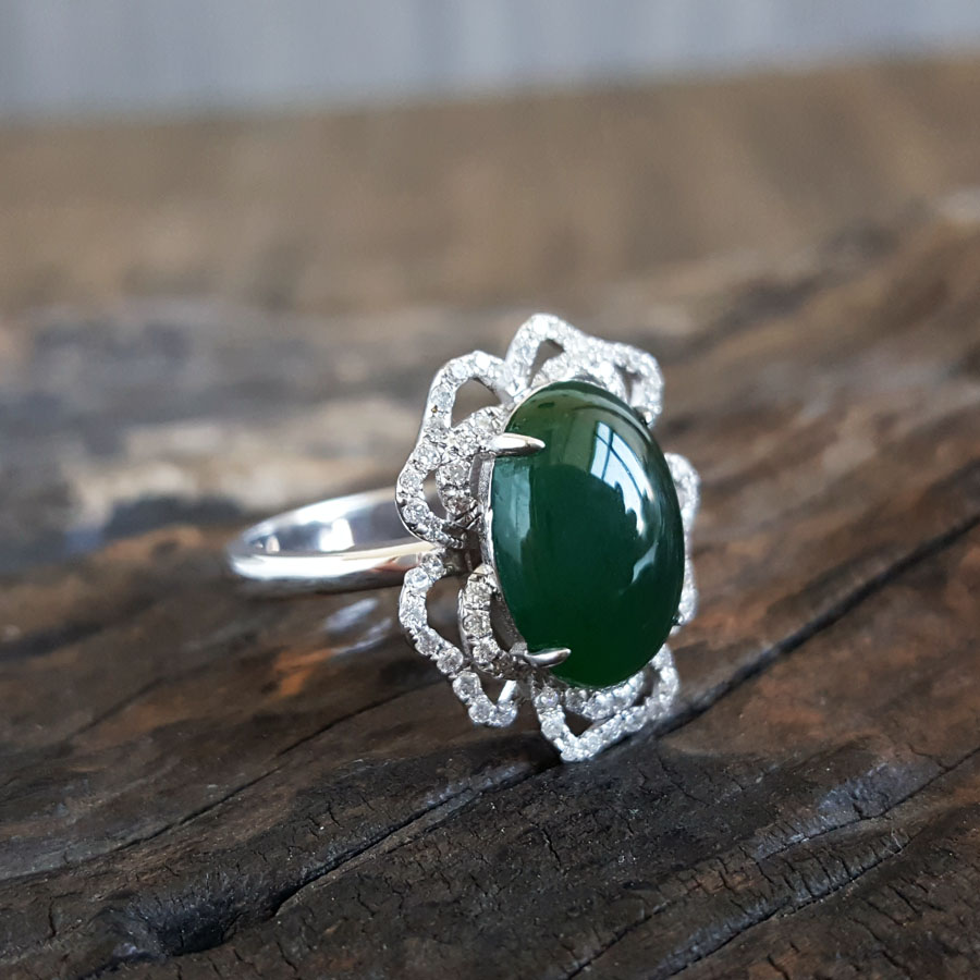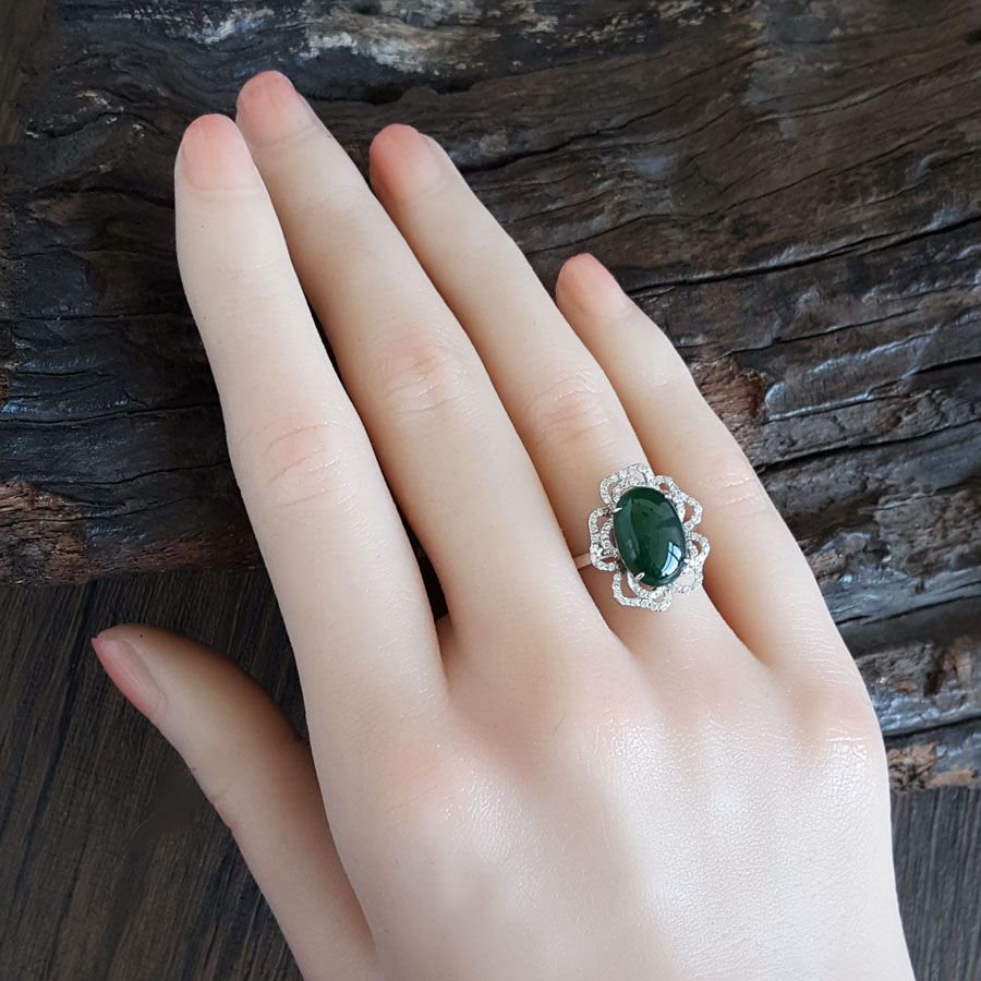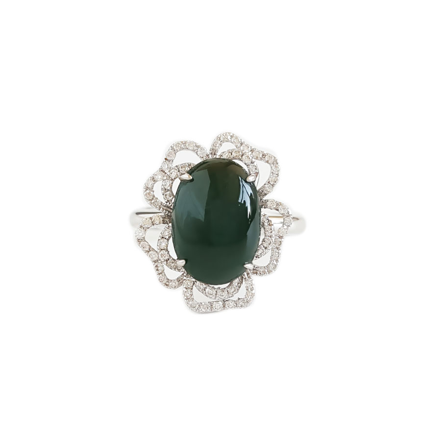 名称 | AU750白金镶钻镶天然冰种蛋面墨绿翡翠戒指 |
