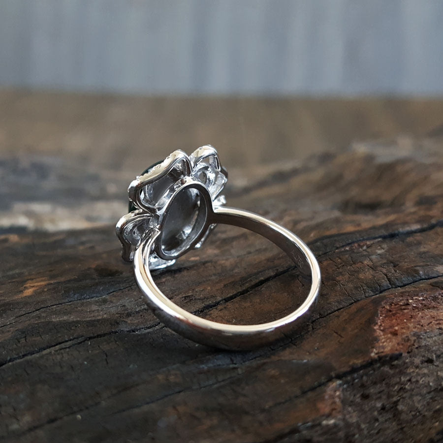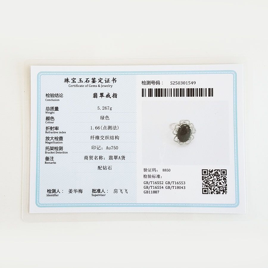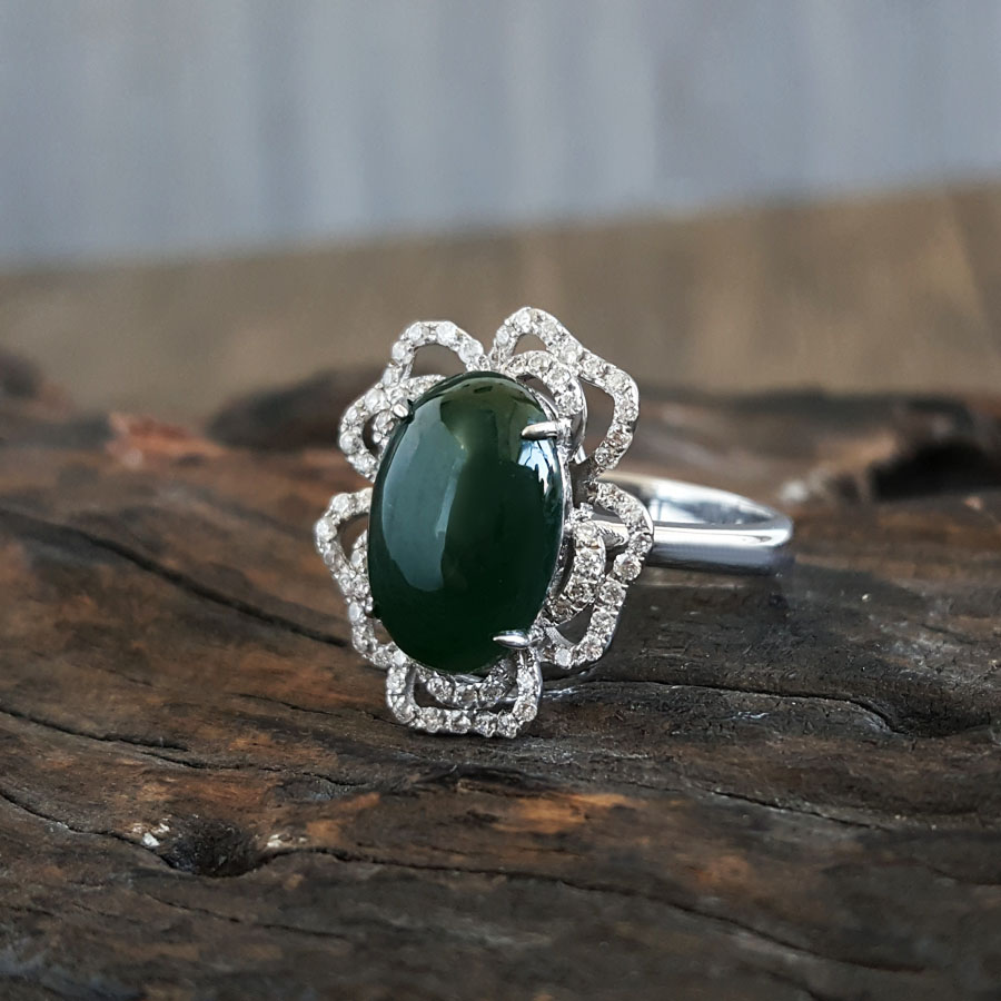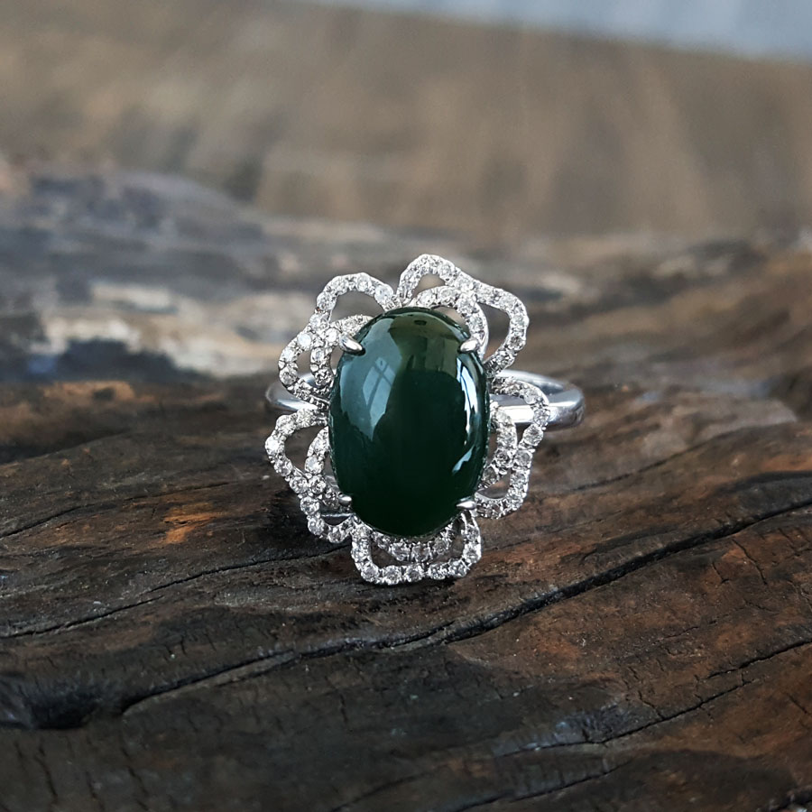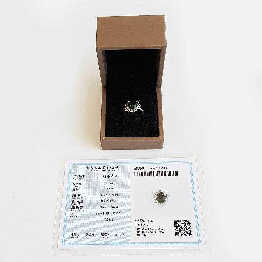 名称 | AU750白金镶钻镶天然冰种蛋面墨绿翡翠戒指 |
