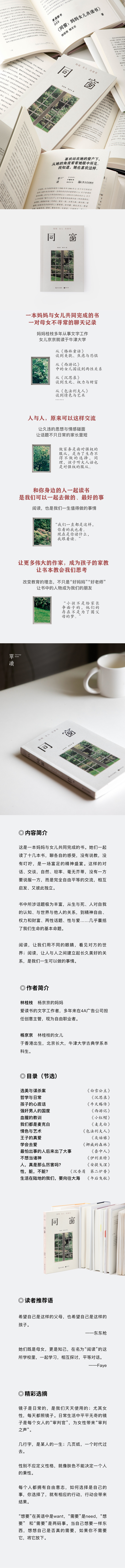 ★阅读,交流,让人与人之间建立起长久美好的关系,是我们一生值得做的事情——书,是我们心上的窗,打开它,阳光就照了进来,“文学教会我留心”;读同一本书,聊同一个话题,深入、自由,是最珍贵的情感体验。我们可能不需要再多一本文学启蒙书,也不需要再多一本讲亲子关系的理论书,但我们可能都需要一位同窗好友,能够坐在一起,畅所欲言,聊聊那些作家笔下的人物,聊聊我们正在经历的生活,像京京和桂枝一样,专注的思考,深入的交谈,让我们的心沉静、柔软;通过阅读相知相交,认识自己,也理解另一个与自己截然不同的、独立的人。