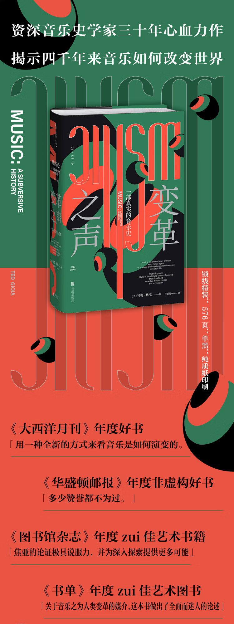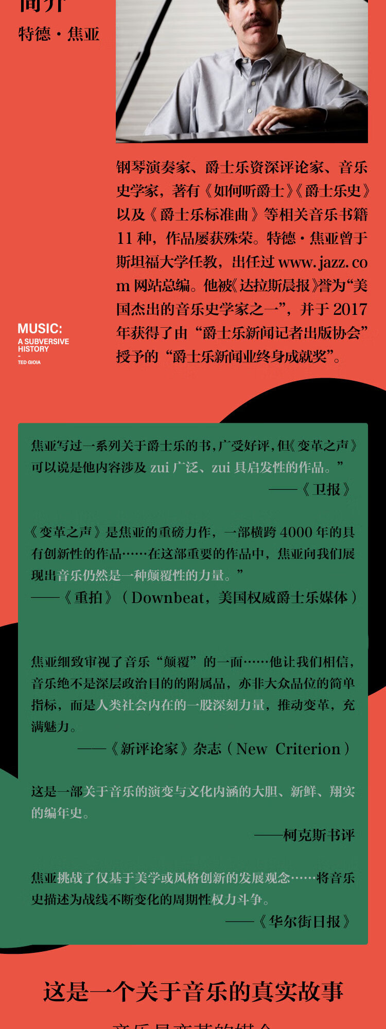 在本书中,美国屡受赞誉的音乐史学家特德·焦亚回溯了音乐四千年的发展历程,他从史前人类时代的自然声景写起,一直写到当今的真人秀、歌唱大赛和网红视频,通过广泛而细致的研究与深刻的思考,向我们展现了被掩盖的不屈真相。这是一个关于音乐的真实故事。音乐是变革的媒介,分裂的根源,也是人类生活的魅力源泉。