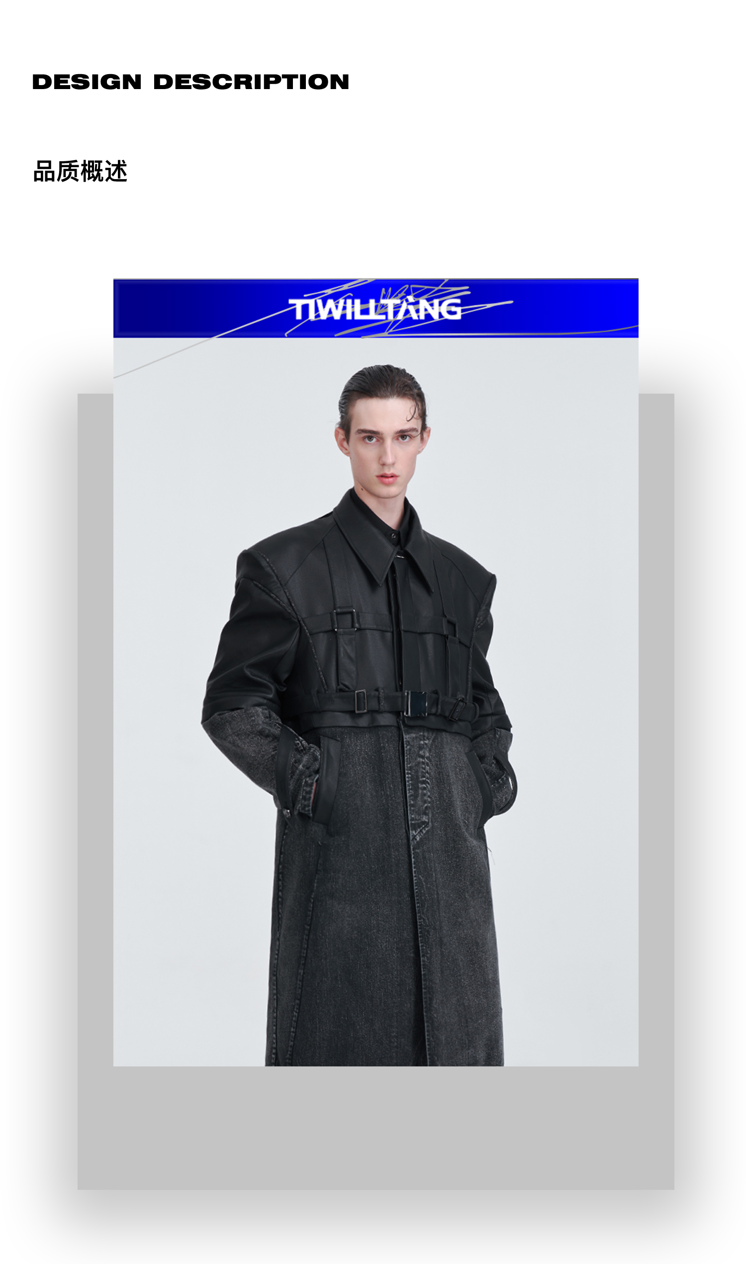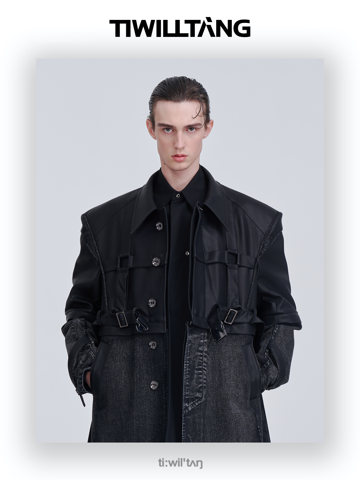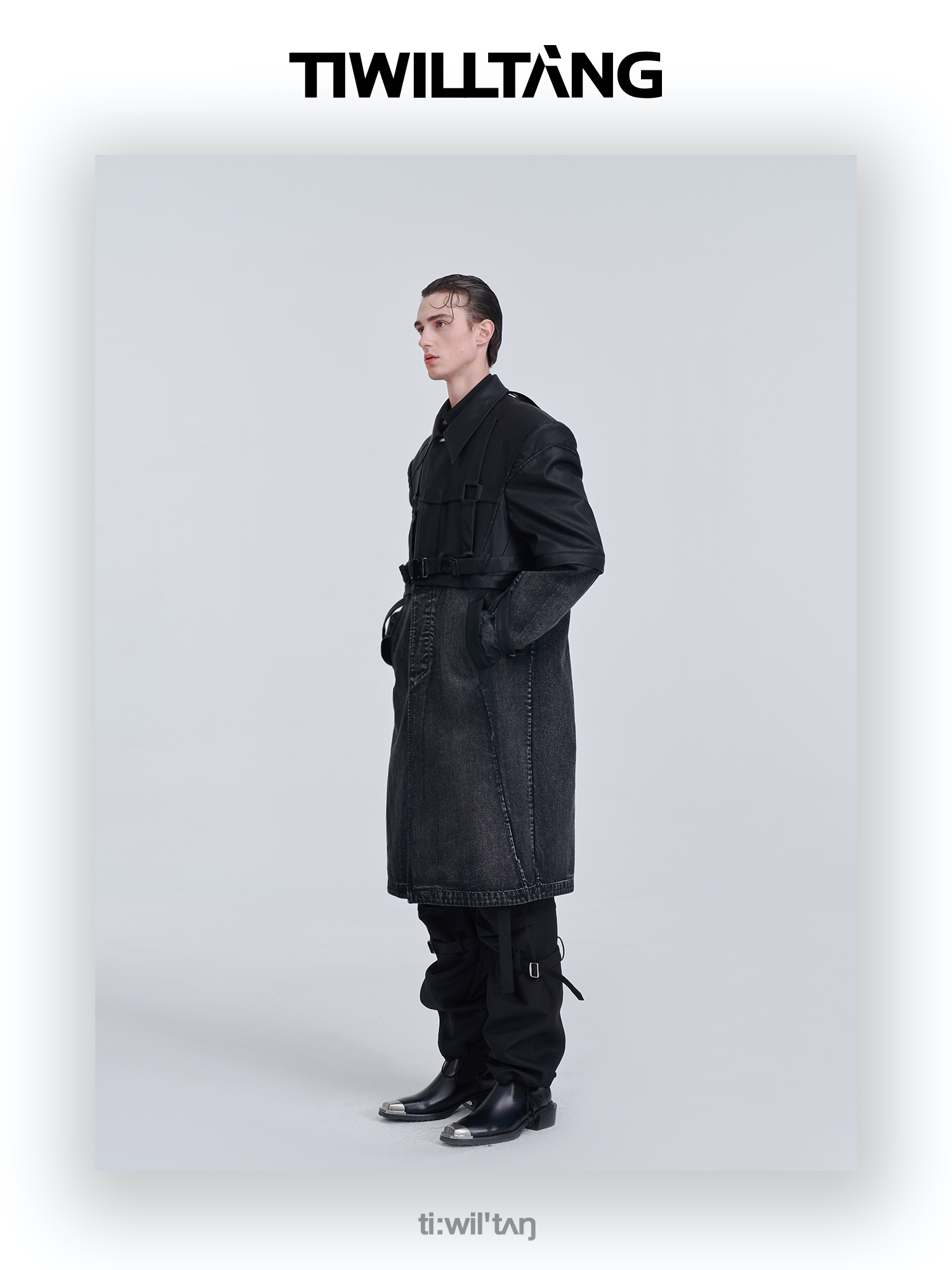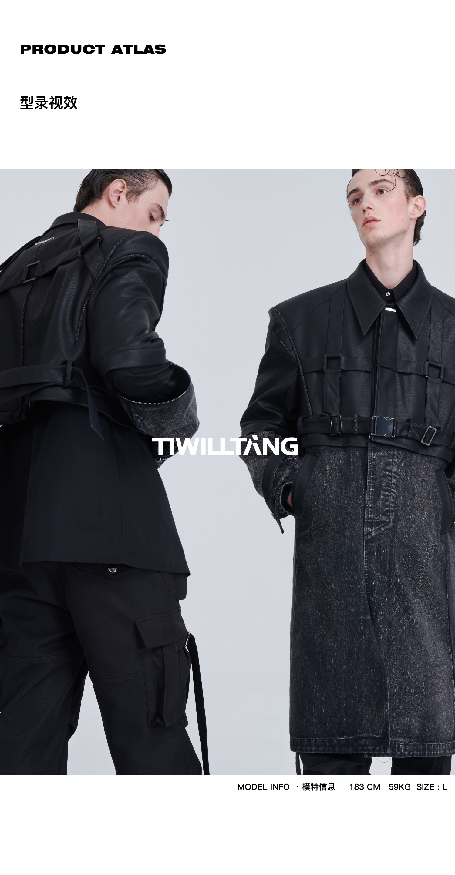 TIWILLTANG启世录“桅制宛锓”长短可拆卸牛仔拼皮绑带扣棉胆风衣