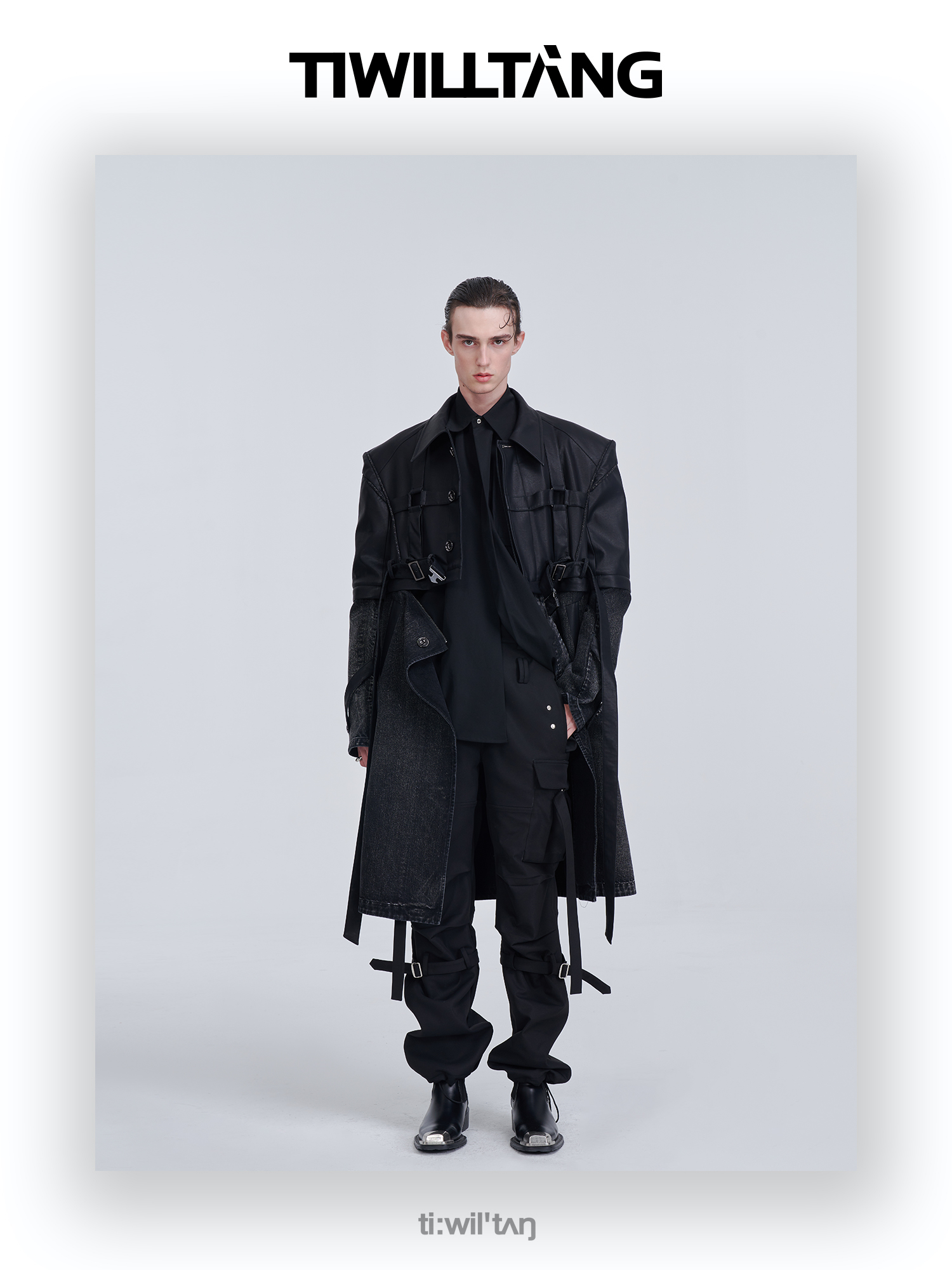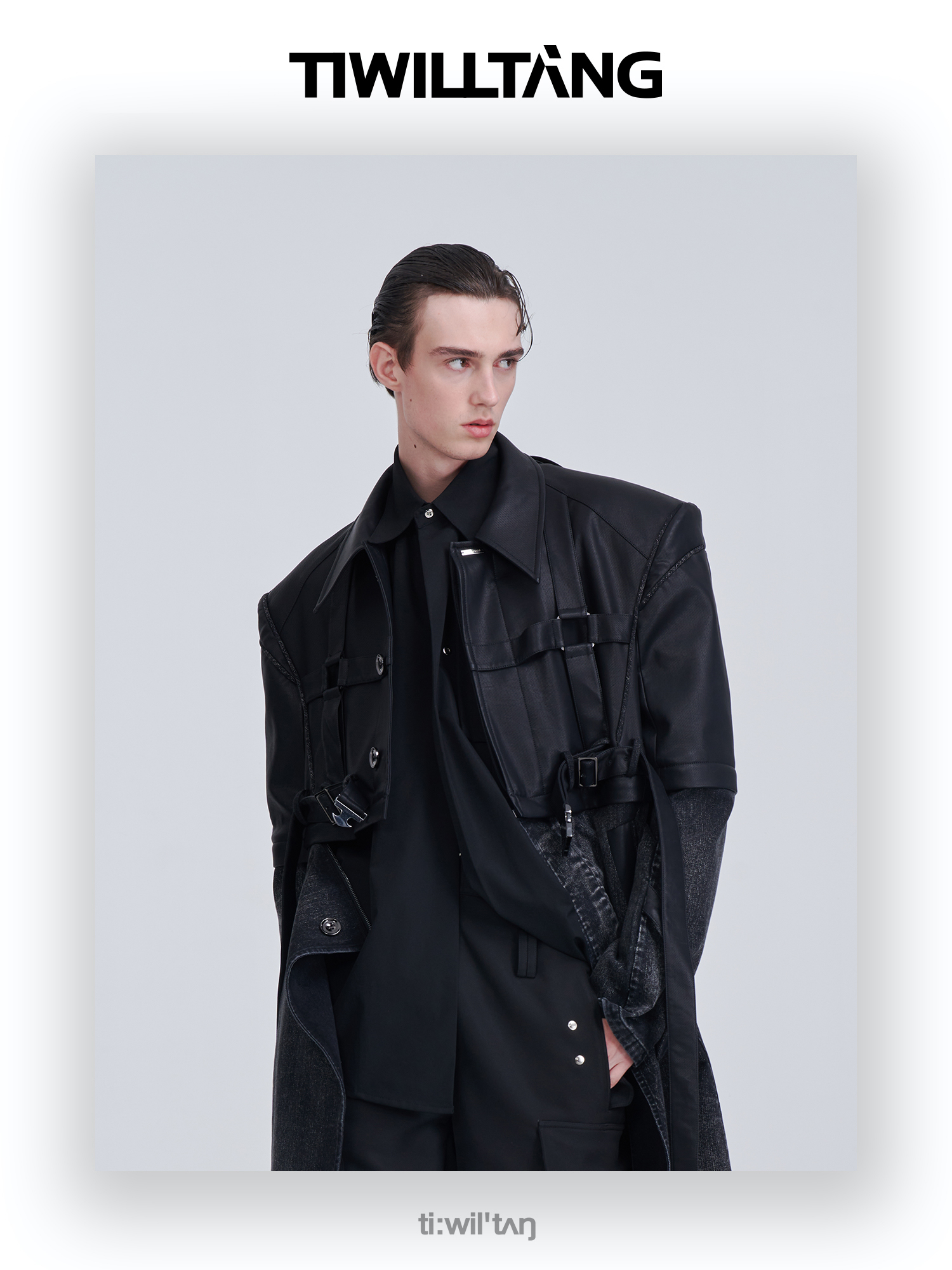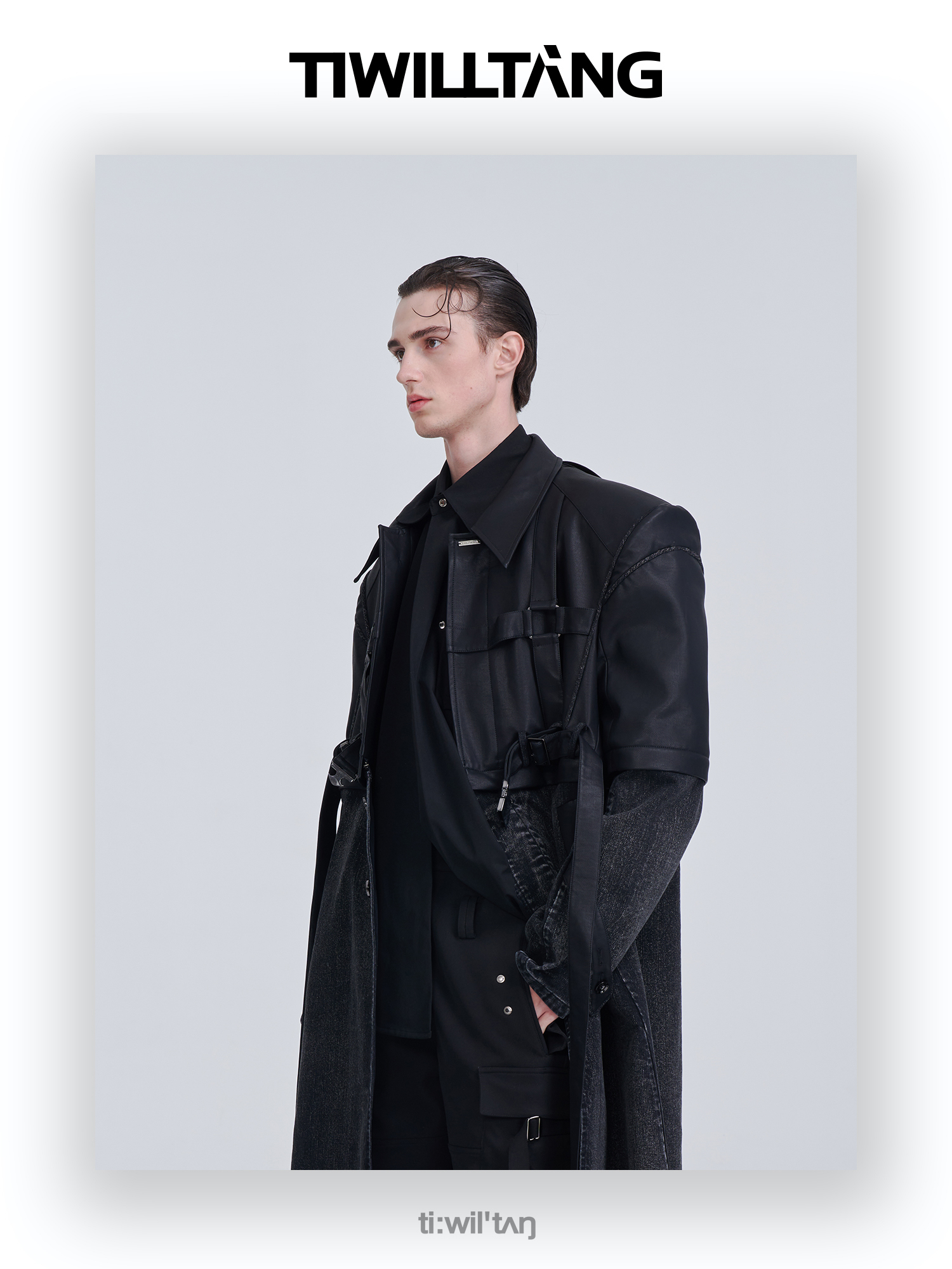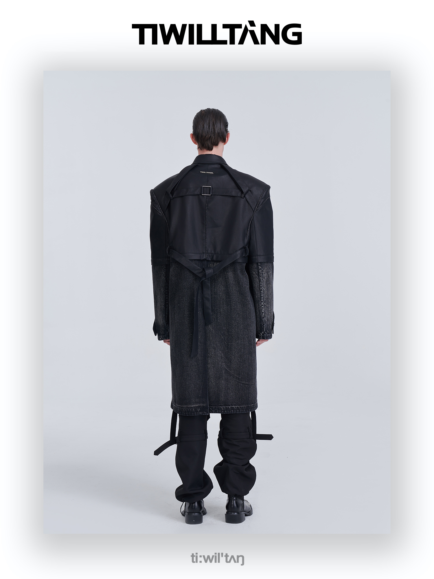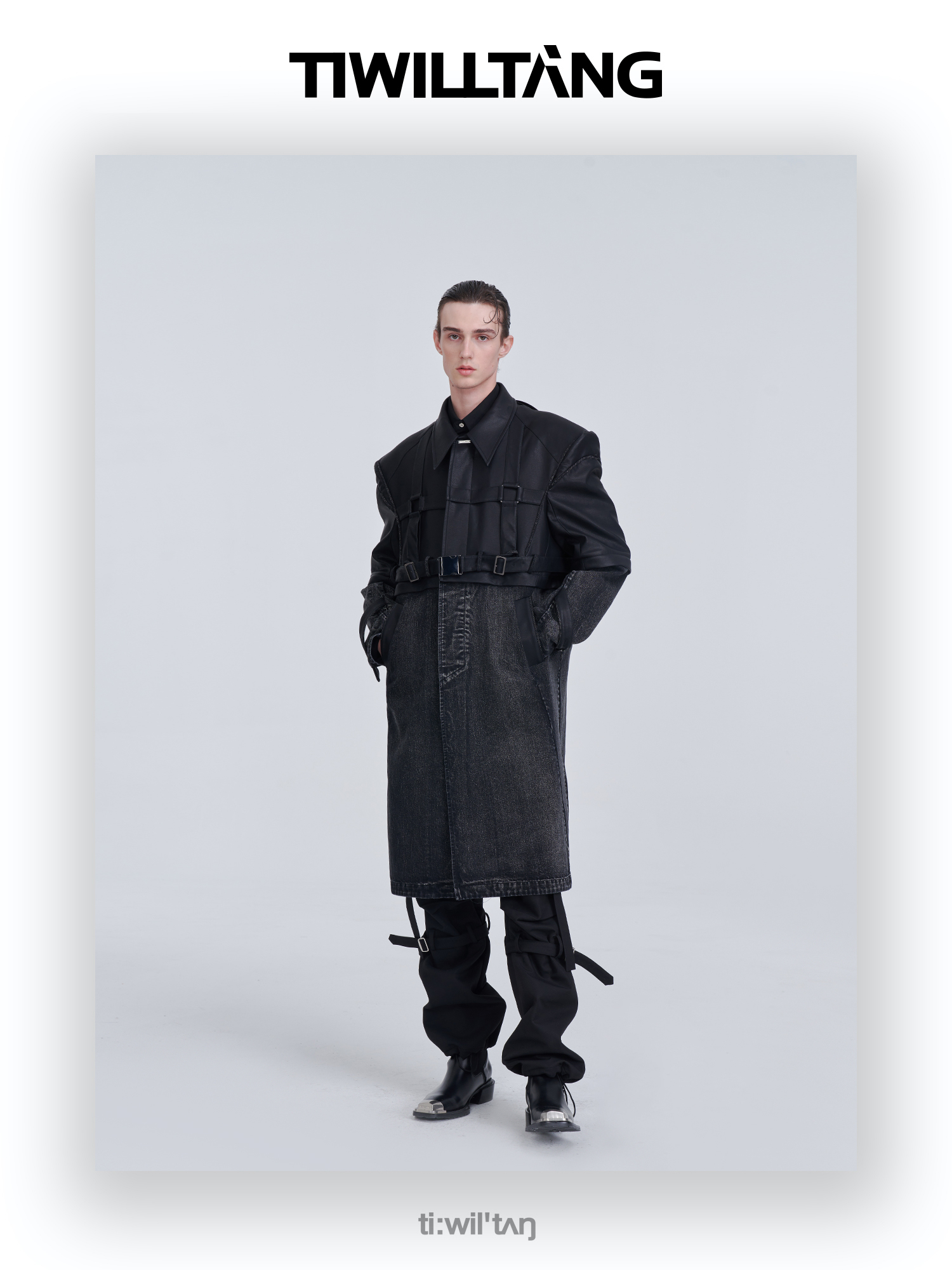 TIWILLTANG启世录“桅制宛锓”长短可拆卸牛仔拼皮绑带扣棉胆风衣