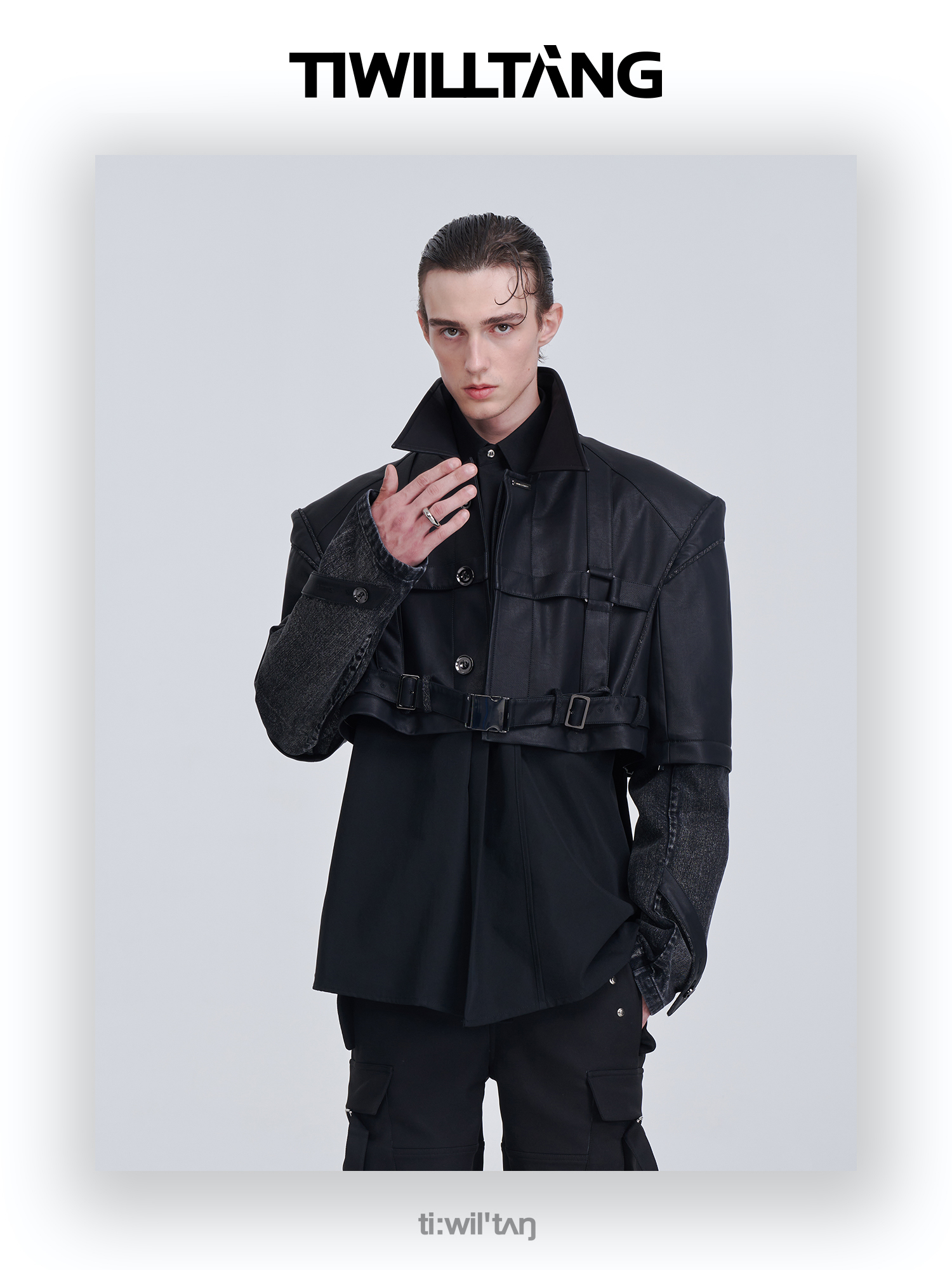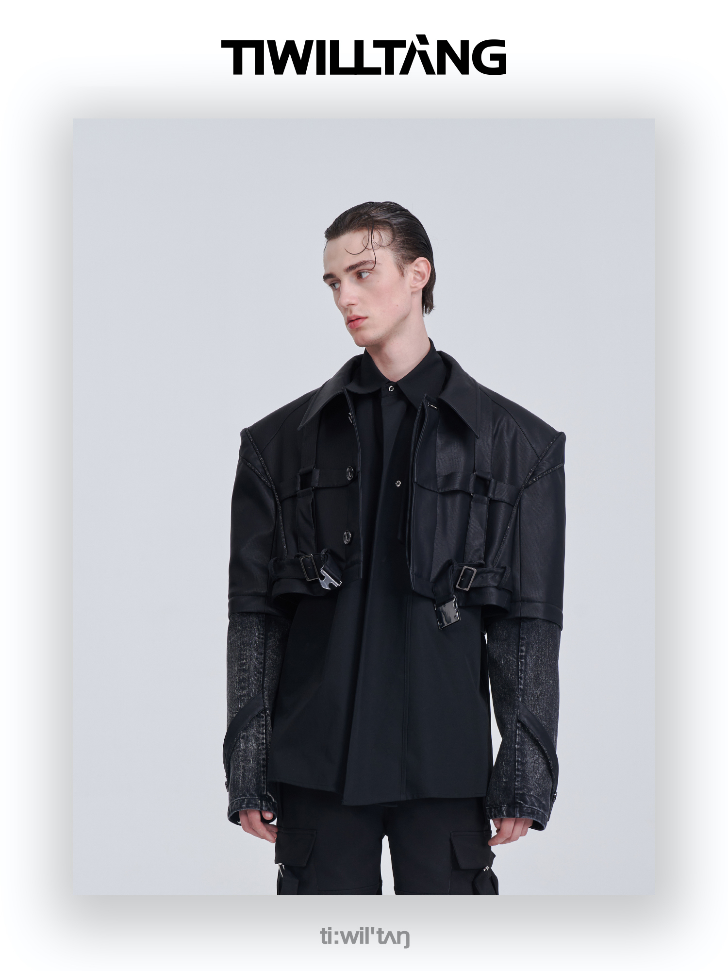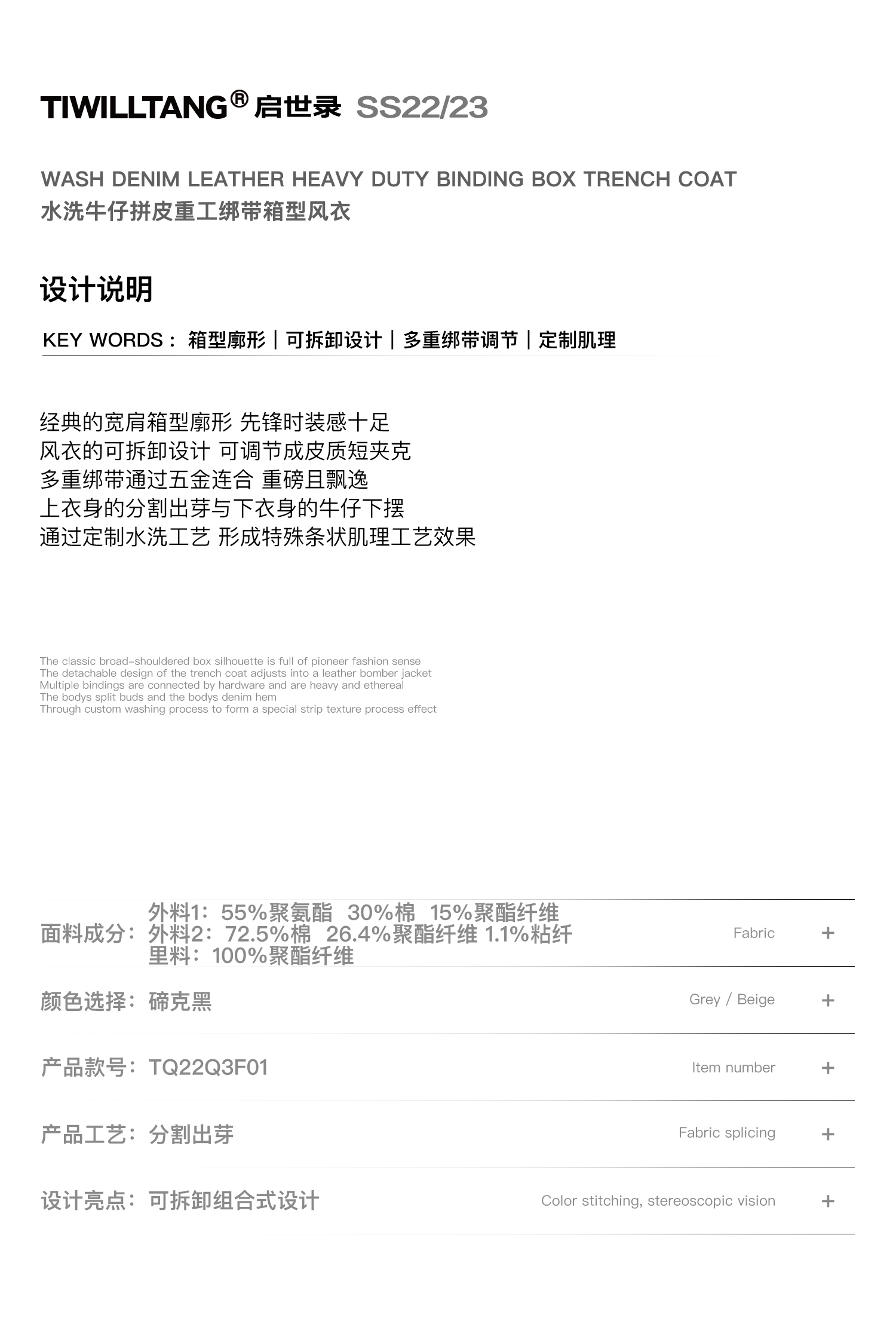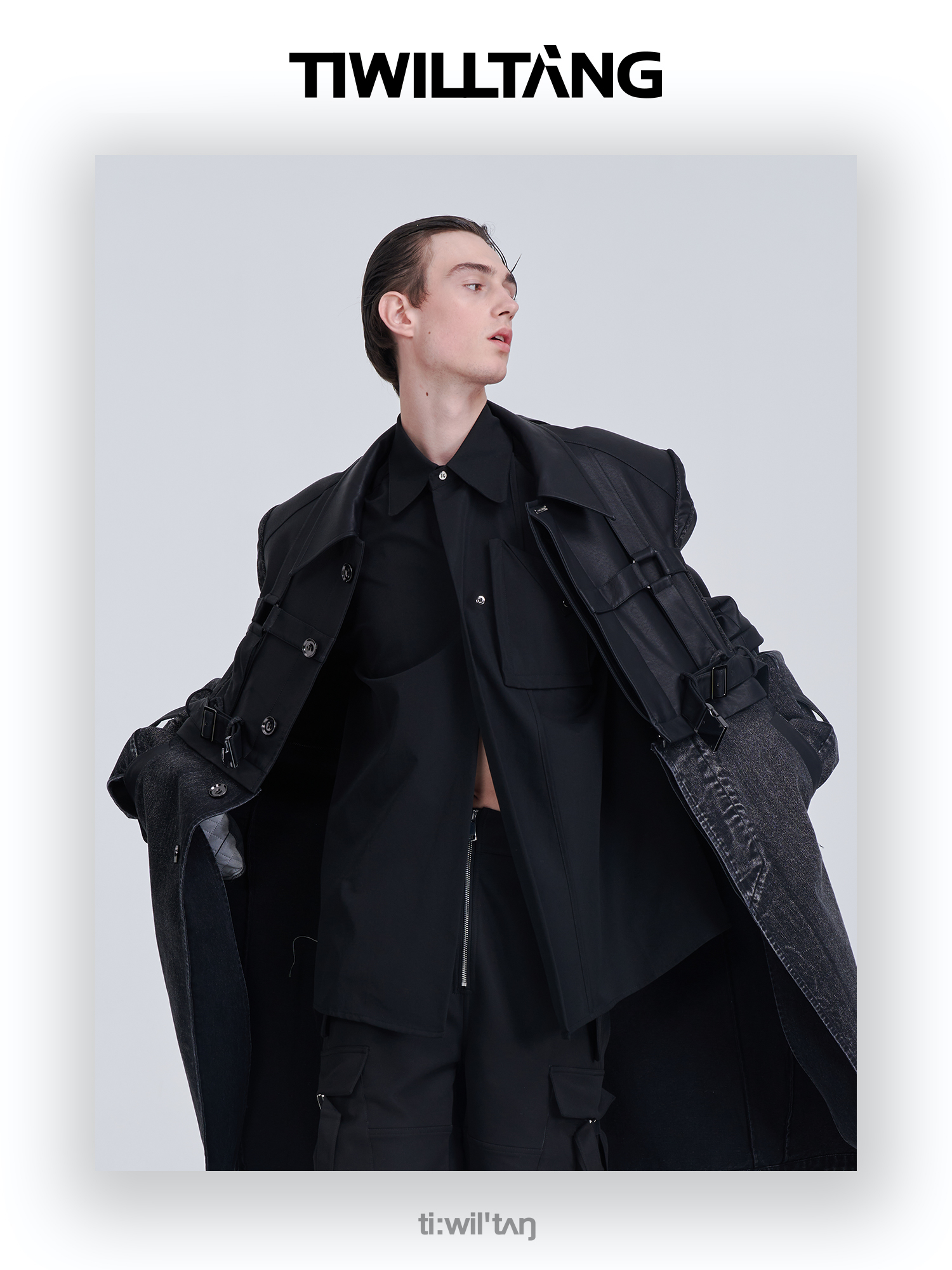 TIWILLTANG启世录“桅制宛锓”长短可拆卸牛仔拼皮绑带扣棉胆风衣