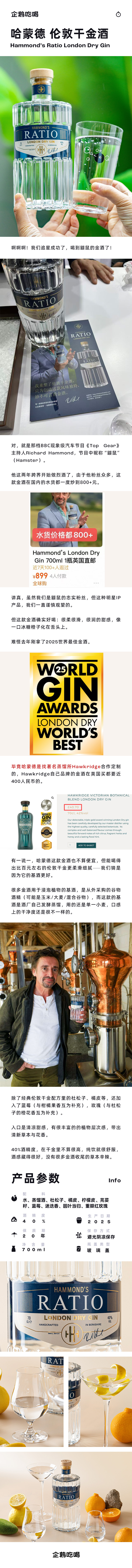 企鹅市集|英国 哈蒙德 Ratio伦敦金酒700ml 2025世界最佳金酒奖 伦敦干金 清凉草本花香