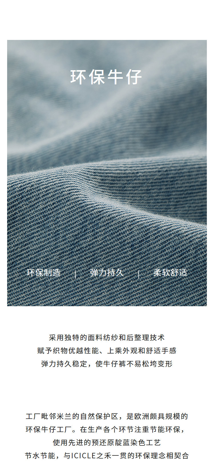 环保牛仔,采用独特的面料纺纱和后整理技术,赋予织物优越性能、上乘外观和舒适手感,弹力持久稳定,使牛仔裤不易松垮变形。